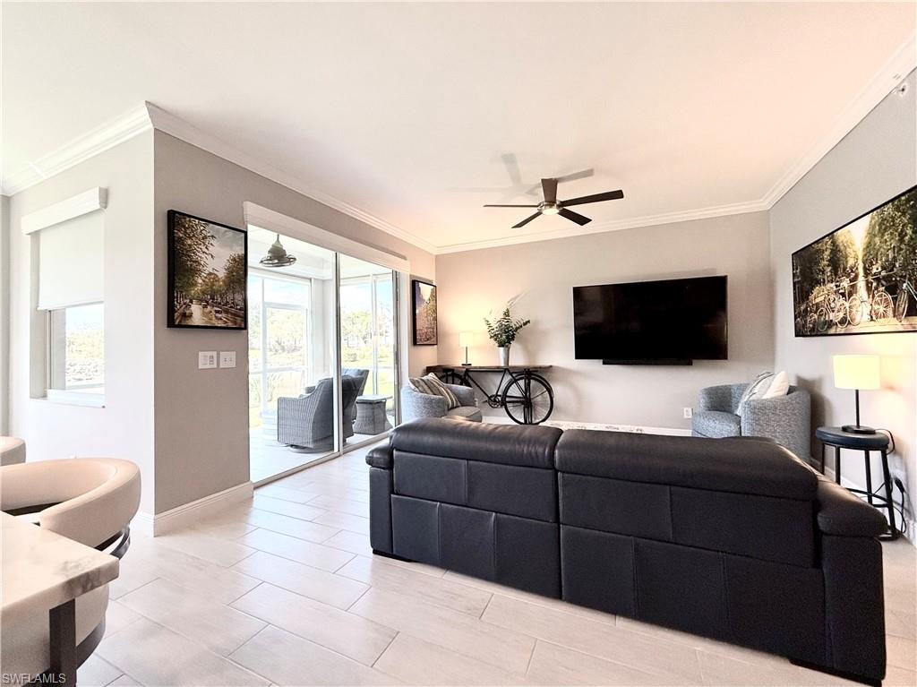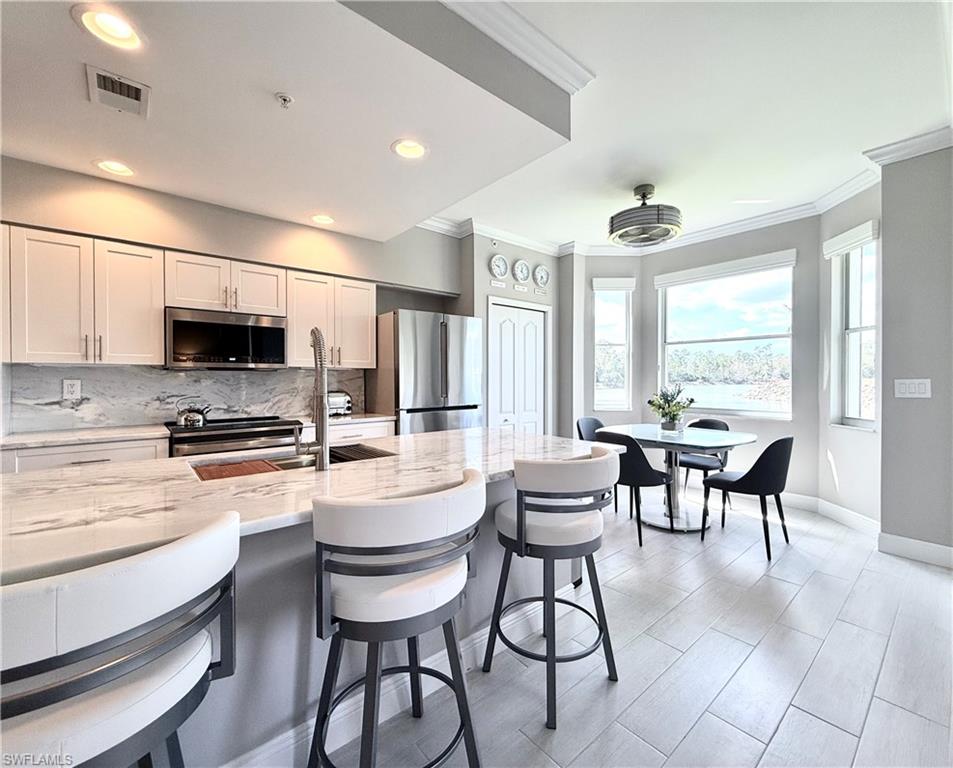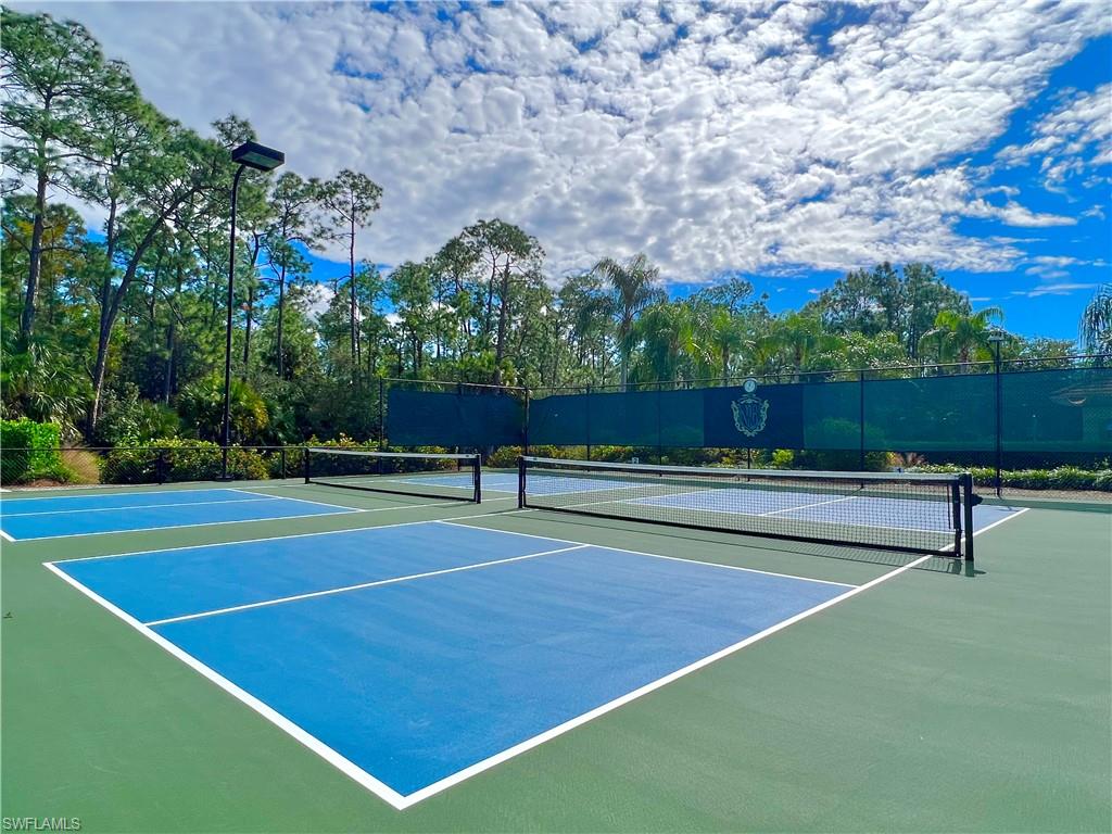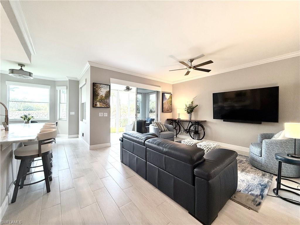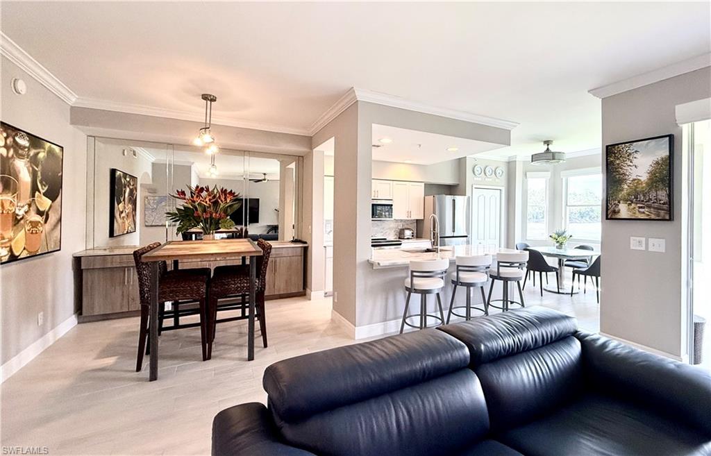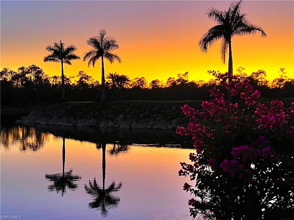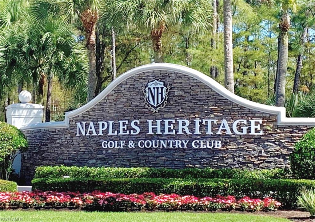 With construction costs for renovations going up this TOTALLY renovated condo is an incredible value. Located in Naples Heritage Golf and Country Club with Golf Membership included. Sellers thought of everything when they remodeled. Brookside floor plan is open concept and allows you can see water and golf from living room, kitchen and dining room. Porcelain tile plank floors throughout condo. New custom lighting and fans throughout. Condo is equipped with a FULL home water filtration system. New hot water heater. Kitchen boasts white shaker cabinetry, light granite counter tops with matching granite backsplash, large sink with work station/new fixture, new higher end SS appliances, new wine refrigerator and hidden shades on windows. Twist glass kitchen table easily extends out for 6. Flex space is set up as dining room and includes built in buffet with granite countertop along wall. Main living room has electric privacy shade across back. Furnishings and TV's throughout condo are new. LR has leather Natuzzi electric couch that reclines independently on both sides. Primary Bedroom with plantation shutters and custom walk in closet (closet has built in safe). Primary bath has update Vanity with quartz countertop, new walk in shower with custom tile, stain proof glass and frameless door. Guest Bedroom with plantation shutters and custom closet. Guest bath has new vanity with quartz countertop, high end mirror with built in medicine cabinet, and new walk in shower with custom tile and stain proof glass. Frosted glass Barn door in guest bath for privacy. Custom Laundry room has newer washer and dryer. New Lanai frame and screens recently installed on back lanai. Electric hurricane protection on windows and back screened lanai. Beautiful view of lake and golf course from back - sunsets are priceless!!! Naples Heritage is bundle golf community with 18 hole golf course, driving range, putting green, resort style pool w/ cabana, tennis pavilion, fitness center, pickleball courts & bocce ball. Just minutes to downtown Naples and beaches. Come live the Naples Heritage lifestyle.