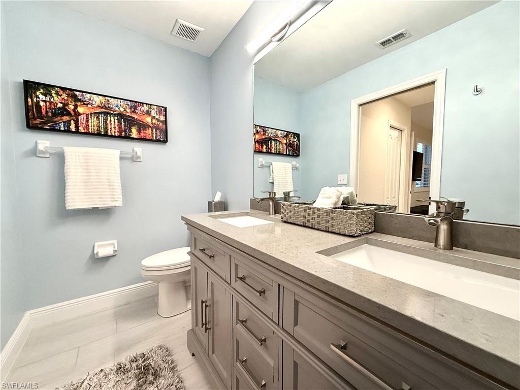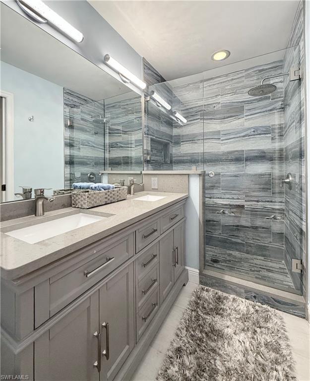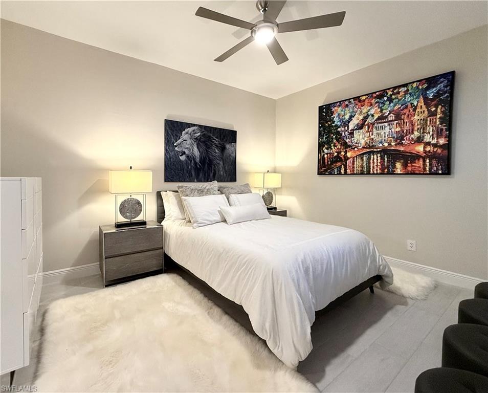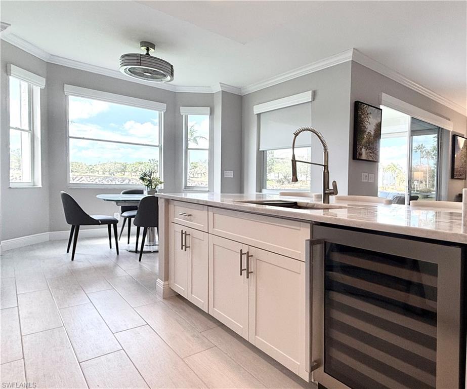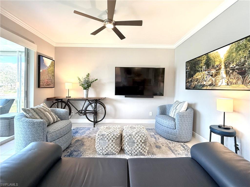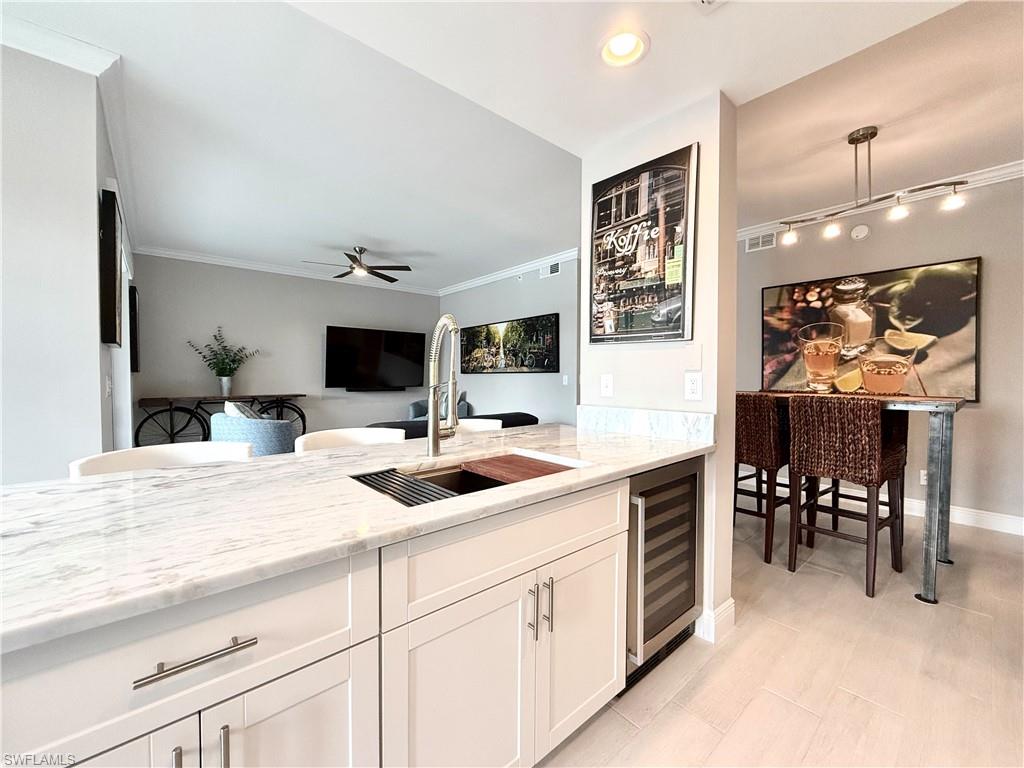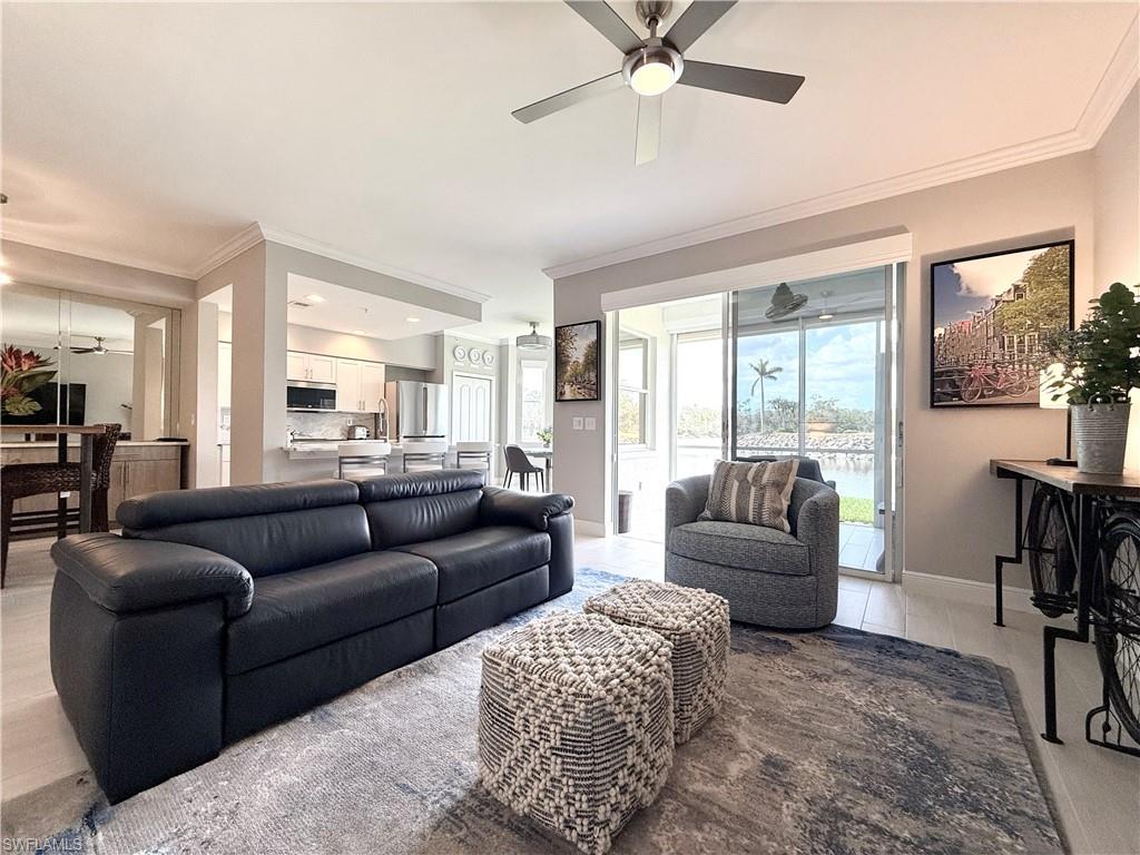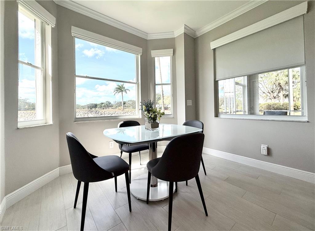 With construction costs for renovations going up this TOTALLY renovated condo is an incredible value. Located in Naples Heritage Golf and Country Club with Golf Membership included. Sellers thought of everything when they remodeled. Brookside floor plan is open concept and allows you can see water and golf from living room, kitchen and dining room. Porcelain tile plank floors throughout condo. New custom lighting and fans throughout. Condo is equipped with a FULL home water filtration system. New hot water heater. Kitchen boasts white shaker cabinetry, light granite counter tops with matching granite backsplash, large sink with work station/new fixture, new higher end SS appliances, new wine refrigerator and hidden shades on windows. Twist glass kitchen table easily extends out for 6. Flex space is set up as dining room and includes built in buffet with granite countertop along wall. Main living room has electric privacy shade across back. Furnishings and TV's throughout condo are new. LR has leather Natuzzi electric couch that reclines independently on both sides. Primary Bedroom with plantation shutters and custom walk in closet (closet has built in safe). Primary bath has update Vanity with quartz countertop, new walk in shower with custom tile, stain proof glass and frameless door. Guest Bedroom with plantation shutters and custom closet. Guest bath has new vanity with quartz countertop, high end mirror with built in medicine cabinet, and new walk in shower with custom tile and stain proof glass. Frosted glass Barn door in guest bath for privacy. Custom Laundry room has newer washer and dryer. New Lanai frame and screens recently installed on back lanai. Electric hurricane protection on windows and back screened lanai. Beautiful view of lake and golf course from back - sunsets are priceless!!! Naples Heritage is bundle golf community with 18 hole golf course, driving range, putting green, resort style pool w/ cabana, tennis pavilion, fitness center, pickleball courts & bocce ball. Just minutes to downtown Naples and beaches. Come live the Naples Heritage lifestyle.