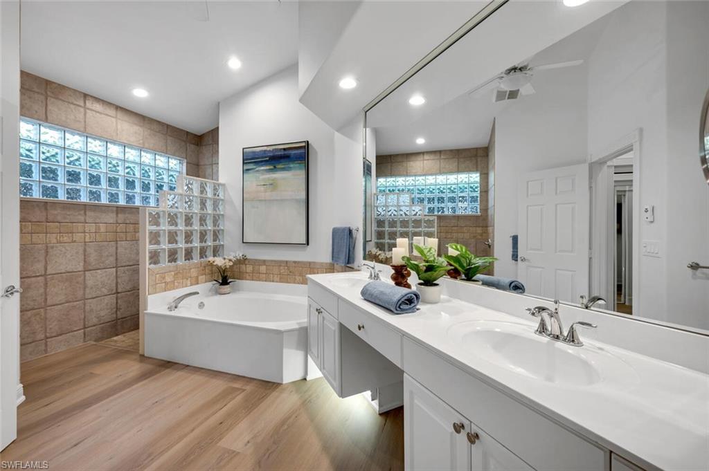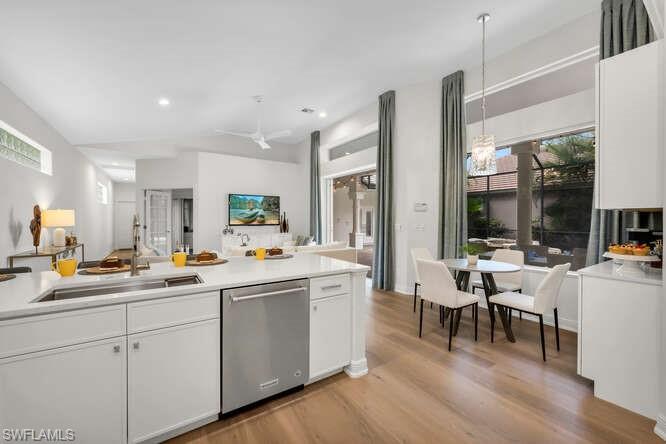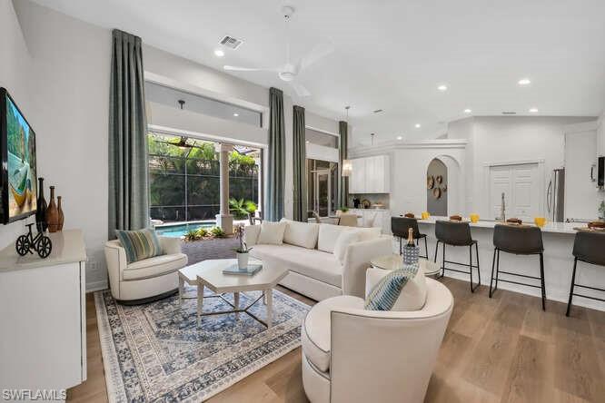 Looking for Peace and Privacy? Step through your private entrance into a tranquil courtyard oasis featuring a sparkling pool surrounded by lush tropical landscaping. Whether you're hosting friends or enjoying a quiet afternoon, this space is perfect for relaxing or entertaining year-round. Whether you prefer a formal entertaining environment or a casual entry to this charming home, every living area enjoys a view of the Resort-like freeform pool and spill-over spa. Inside this three-bedroom, three-bath home, you’ll fall in love with the brand-new chef’s kitchen, designed with both style and functionality in mind. This kitchen and coffee/wine bar are true centerpieces for family meals and social gatherings. New plank flooring. AC replaced in 2023 and roof replaced in 2018. Situated within Kensington Country Club, which is currently undergoing a massive, world-class renovation with completion in Fall 2025, this home offers the best of Florida living. The enhanced golf community amenities, include golf, tennis, pickleball, dining and social spaces.
