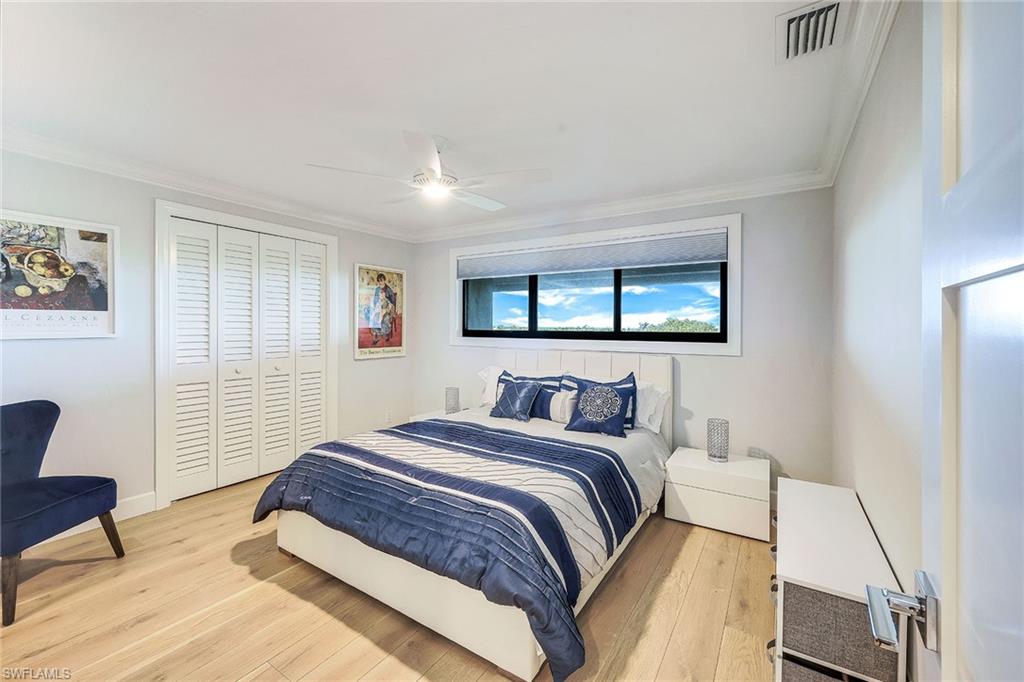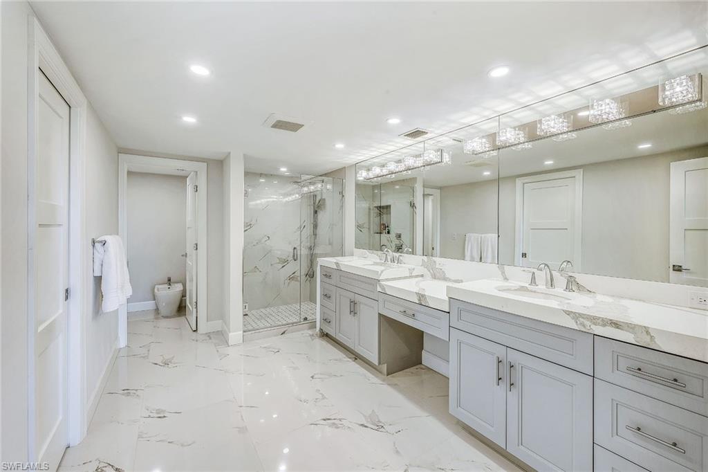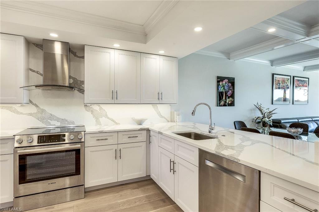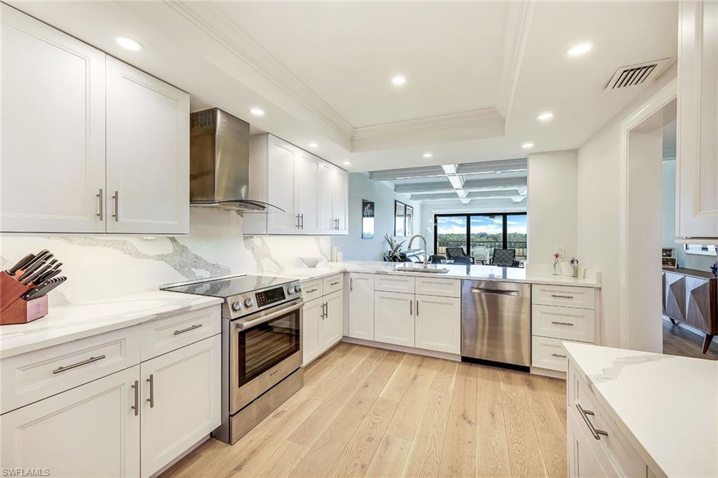 Welcome home to your exquisite, immaculately updated fourth-floor condominium in Hyde Park at Pelican Bay. You will be in paradise as you soak in the Gulf of Mexico views from the front of the residence and the sparkling lake and golf course views from your incredible, open lanai. You will instantly fall in love with the jaw-dropping, gorgeous renovations, especially the stunning hardwood flooring, marble countertops in the kitchen and baths, as well as the beautiful tray ceilings complemented with recessed lighting. The kitchen also features top-of-the-line stainless steel appliances and spectacular soft-close white shaker cabinets for optimal storage. Hyde Park is centrally located across the street from the Commons, tennis courts and Pelican Bay beach tram. Hyde Park has its own clubhouse, community pool and spa, tennis court and one of the few pickleball courts in all of Pelican Bay! Pelican Bay has three miles of pristine private beach access and two beach restaurants, a community center with a fitness center and spa, two tennis facilities and complimentary canoeing, kayaking and sailing. Club Pelican Bay offers 27 holes of golf, and separate membership required.