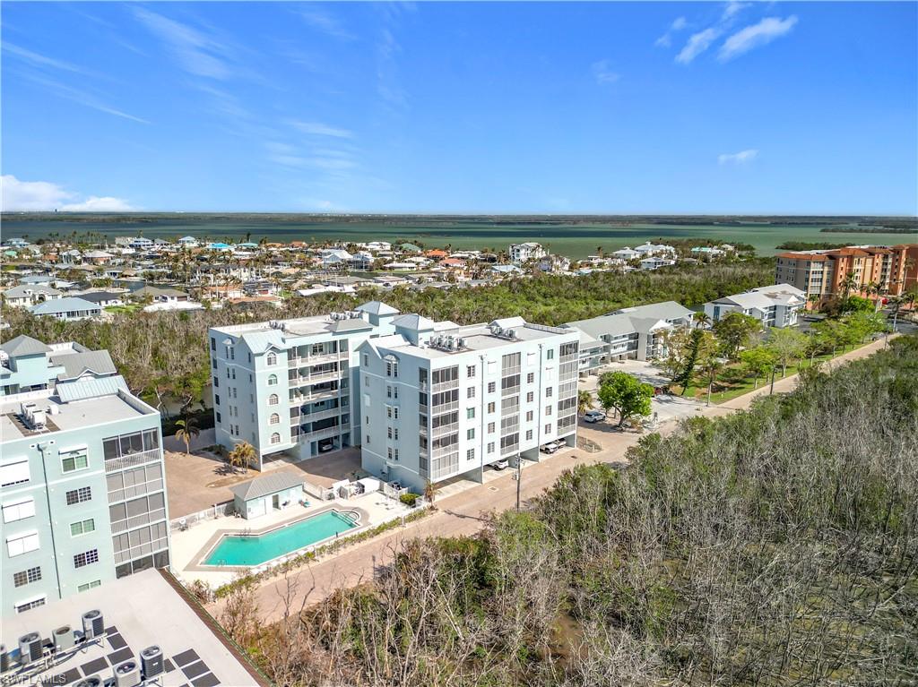 Welcome to your island getaway. Top floor Captains Bay end unit with views of the Gulf and Estero Bay. Spacious light and bright 2 bedroom/2 bath unit with a split floorplan and high ceilings. Double screened lanais, one offering views of the Gulf and an entry lanai overlooking the Bay are sure to provide incredible views and unique peaceful settings. Unit is freshly painted with new tile throughout and new kitchen cabinets. New dishwasher and disposal, AC has UV light system, W/D 2022. In unit laundry room with full size washer/dryer and laundry sink. Large master walk-in closet. Shutter on all windows and lanai. Assigned under building parking with extra storage is ideally located next to the secured lobby entry. Community is pet friendly, offering 2 heated pools, pickleball/tennis and a BBQ area. Fantastic south island location with the highly desirable “wide” white sandy beach just across the street, within walking distance to Santini plaza, easy access to Bonita Springs/Naples and a short drive to the island Publix. The unit has been lightly used with the original owners and never rented making for a great opportunity to claim your island retreat or a great investment with 2 week minimum rentals allowed. Property is furnished/turnkey which allows you to buy today and move in tomorrow.