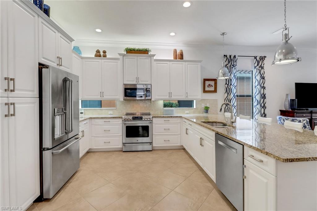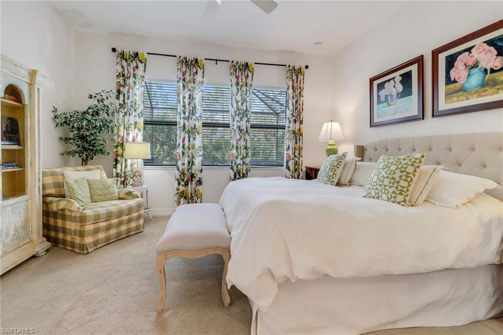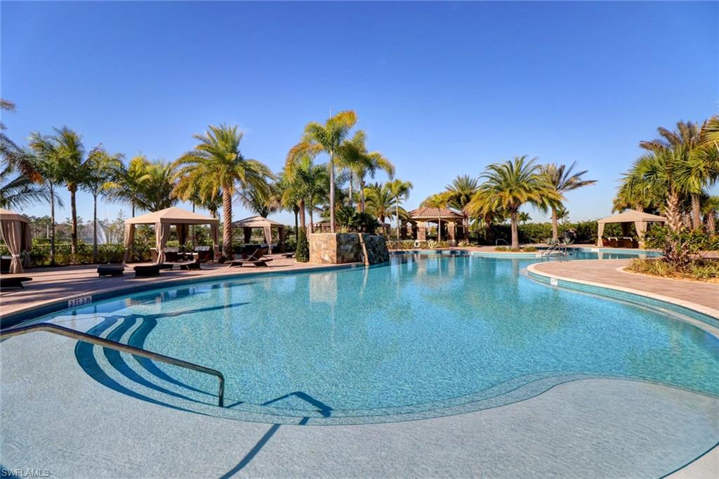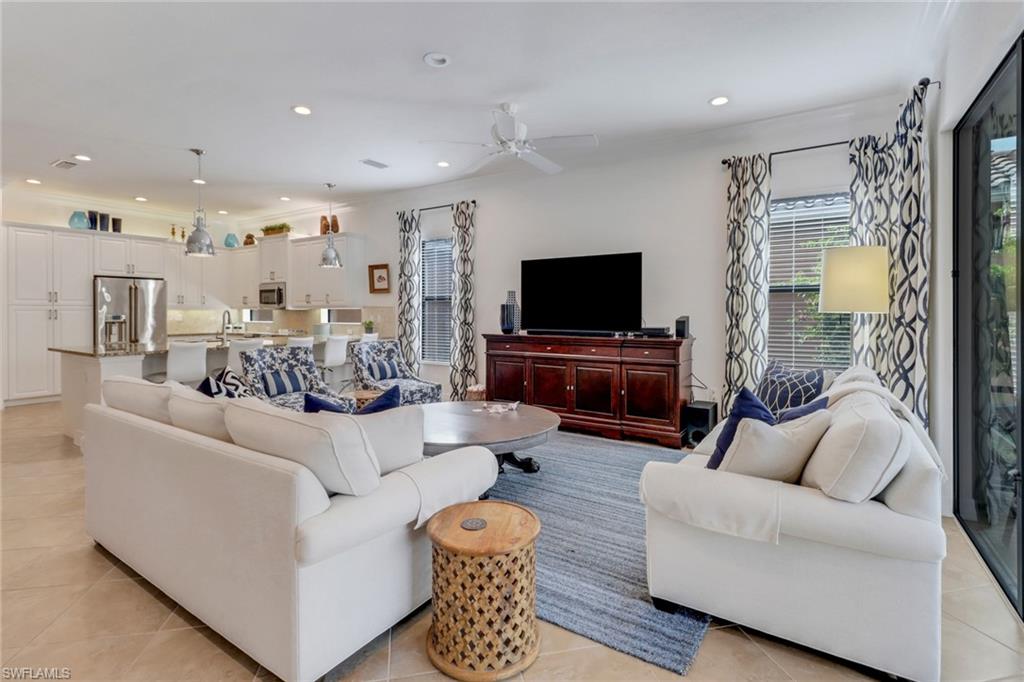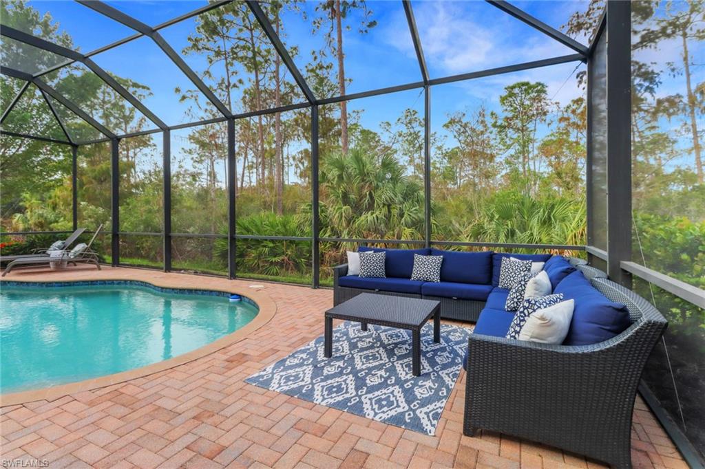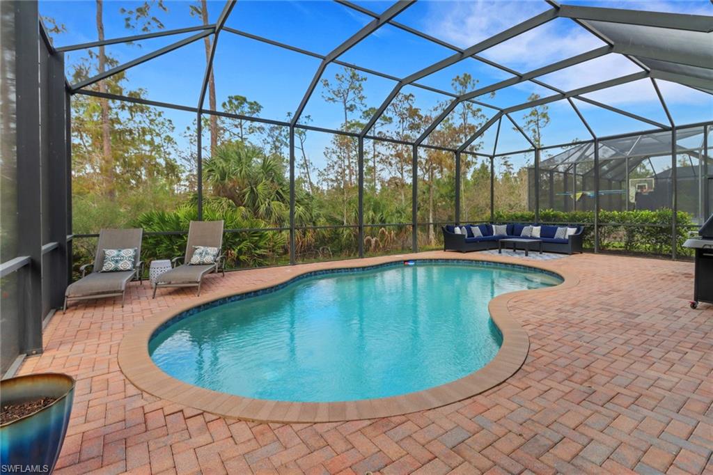 Riverstone is a sought after neighborhood with residents enjoying resort style amenities and an abundance of preserve and green spaces throughout the development. Private backyard oasis with breathtaking sunset skies for this tranquil preserve lot. Move in ready!!! Burgundy floorplan offers 2081 sq.ft of living space. Living is easy in this desirable home whether it is a vacation home or primary. Home offers 2 beds, a den, formal dining room, 2 full baths, heated pool & a 2 car garage. This home shows beautifully, open concept layout throughout the home is ideal for entertaining. Tastefully decorated, with exquisite light fixtures sparkle throughout offering plenty of light! Kitchen has stainless steel appliances, white cabinets & a large countertop which makes entertaining easy! Open to the kitchen is the living room right in style with navy blue & white cool tones, volume ceilings, crown molding & custom curtains. Laundry room is extra large with cabinets above. A sprawling lanai lanai with plenty of seating & plenty of sunshine! Items replaced are kitchen refrigerator 2025, pool heater, screen cage, garbage disposal, kitchen faucet, brand new sink in laundry room 2025. The 2 car garage offers racks and cabinets. Riverstone is a wonderful community location is great easy access to Bonita ! Amenities include, tennis, pickle ball, indoor basketball, billiards, exercise room, bike & jog path, clubhouse & resort style pool, lap pool, community room and billiards.