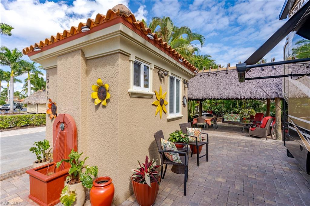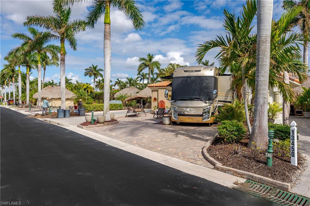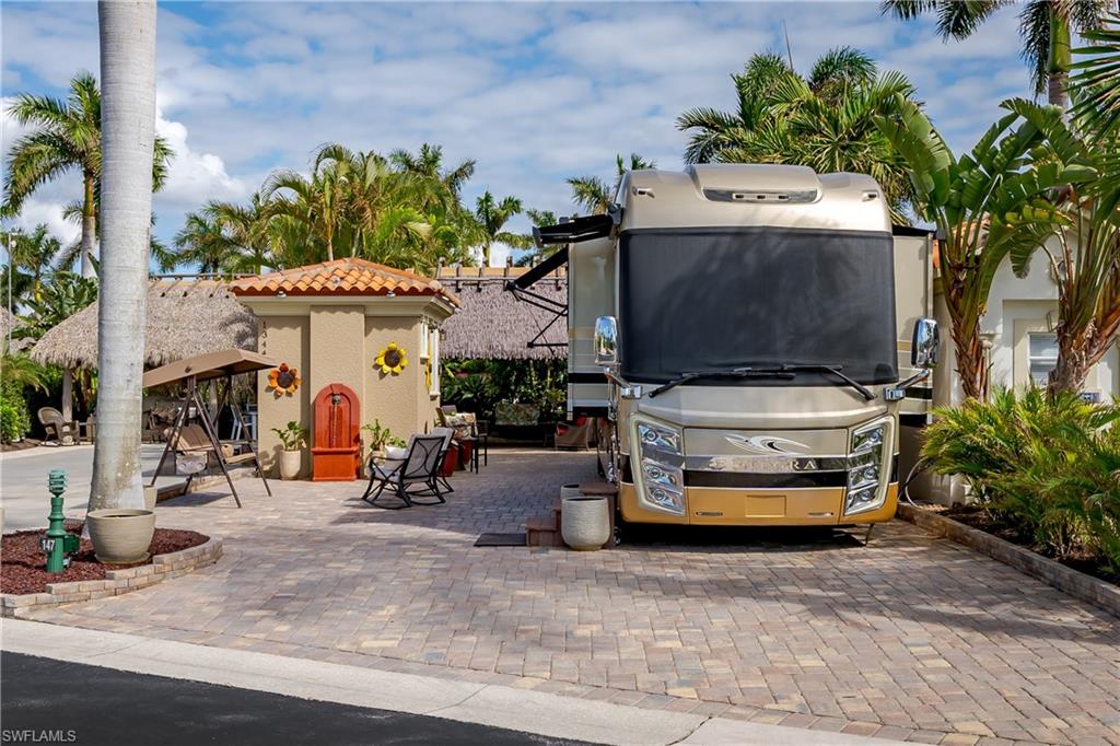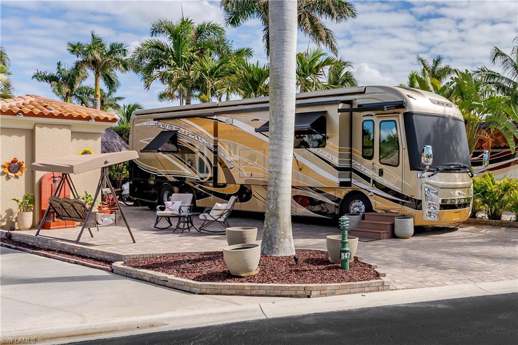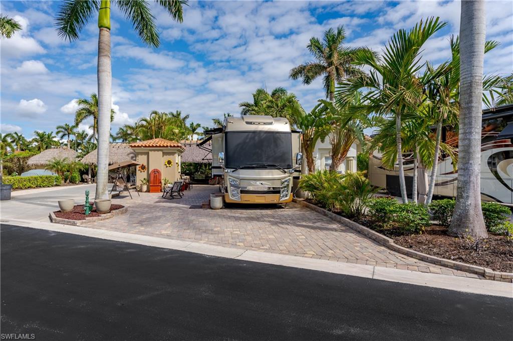 Lot 147 - Welcome to the beautiful gated community of Naples Motorcoach Resort! As you approach the gate you are welcomed by the beautiful flowers and fountains. Once the gate opens you are facing a magnificent fountain and landscaping that fronts the circle drive for the clubhouse. You turn left and then immediately right and head to your oasis. You back your coach into your beautiful tropical paradise. After you set up your coach you immediately go outside and go under your tiki and relax. You feel and hear the beautiful breezes as you look at your most amazing landscaping. You decide to invite friends over this evening and share in your beautiful oasis. You head to your well appointed casita and decide a martini tasting is in order for the evening (well you are the martini expert..). You make a few different types of martinis and put them in the fridge. You now assemble a few charcuterie boards for friends to snack on. Now that is complete, you realize you have some time, so you head over to the main pool and clubhouse. Thanks to your superb location, this is a short walk. After your swim, you have a quick sauna and shower, you have invited more of your friends over that had happened to be at the pool as well. You walk back and bring the goodies from the casita to your tiki. Your significant other played pickleball (just on the far side of the main pool area) while you swam and invited more people. No worries here, with all of the seating areas and the way the property was designed it was made for entertaining large crowds, best of all you never feel crowded.. You have an entertainers dream property. Once everyone has left you sit under your tiki, taking in the beautiful breezes and the flowers aroma and realize once again how fortunate you are to not only enjoy this paradise but share it with friends. Naples Motorcoach Resort is a Class A only resort and boasts a beautiful infinity pool, spa, exercise room, men and ladies' saunas, pickleball courts and a catering kitchen that owners can use. A clubhouse for events that are sponsored by the resort or you can reserve for your own gathering. Two satellite pools each with a spa their own rest rooms and a laundry room. We can't forget your furry best friend; the resort also has a dog park! Perhaps the most unique feature is that this is the only Class A Resort in Naples with it's own (inside the gates) gulf access via the community boat ramp. Don't have your own boat? No worries.. take one of the community kayaks and explore the area, head to the gulf, stop at one of the islands and admire the wildlife. The options are endless in this paradise..... Call today and make your dreams a reality.