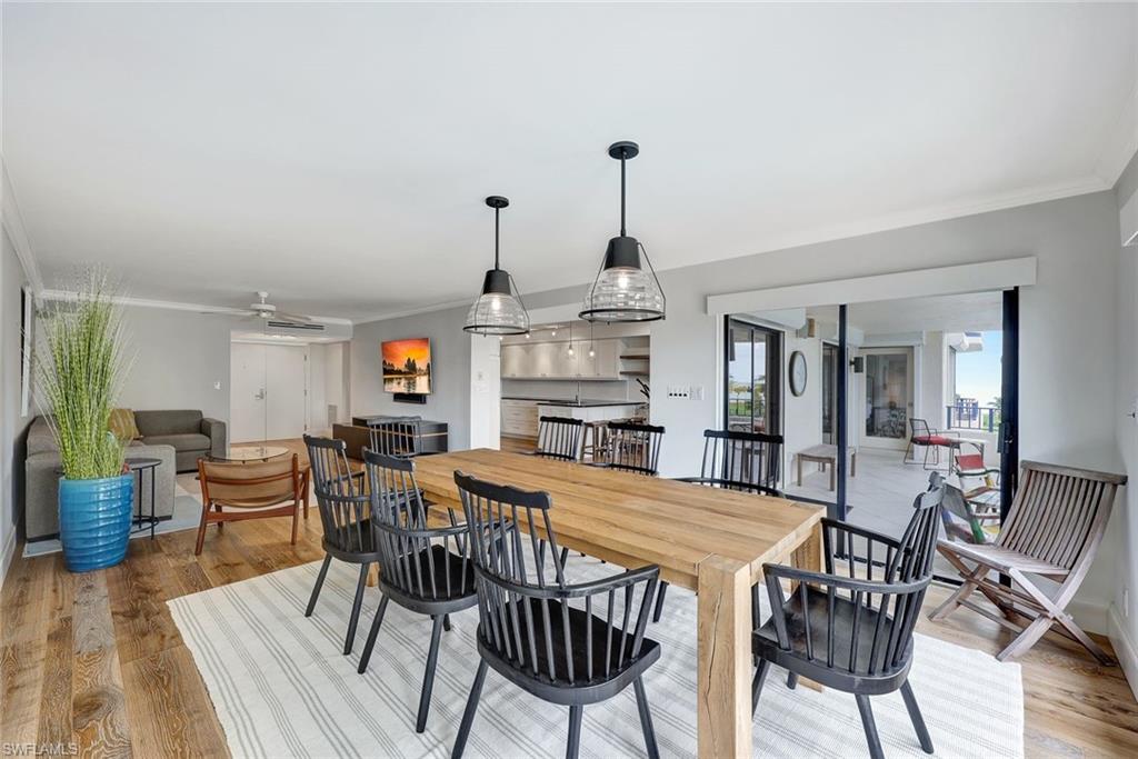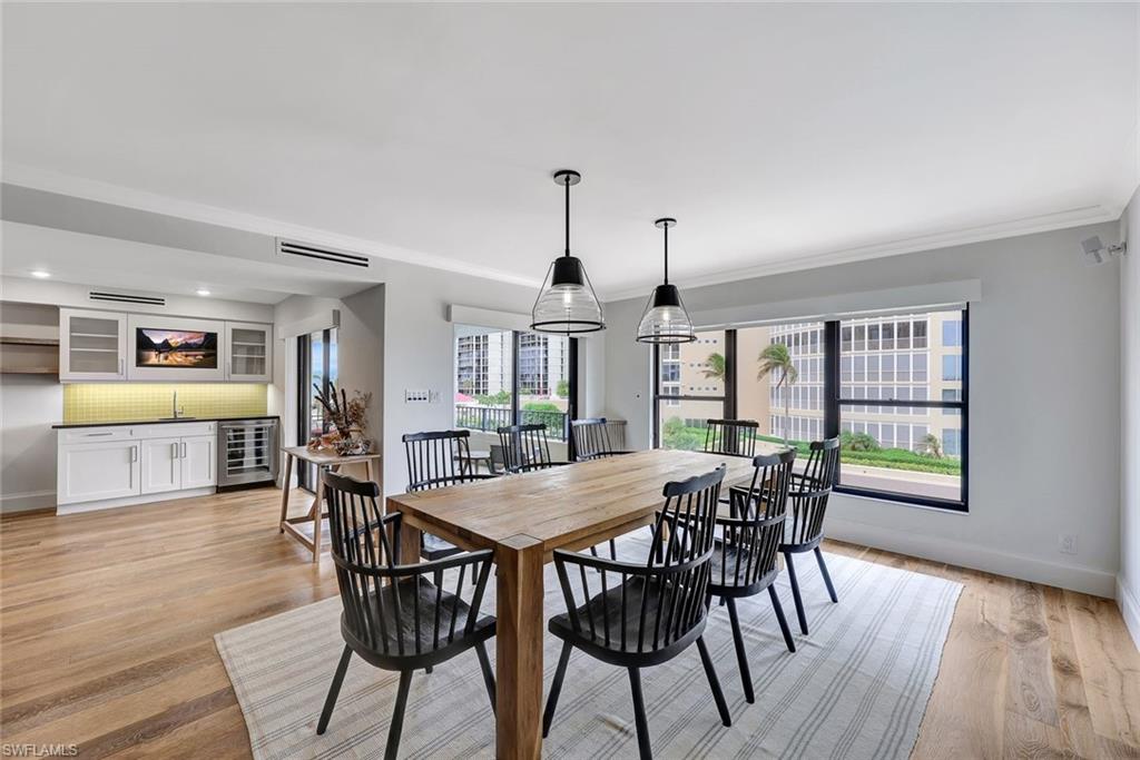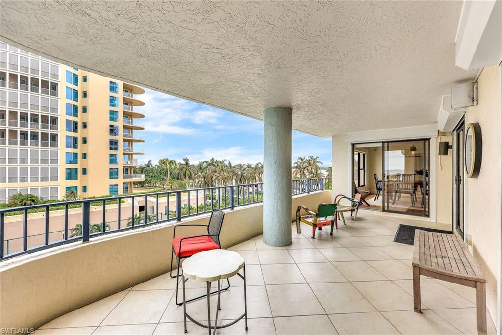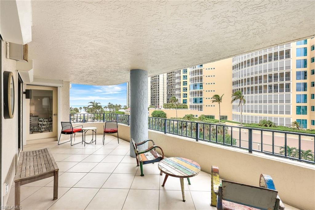 Wow! With a wide central balcony and breathtaking Gulf views this FULLY FURNISHED fifth-floor condo offers over 2000 square feet of living space! As you enter the foyer you'll be welcomed by REAL WOOD floors throughout. The 31-foot living/dining room is open to a thoughtfully designed kitchen complete with a beverage bar, spacious breakfast area and counter island perfect for entertaining. Several sliding glass doors offer direct access to the enormous balcony so you can enjoy the beautifully painted sunset skies over the Gulf. The oversized primary bedroom suite includes a beautiful bath, ample closet space and additional access to the balcony. A large secondary bedroom suite and a converted room to an office make this 06 floor plan so comfortable for every day living. Solamar has a gulf-side pool and spa, outdoor grilling area, extra storage, fitness room, guest suites, tennis and pickle ball courts, shuffleboard, vehicle wash area and the Park Shore promenade, a private 1.3-mile paved path to stroll along the beach. Have peace of mind with garage parking, underground utilities and 24-hour lobby staff. Owners can have a pet under 30 pounds and lease two times per year with a 90-day minimum. Boaters can buy or lease a slip from Venetian Bay Yacht Club and after a day on the water, walk to the renowned dining and shopping at Venetian Village down the street. One of the best built properties in Park Shore you can also be confident knowing Solamar sustained no damage from recent storms, there are no upcoming assessments, and the building is in solid financial standing. This home is being sold "turnkey", so you can move right in and enjoy the Naples lifestyle!