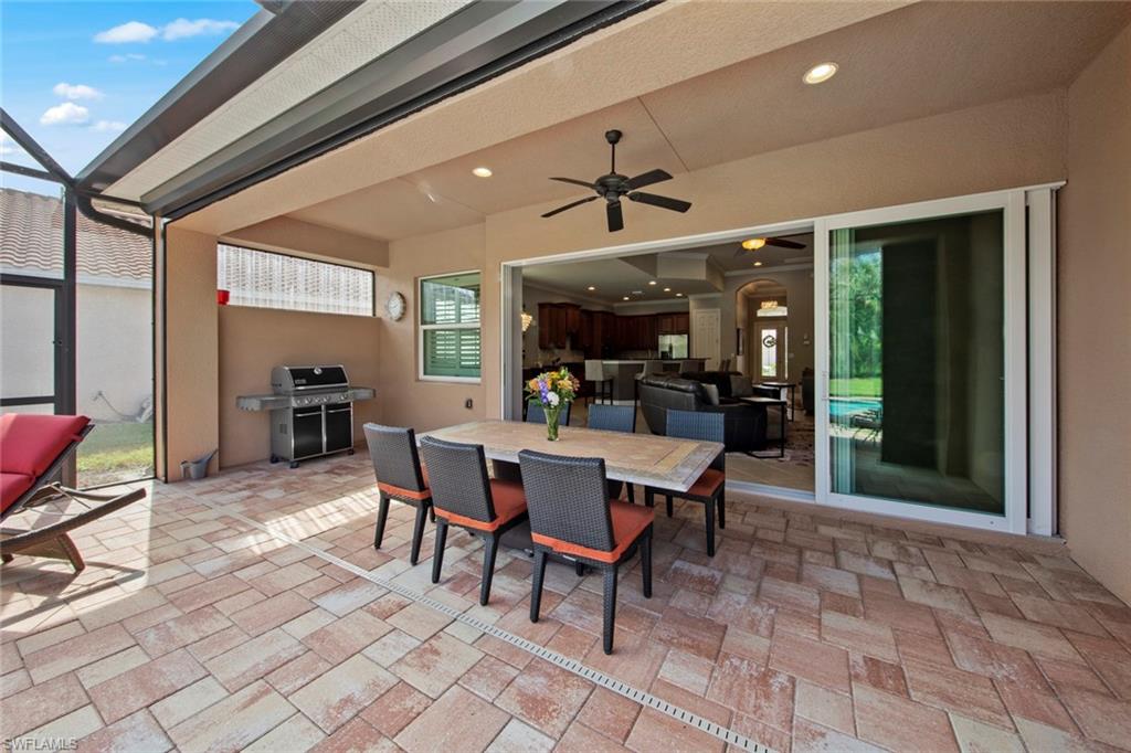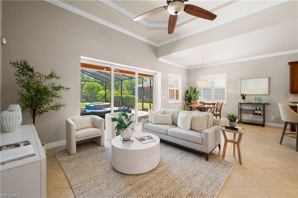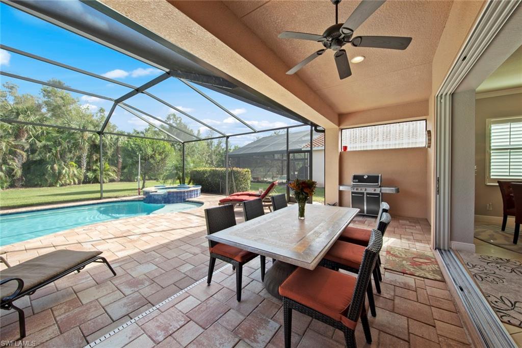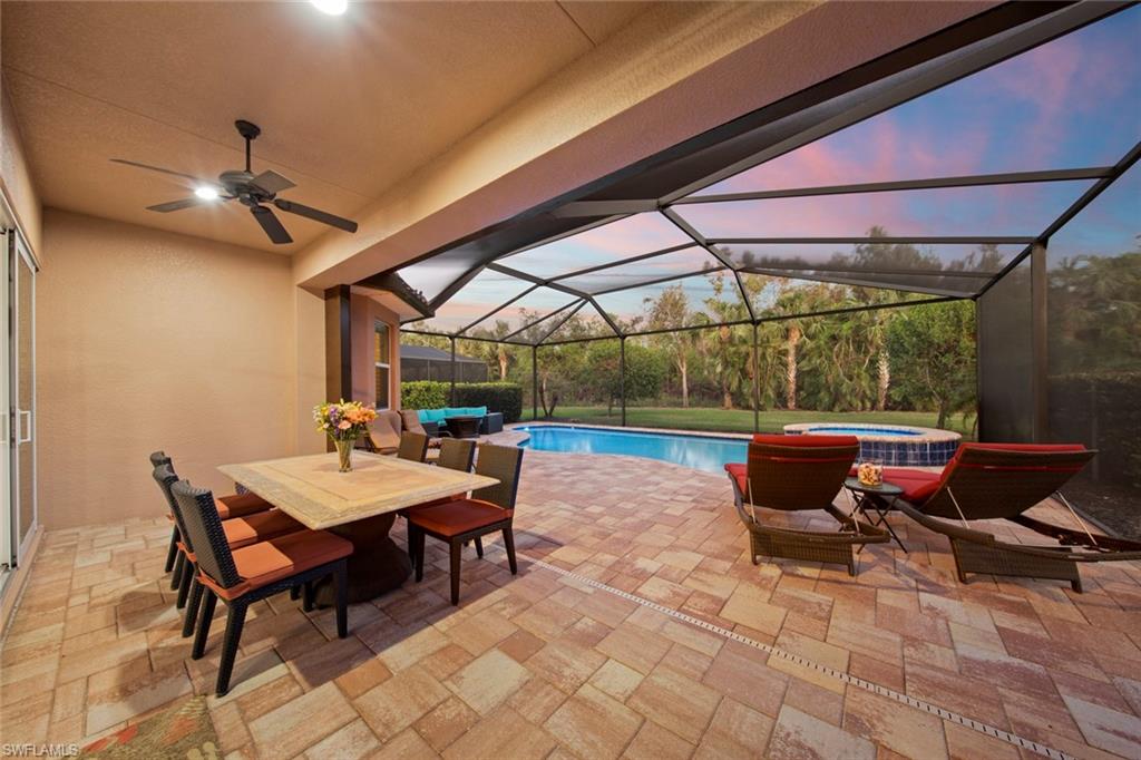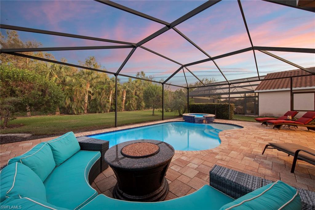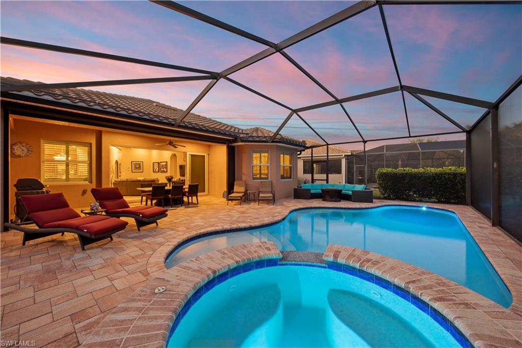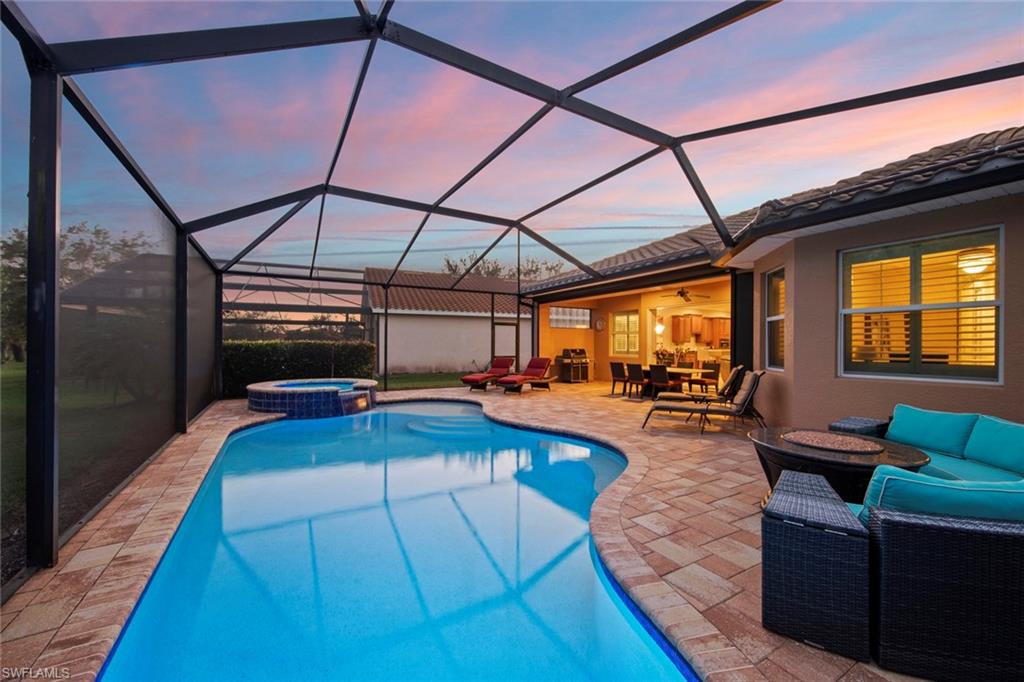 Now refreshed, professionally staged, and offered at an improved price—this is your opportunity to own the newest and final home built in Belle Lago. This Toll Brothers Massiano model offers 4 bedrooms, 2.5 baths, and over 2,200 square feet of refined living space, all set on a special oversized lot with total privacy in the back. Soaring volume ceilings and a spacious great room layout create an open, elegant feel, while recent staging enhances the home’s warmth and livability. Upgrades include impact-resistant windows and doors, plantation shutters, an electric vehicle charger, and a large step-in shower in the primary suite. The private backyard oasis features a custom pool and spa with both gas and solar heating, all backed by lush green space with no homes behind you. Belle Lago is a natural gas community offering resort-style amenities including a pool, spa, tennis, pickleball, fitness center, playground, and a 24/7 guarded gate. Optional golf memberships are available at the neighboring Estero Country Club, accessible via golf cart. Don't miss your opportunity to own the newest home in the community—staged, refreshed, and priced to sell. A rare find in one of Estero’s most desirable gated neighborhoods.