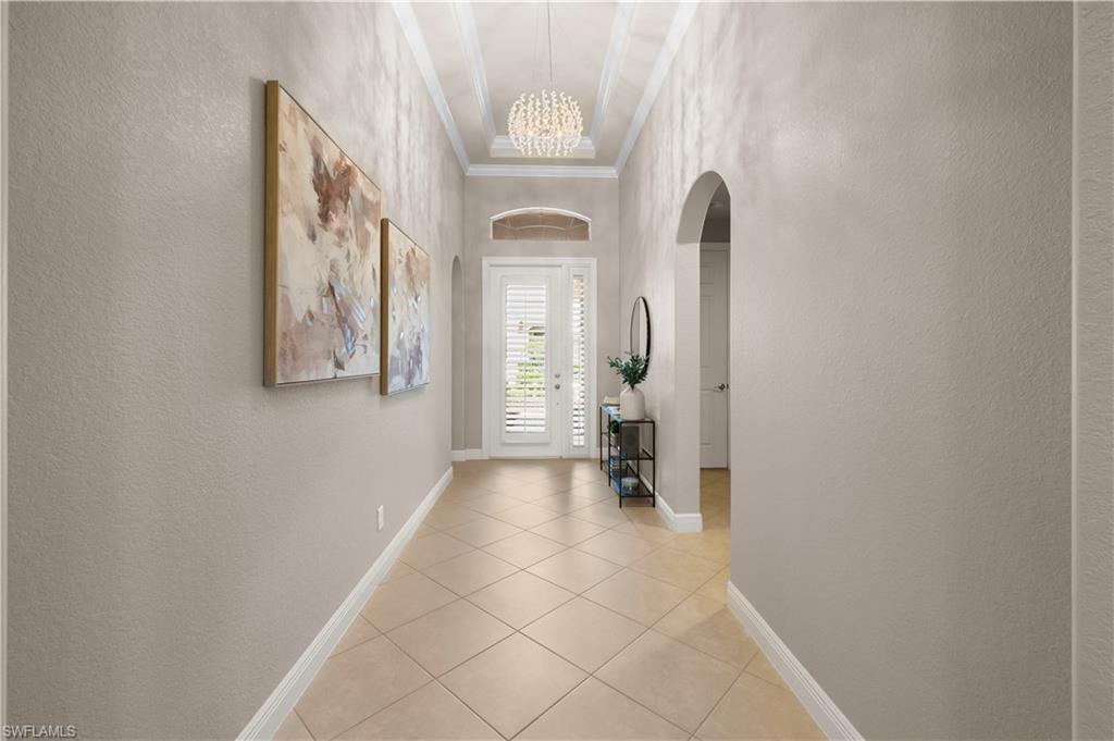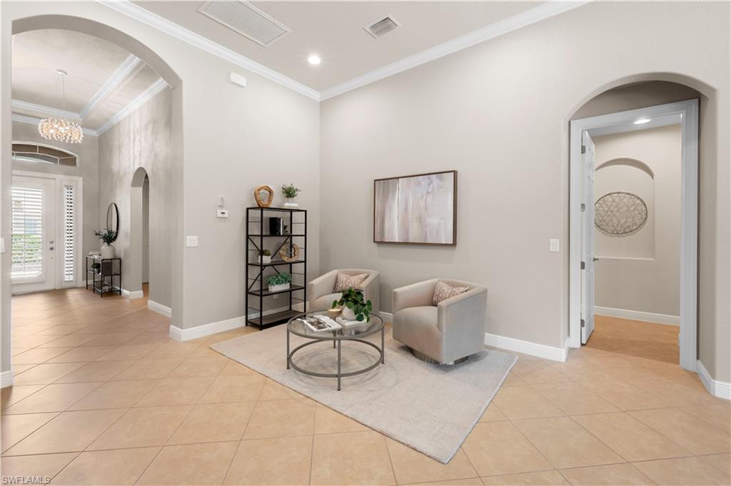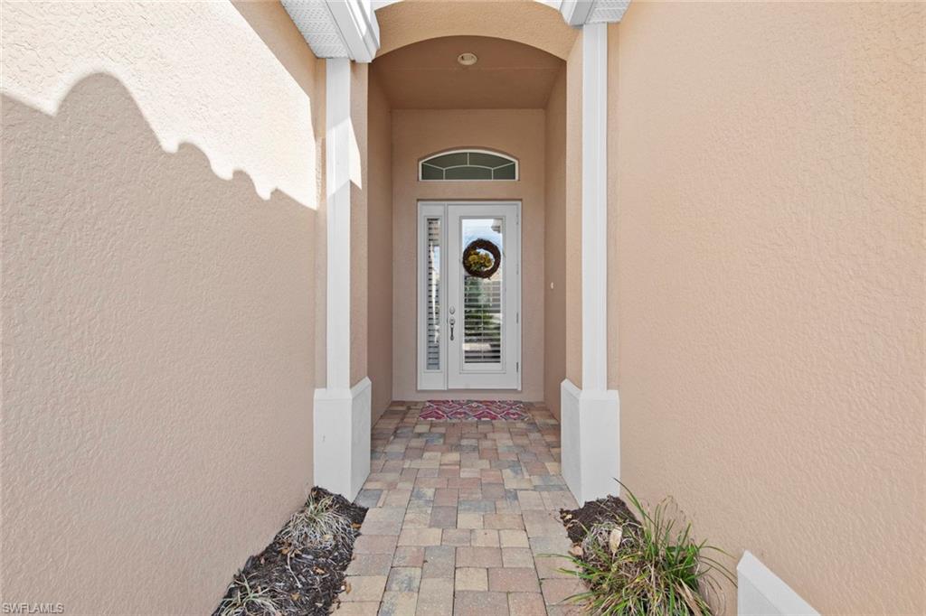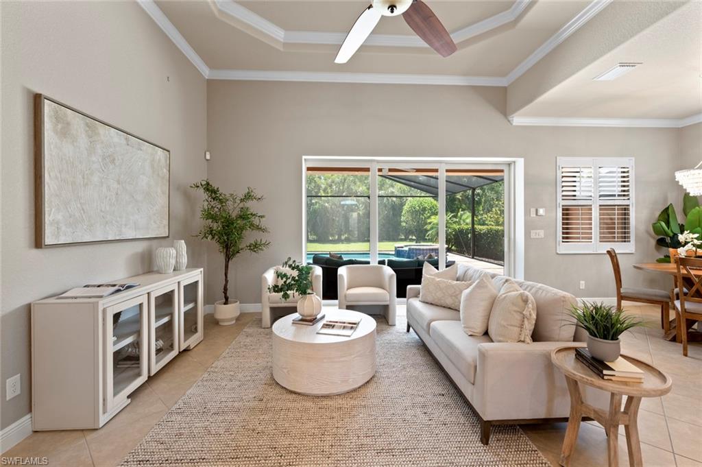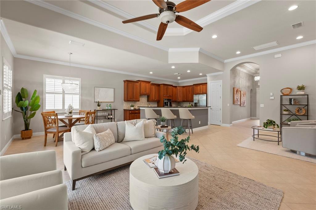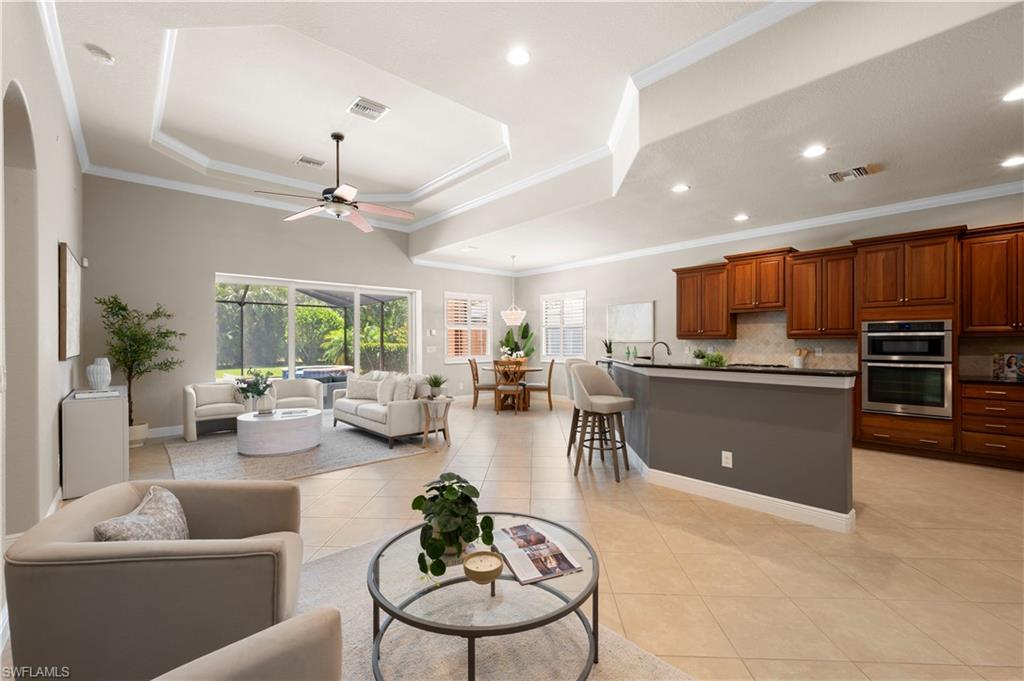 Now refreshed, professionally staged, and offered at an improved price—this is your opportunity to own the newest and final home built in Belle Lago. This Toll Brothers Massiano model offers 4 bedrooms, 2.5 baths, and over 2,200 square feet of refined living space, all set on a special oversized lot with total privacy in the back. Soaring volume ceilings and a spacious great room layout create an open, elegant feel, while recent staging enhances the home’s warmth and livability. Upgrades include impact-resistant windows and doors, plantation shutters, an electric vehicle charger, and a large step-in shower in the primary suite. The private backyard oasis features a custom pool and spa with both gas and solar heating, all backed by lush green space with no homes behind you. Belle Lago is a natural gas community offering resort-style amenities including a pool, spa, tennis, pickleball, fitness center, playground, and a 24/7 guarded gate. Optional golf memberships are available at the neighboring Estero Country Club, accessible via golf cart. Don't miss your opportunity to own the newest home in the community—staged, refreshed, and priced to sell. A rare find in one of Estero’s most desirable gated neighborhoods.