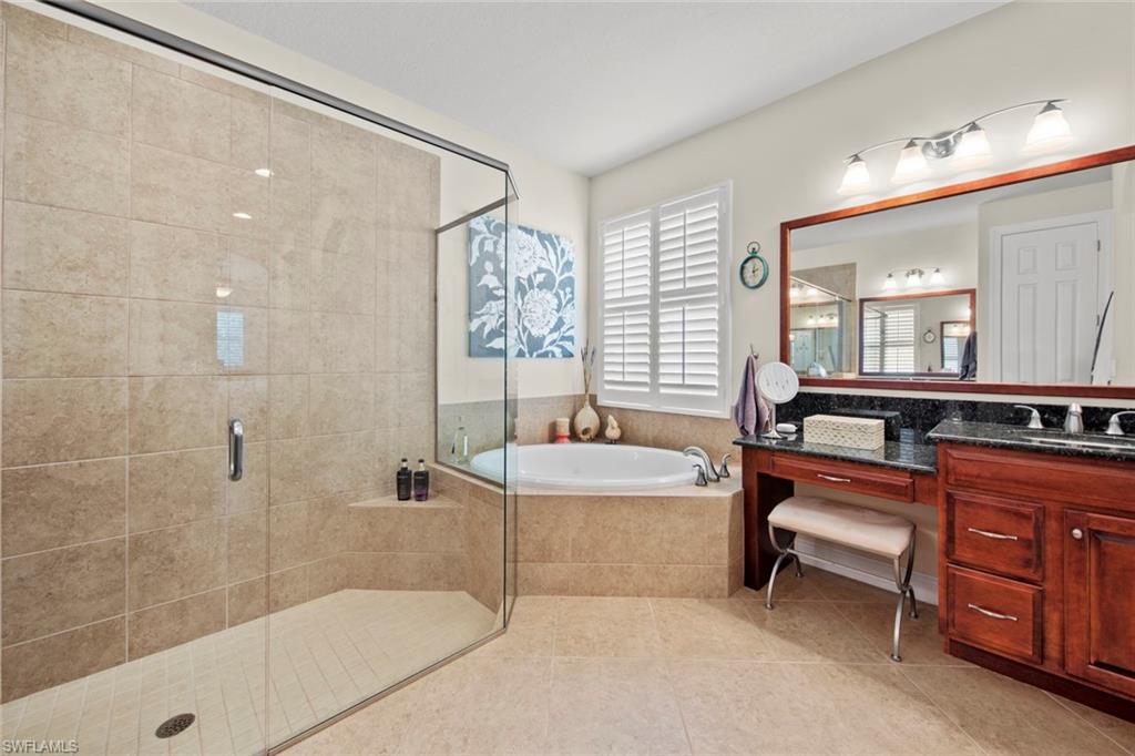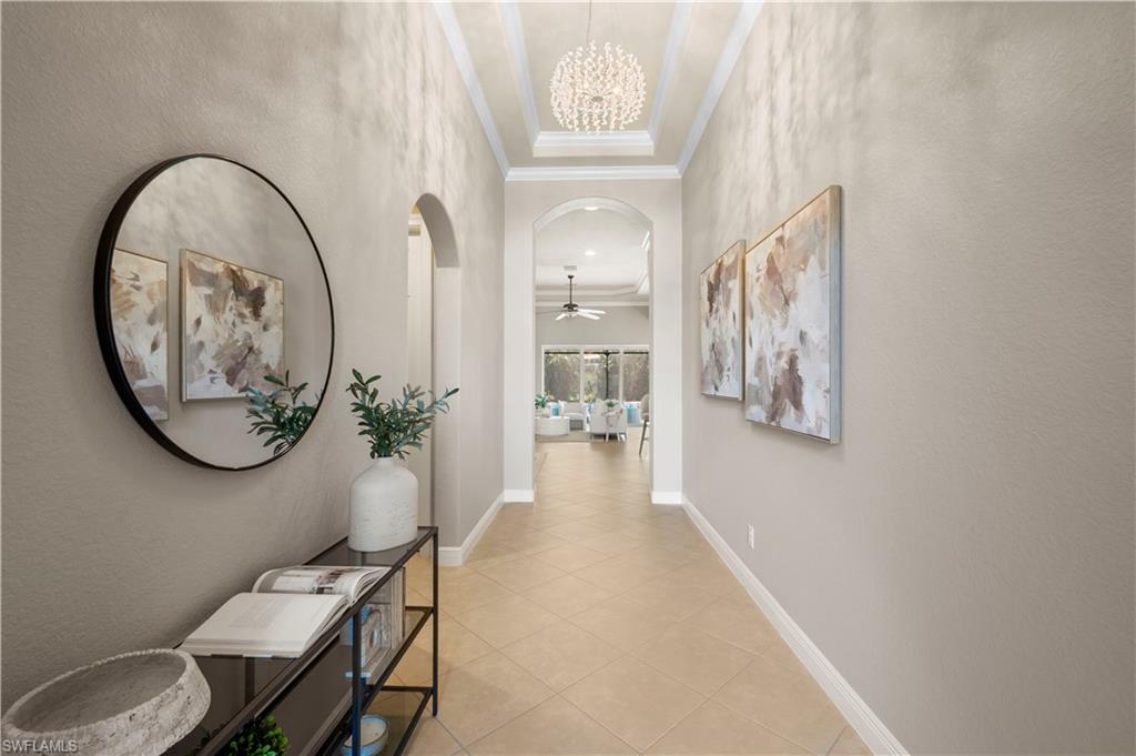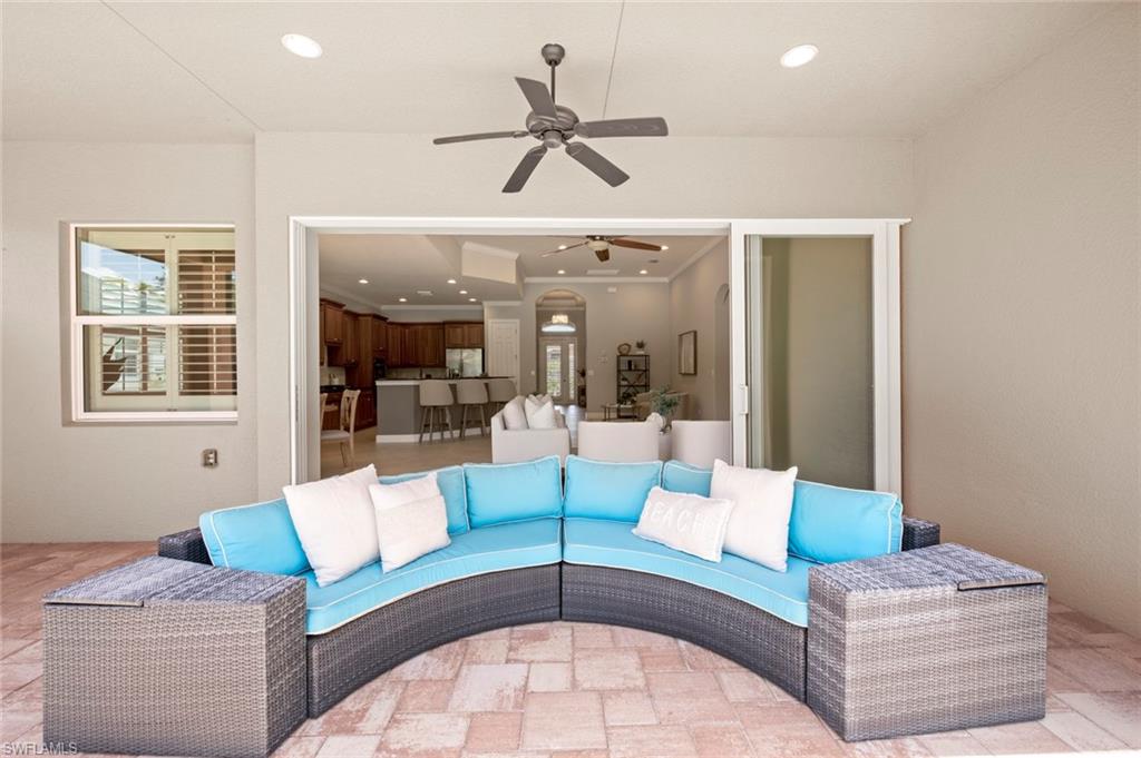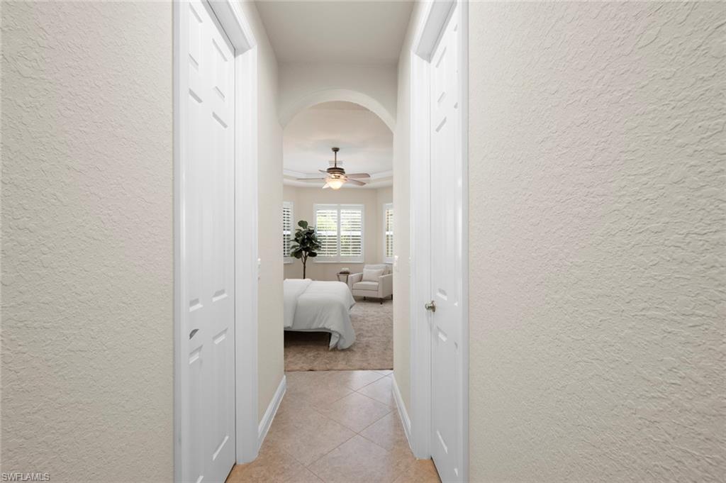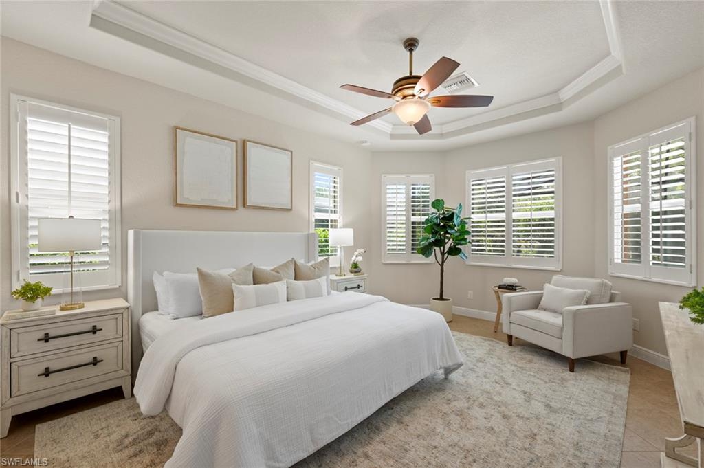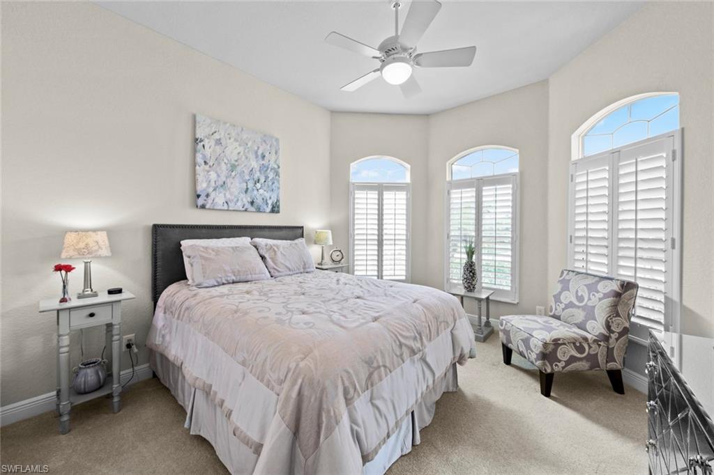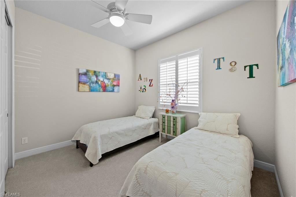 Now refreshed, professionally staged, and offered at an improved price—this is your opportunity to own the newest and final home built in Belle Lago. This Toll Brothers Massiano model offers 4 bedrooms, 2.5 baths, and over 2,200 square feet of refined living space, all set on a special oversized lot with total privacy in the back. Soaring volume ceilings and a spacious great room layout create an open, elegant feel, while recent staging enhances the home’s warmth and livability. Upgrades include impact-resistant windows and doors, plantation shutters, an electric vehicle charger, and a large step-in shower in the primary suite. The private backyard oasis features a custom pool and spa with both gas and solar heating, all backed by lush green space with no homes behind you. Belle Lago is a natural gas community offering resort-style amenities including a pool, spa, tennis, pickleball, fitness center, playground, and a 24/7 guarded gate. Optional golf memberships are available at the neighboring Estero Country Club, accessible via golf cart. Don't miss your opportunity to own the newest home in the community—staged, refreshed, and priced to sell. A rare find in one of Estero’s most desirable gated neighborhoods.