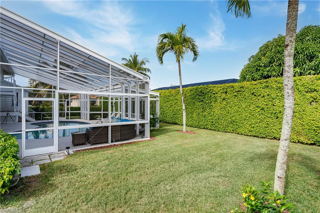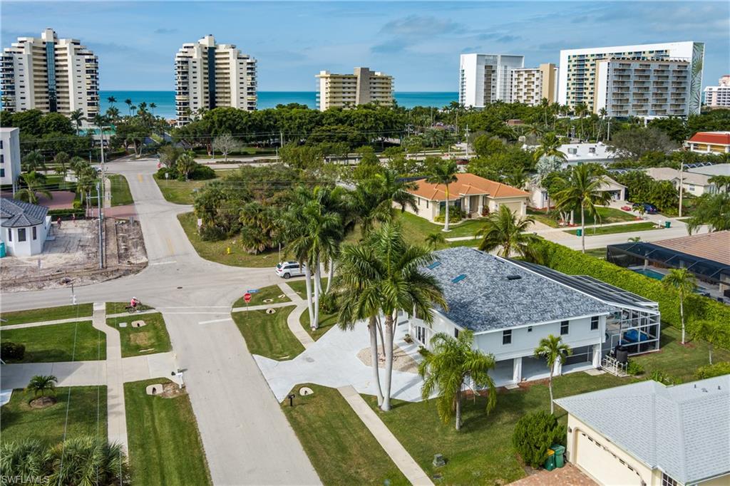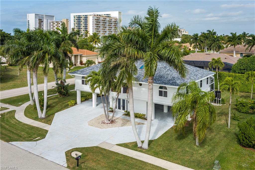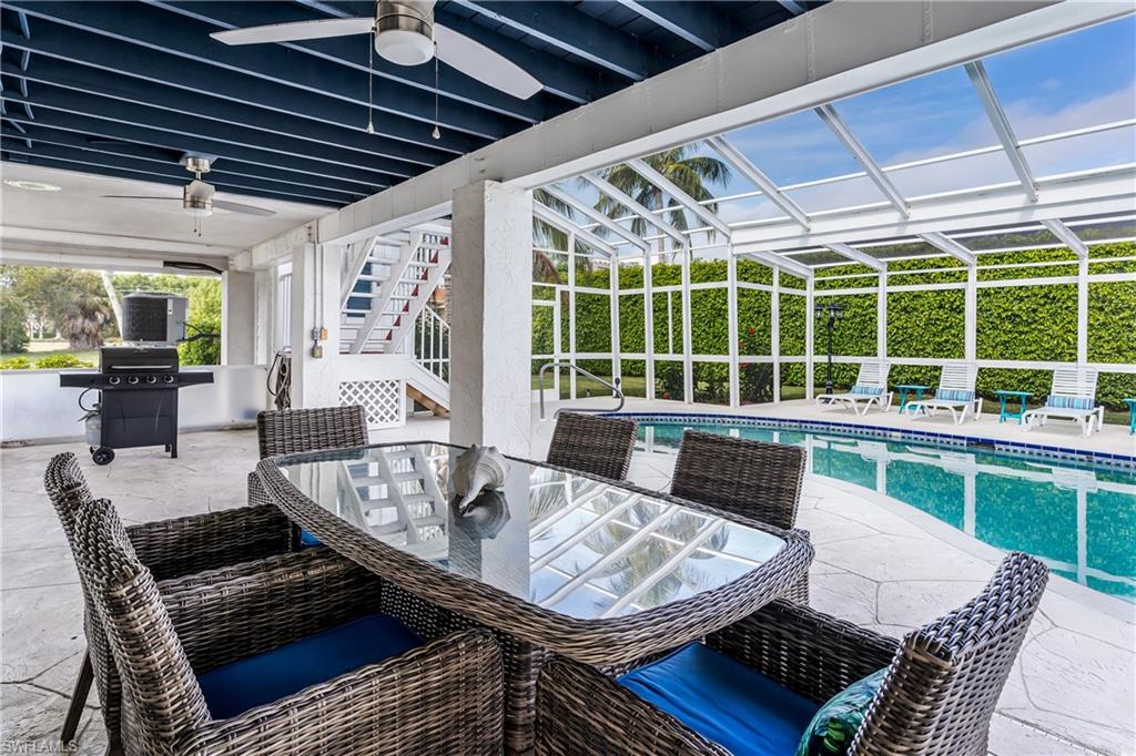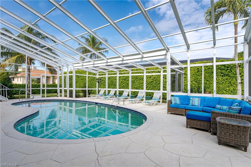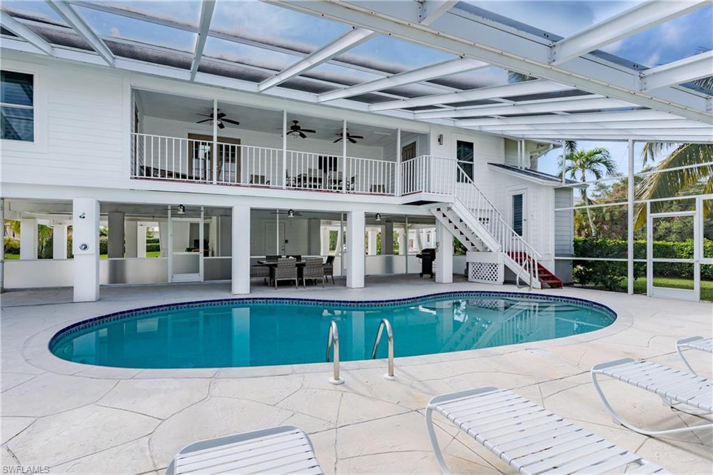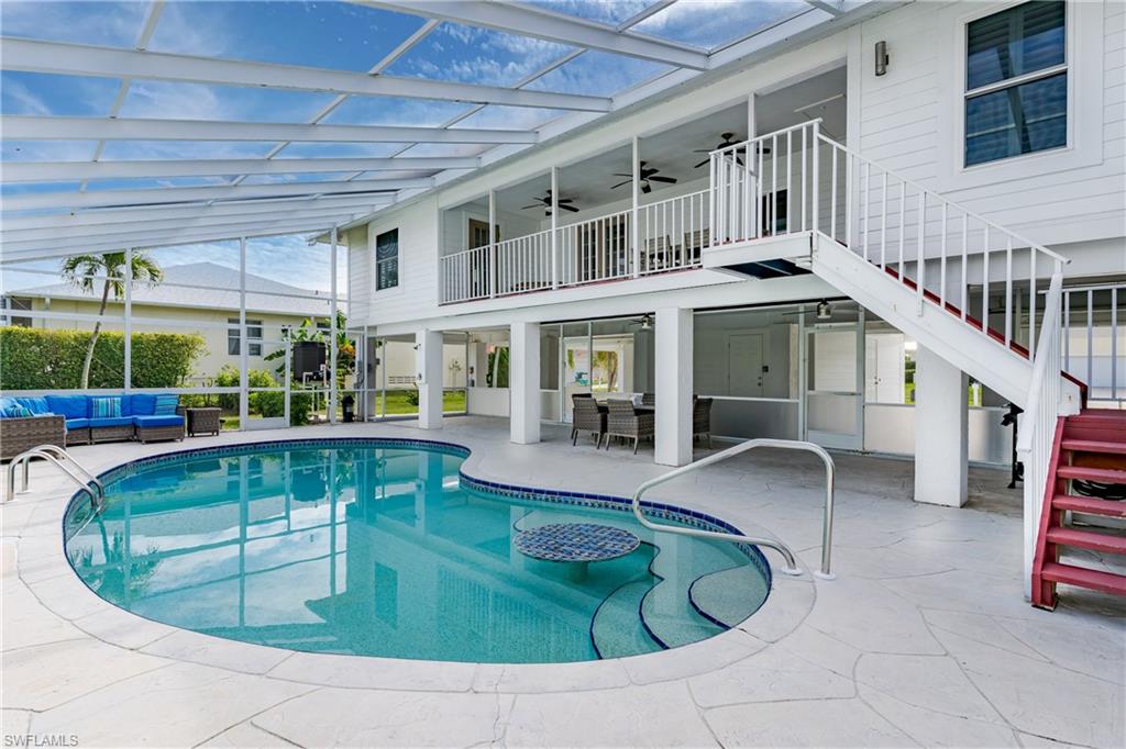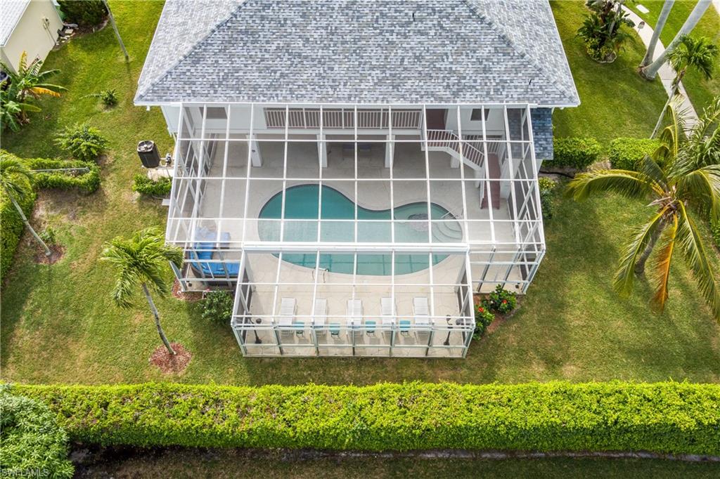 CLOSE TO THE BEACH! Attention Investors... 97,800 collected in rent in 2023; and 119,998 in 2022! Whether you are looking for a great investment near the beach & restaurants, or looking for a nice place to call home, you will love this impressive Old Florida style home. Situated on an oversized lot in the much sought after south end of the island. Enter through the double glass doors into a freshly painted tropical blue 12x12 entry. Wide stairway takes you to the upper floor where all your living space is. Step into the huge great room that boasts vaulted wood-beamed ceiling, and a beautiful south facing Bay window. Off the great room is a dining area that has double doors leading out to the 10x28 screened-in lanai. The kitchen has stainless steel appliances, granite countertops, pantry, picture window, and a 12 ft breakfast bar! Split floor plan has 2 bedrooms each on either side of the great room for a total of 4. Steps down from the lanai is a pool bath that has recently been updated. This home has outdoor living at its best! Huge screened-in deck for soaking in the Florida sunshine surround the large inviting pool. An extra plus is a covered 10x50 area with 3 new ceiling fans to keep you cool. There is a tremendous amount of outdoor furniture that stays with the house, including 4 brand new lounge chairs & cushions. The home is beautifully landscaped with King palms and tall hedges giving you much privacy. Yard is partially fenced for your 4 legged friends. Adjacent to the pool deck is a 12x8 utility room that has a closet that seller uses as an owner's closet when home is rented. Note all the expensive upgrades: Approximately October 2022 - new hot water heater, new A/C, new pool pump, new pool heater, new outside lighting. Approximately November 2020, all new impact glass windows and front entry door, new Hardie board siding around entire home, and new roof! This home sits a short distance from Marco Island's South Beach, shopping, fine and fun dining, and a movie theater. The location can't be beat and a beautiful home comes with it! Turnkey furnished - can move right in.
