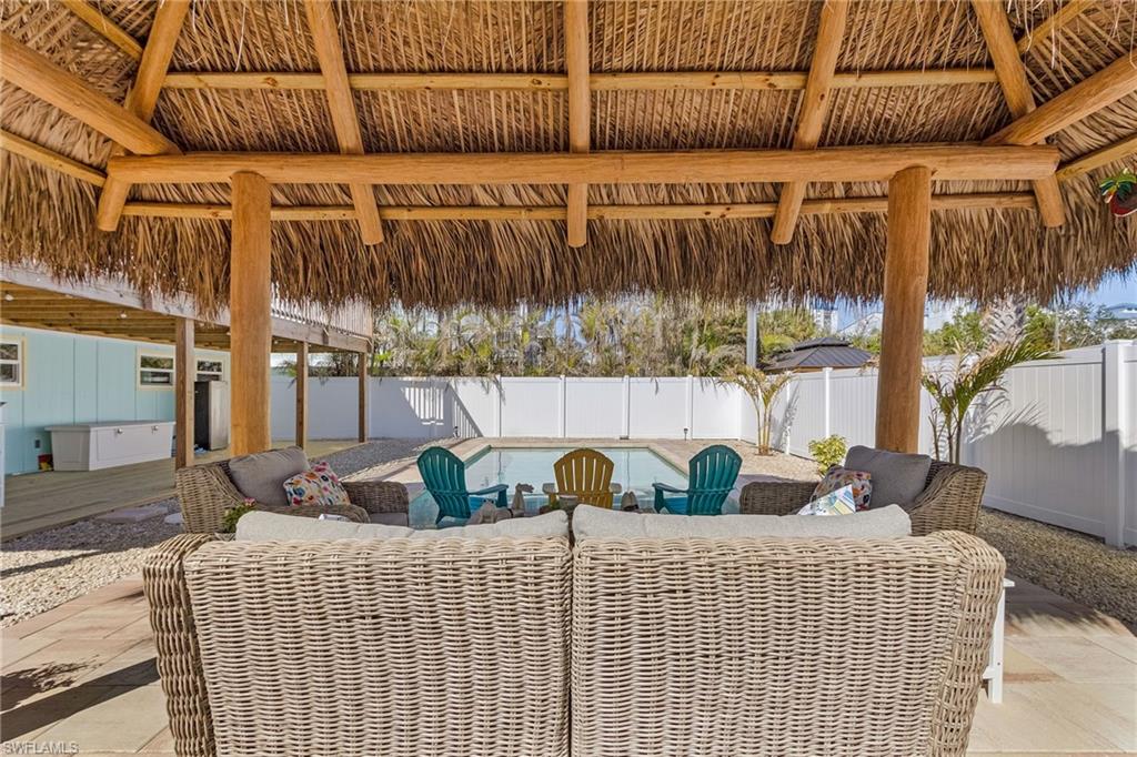 Welcome to our beautiful property on Fort Myers Beach. WHY THIS PROPERTY IS SPECIAL: INCOME PRODUCING GUEST QUARTERS AVERAGING UPWARDS TO $5,500 MONTHLY, WHILE OWNERS RESIDE IN THE HOME, OFFERING DEEDED BEACH ACCESS, ALL NEW IMPACT RESISTANT DOORS & WINDOWS, HEATED POOL, NEW ROOF, NEWLY CONSTRUCTED TIKI HUT, TASTEFUL PAVER POOL DECK AND FULLY FURNISHED TURNKEY HOME! Centrally located, mid Island location next to Publix, full-service marina and restaurant with relaxing back bay views. Convenient 5-minute walk to a deeded beach access and spectacular Gulf sunsets. Charming beach style home offering no HOA fees in a highly desirable rental community. Home offers amazing 3 bedrooms and 2 bathrooms on the main floor and a single bedroom and bathroom in the grandfathered guest quarters. This impressive property is offered fully furnished turnkey, with all new furniture, appliances, A/C system, hot water tank, new roof, 2 bay garage with a 50-amp outlet for a car charging station. All new impact resistant windows, upper and lower deck area, all new heated pool and newly constructed tiki hut on a tastefully pavered pool deck. The yard is completely fenced in for some privacy while enjoying your time outside. Call today for your private showing, you will not be disappointed. This property is in absolute pristine condition and move-in ready. Did I mention an endless supply of scenic and incredible sunsets?