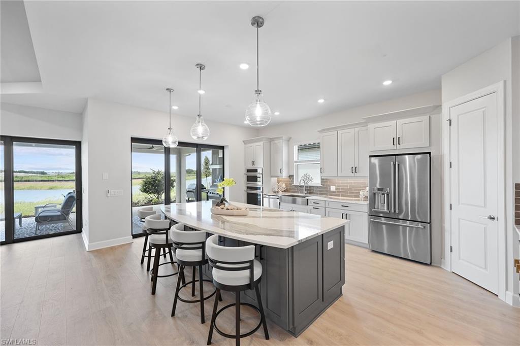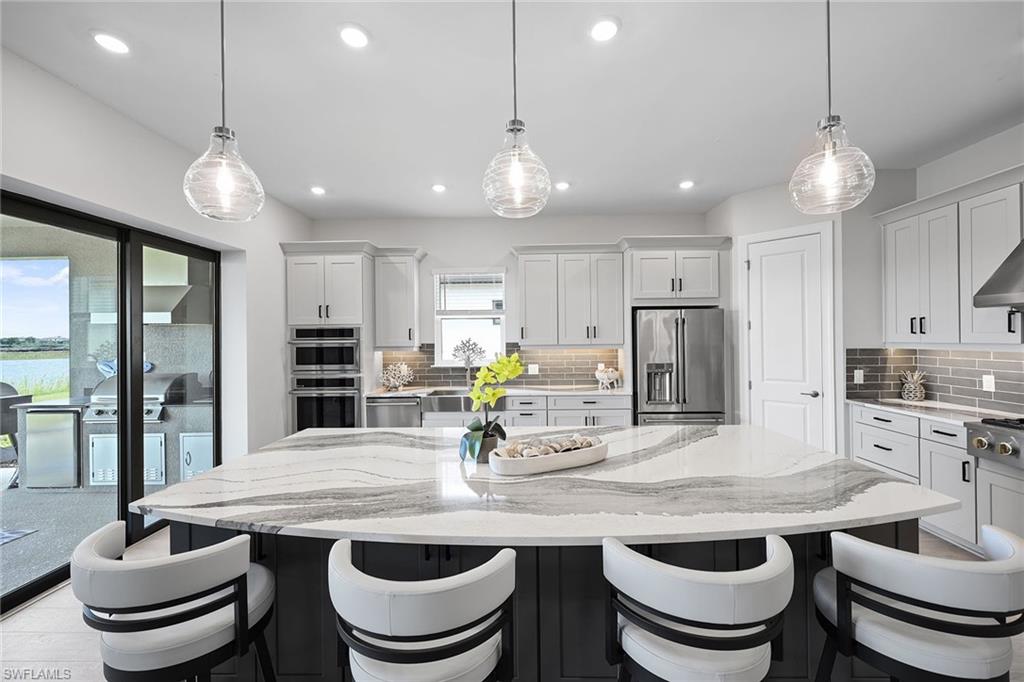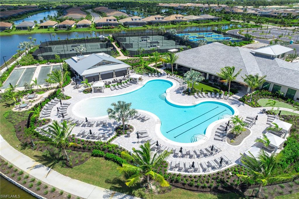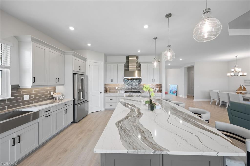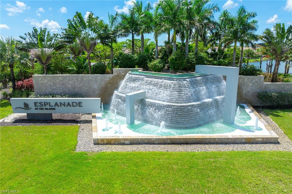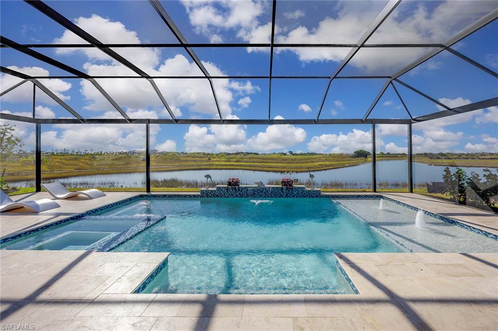 The extraordinary Pallazio floor plan is available now in Esplanade by the Islands. One of the newest Taylor Morrison communities in Naples, this popular plan has it all. This home is open and inviting with a delightful glass double-door entry and interior foyer. Tray ceiling accents, crown molding, and gorgeous flooring in light wood design throughout. The spacious great room plan has a gorgeous open kitchen and dining area with a large central island and numerous upgrades, including all GE Cafe appliances and luxury quartz counters, a stainless wall oven and microwave, French door refrigerator and more. The walk-in pantry, upgraded cabinetry, crown molding and custom drawers complete the picture. The exceptional pool and outside living area are large and include a summer kitchen. Custom-designed pool and spa with delightful glass surround, and a seamless waterfall spa in shades of blue and aqua will draw you outdoors to the saltwater pool. An ideal environment with a sun shelf, gas grill, lovely dining area and more. The exceptional primary bedroom suite with an oversized walk-in closet and dual entrance shower is unique to this floor plan and beautifully appointed. The oversized guest suites provide comfortable arrangements for all. On the edge of the Creek Course in stunning Fiddler's Creek, Turin Way provides lovely views and scenery. An exceptional home, with an additional tandem two-car garage. The amenities with dining, fitness, full spa, hair and nails are delightful. Minutes from Old Naples and Marco Island, this is an exceptional home and community.