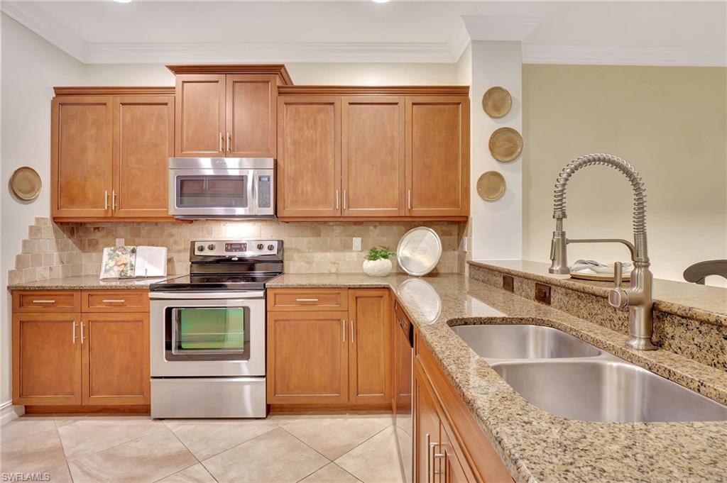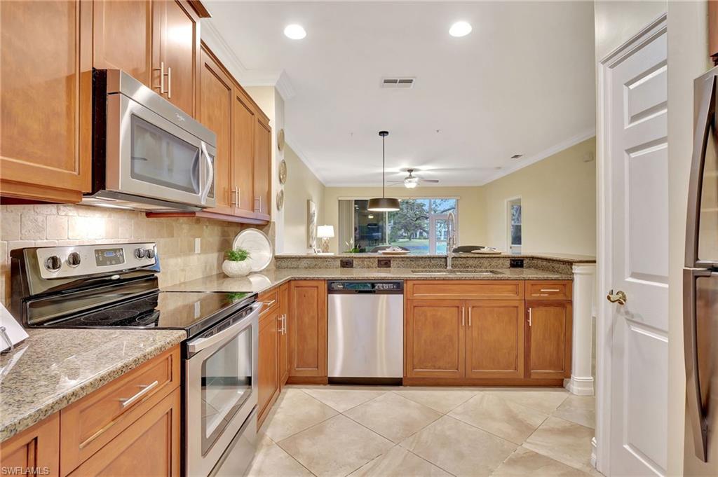 965 Tarpon Cove,#103, offers you location, condition, value and a terrific investment opportunity. Tarpon Cove has long been referred to as a "The Hidden Gem", west of Rt 41, surrounded by tropical preserve, tucked away from the hustle and bustle, yet close to just about eveything! This convenient "Martinique" first floor residence, with deeded carport and happens to be in the first building with the community pool/clubhouse just steps away and plenty of guest parking....easy breezy! As you step inside the condo the view to the lake and sound of the water fountain draws you in! It feels fresh and inviting. This home, in fabulous condition, offers you tile flooring, crown molding throughout, a custom cherry kitchen complete with granite countertops, tumbled stone backsplash, double stainless sink with pot filler faucet, wine rack, stainless steel Whirlpool appliances, recessed lighting, pantry, breakfast bar that can easily seat 5, and a delightful front sitting area that can be versatile to your needs. An expansive Living Room with triple sliders opens to an enclosed/screened lanai to display nature and wildlife at its best. The Primary Ensuite has handsome vinyl flooring, lanai slider, richly appointed bath with cherry cabinetry, dual sinks, tiled shower, walk-in closet and separate owners closet. The second bedroom also has vinyl flooring and dresser nook, adjacent well appointed guest bath, linen and laundry closet. An additional bonus is the exclusive, exterior storage room ideal for bikes, gas grill, beach chairs, golf clubs etc. COME TAKE A LOOK! A GREAT LIFESTYLE AWAITS!