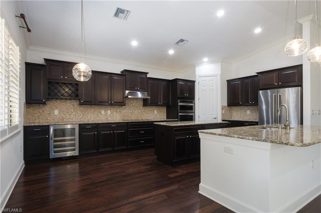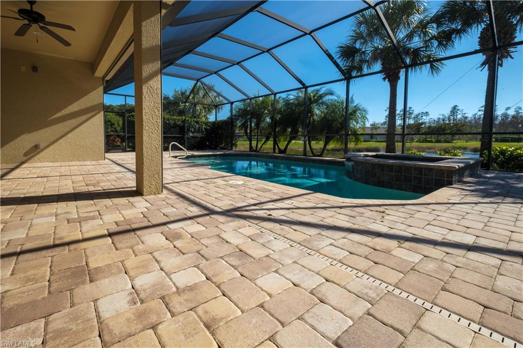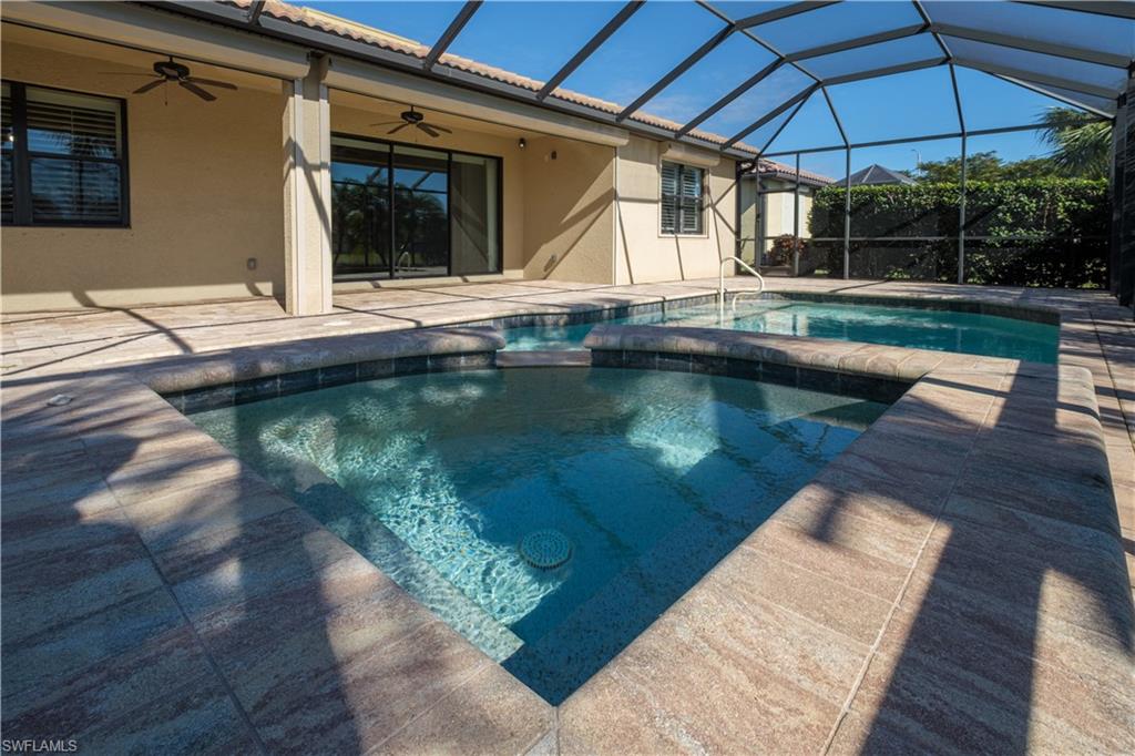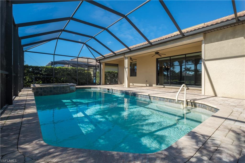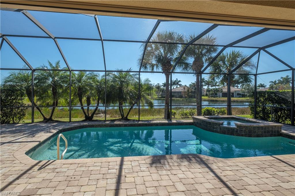 This former Cameron Model Home was designed for luxurious living, showcasing countless upgrades and thoughtful features. With three bedrooms, a den, and three bathrooms, this home boasts a private saltwater pool and spa on a spacious lanai overlooking serene lake views. The Southern exposure enhances the inviting atmosphere, perfect for relaxation or entertaining. Inside, you'll find beautiful hardwood flooring, custom-built closets, hidden storage, a gourmet kitchen with a wine cooler and double island, plantation shutters throughout, fresh interior paint, newly sealed pavers, hurricane protection, and newly refinished flooring in the extended (23' deep) garage. Located just a short walk to the clubhouse and amenities, this amenity-rich gated community features a resort-style pool, fitness center, yoga room, tennis and pickleball courts, and a stunning clubhouse, all with low HOA fees. Conveniently situated near A-rated schools, I-75, shopping, dining, and RSW Airport, this home offers the perfect blend of elegance and practicality. Schedule your private showing today!