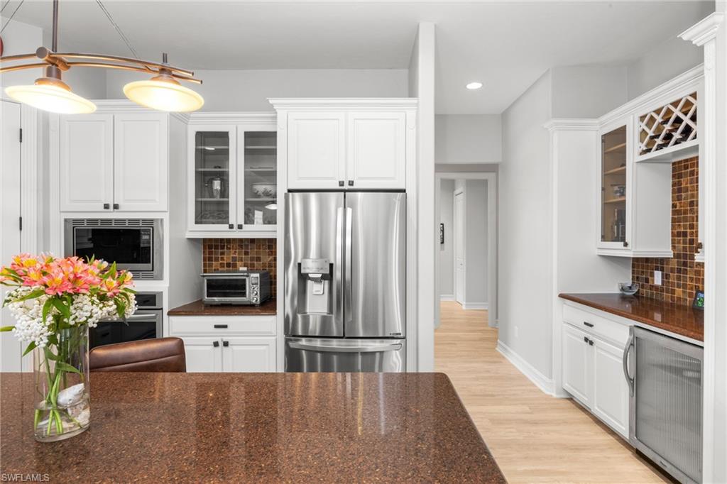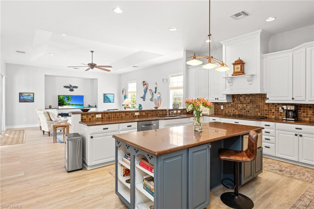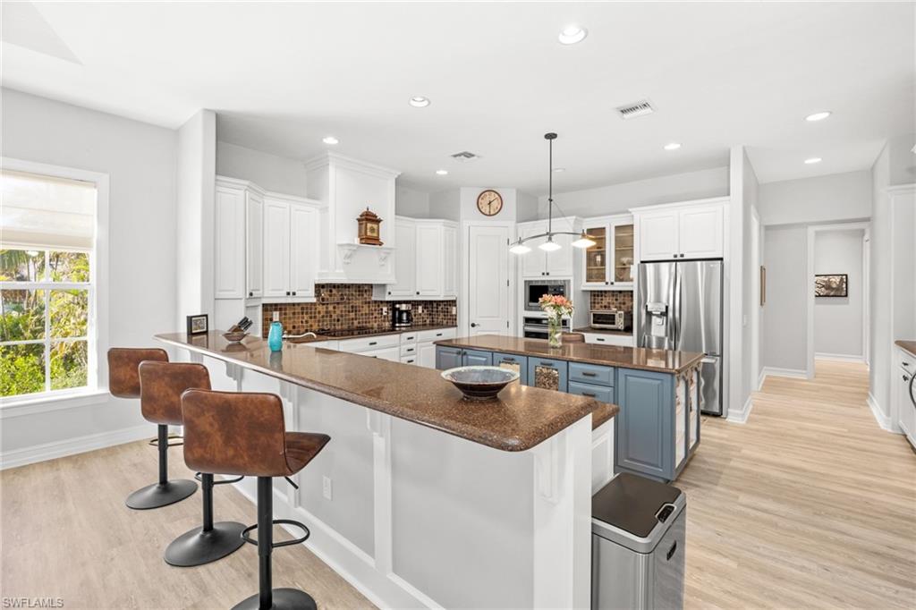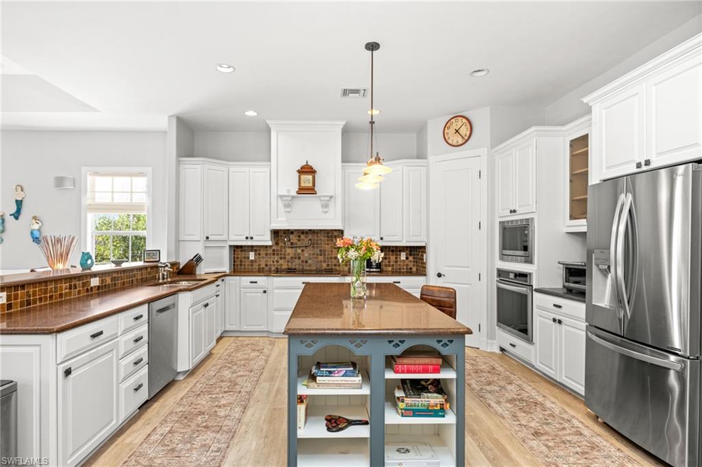 This impressive custom home offers 4 bedrooms and 3.5 bathrooms, nestled on a spacious double lot. The gourmet kitchen is a chef's dream, featuring Silestone countertops, custom wood cabinetry, a walk-in pantry, breakfast bar, a wine cooler, and a center island. It seamlessly connects to a cozy breakfast nook and a spacious family room, while a formal dining room and living room provide additional gathering spaces. The primary suite is a true retreat, complete with a custom walk-in closet, a separate shoe closet, and dual bathroom vanities. Recent upgrades include a new metal standing seam roof installed in 2023, a three-car garage with brand new doors, and new Celect PVC siding. The pool screen and railings were replaced in 2024, along with an elevated pool pump and heater. The air conditioning system was updated in 2022, and there are two water heaters. The property showcases beautiful brand-new landscaping completed in 2024. Additional highlights include cortec flooring, wine cooler, tons of storage and oversized porches that overlook the garden and the heated pool and spa, making it an ideal oasis for relaxation and enjoyment.