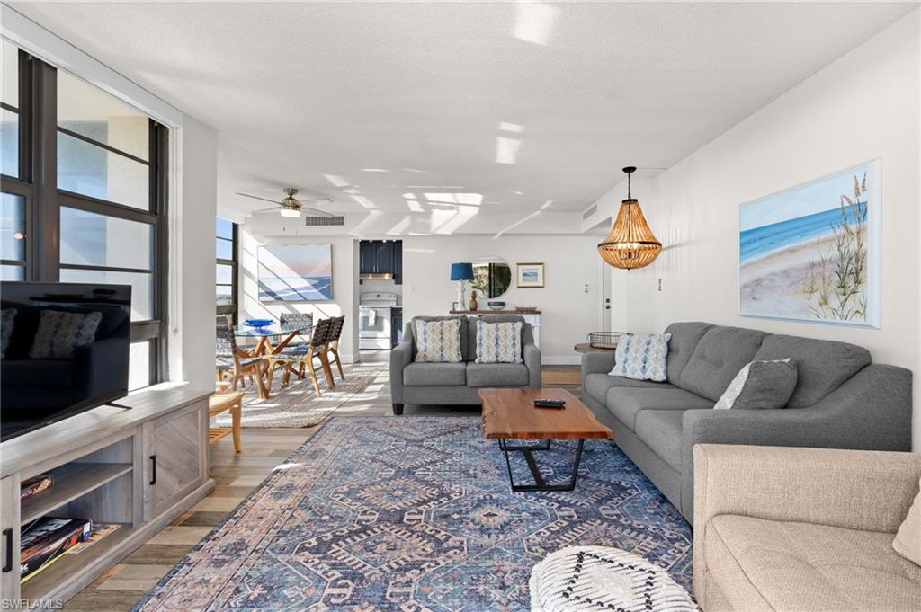 This beautifully decorated turnkey unit offers breathtaking wraparound views of the Gulf of Mexico, pool, and surrounding vistas from an oversized lanai—perfect for relaxing or entertaining. The interior features stunning vinyl flooring throughout, elevating the decor, and a custom-designed kitchen with modern cabinetry that adds both style and functionality. Located in the desirable South Seas Towers, this exceptional property combines luxury living with resort-style amenities, including a year-round heated pool, fitness center, tennis and pickleball courts, boat docks, and kayak/canoe storage. Additional conveniences include 24-hour gated security and covered garage parking. Recent renovations to the lobby, elevators, and social areas enhance the appeal of this coastal retreat. Your dream home awaits!