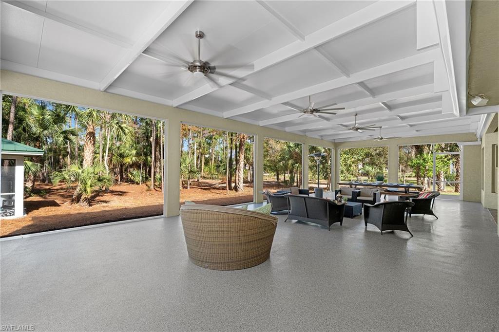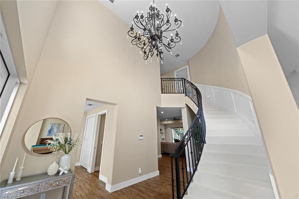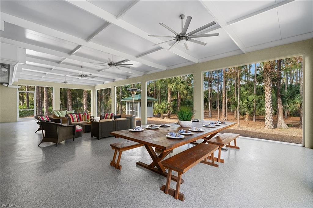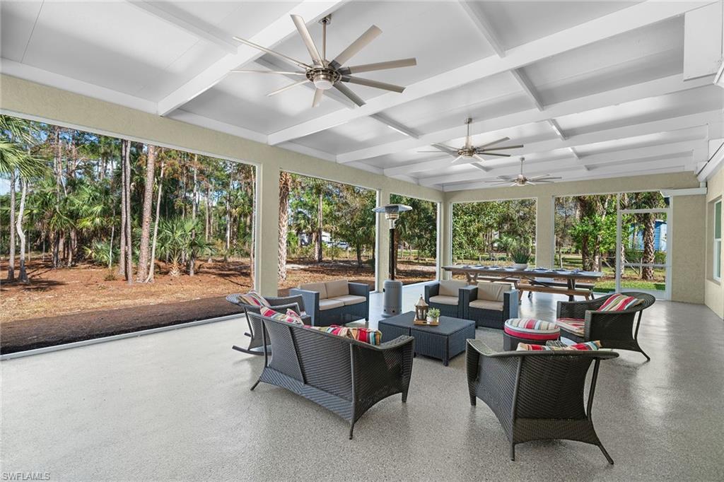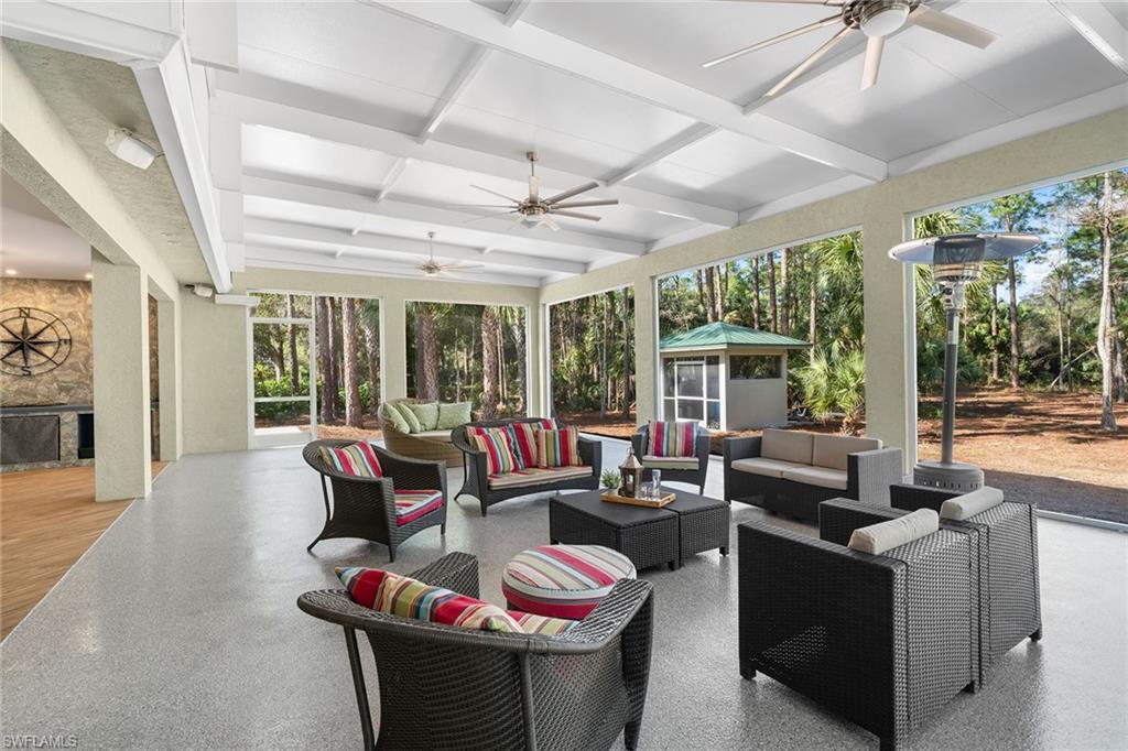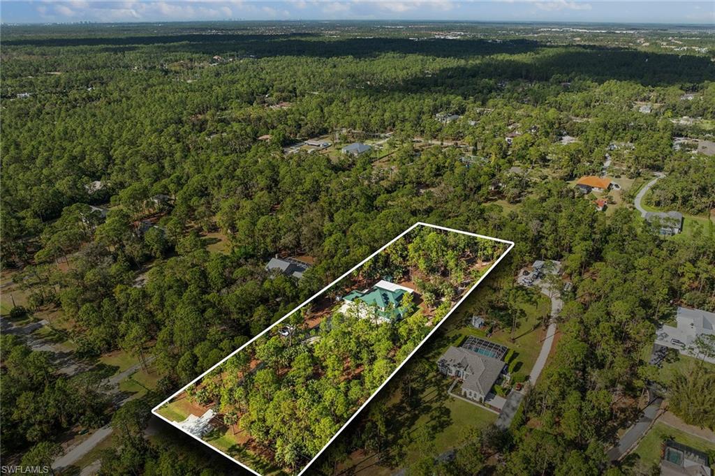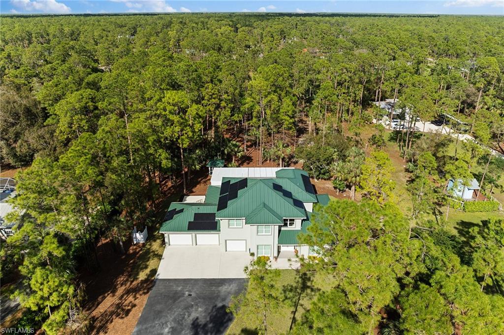 This 4,200-square-foot estate home, completed in 2018, is positioned on 2.73 acres in sought-after Weber Woods. Built with an unwavering focus on structural integrity, featuring poured concrete throughout—including the staircases and walls between both stories—this residence was designed for durability, energy efficiency and refined living. Foam insulation, impact-resistant doors and windows and rooftop solar panels significantly minimize electric costs, only property taxes apply, and a $28 monthly electric bill. A portable whole-house generator ensures uninterrupted power, while an advanced ozone-enhanced water filtration system delivers exceptional water quality. Purposefully designed for grand-scale entertaining, the home seamlessly accommodates gatherings exceeding 100 guests. A 1,900-square-foot lanai offers expansive outdoor living space, and the grounds allow for generous guest parking. The driveway was professionally resealed in April 2025, underscoring the homeowners’ commitment to attentive maintenance. The chef-inspired kitchen showcases custom KitchenAid cabinetry with pullouts, drawers and a pot filler, combining form with functionality. The first-floor bedroom with en suite features a zero-threshold shower for ease and comfort. Everyday conveniences include a second-floor laundry chute and an on-demand hot water system. Additional features include a meticulously installed septic system. Merging architectural precision with eco-forward enhancements, this residence offers an elevated lifestyle in one of Naples’ premier residential communities.