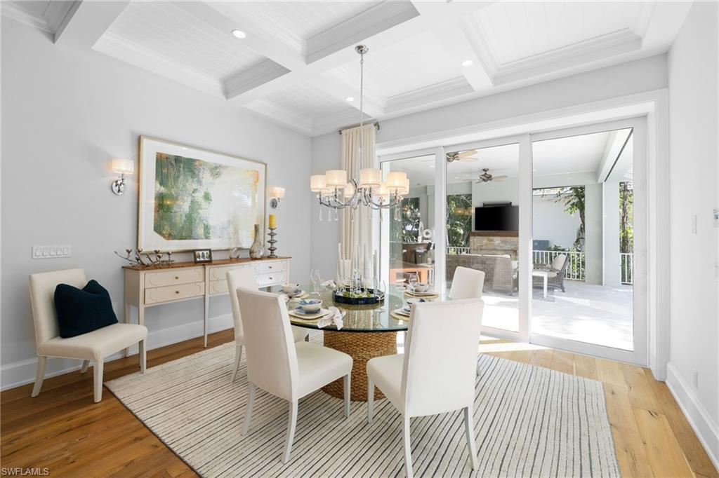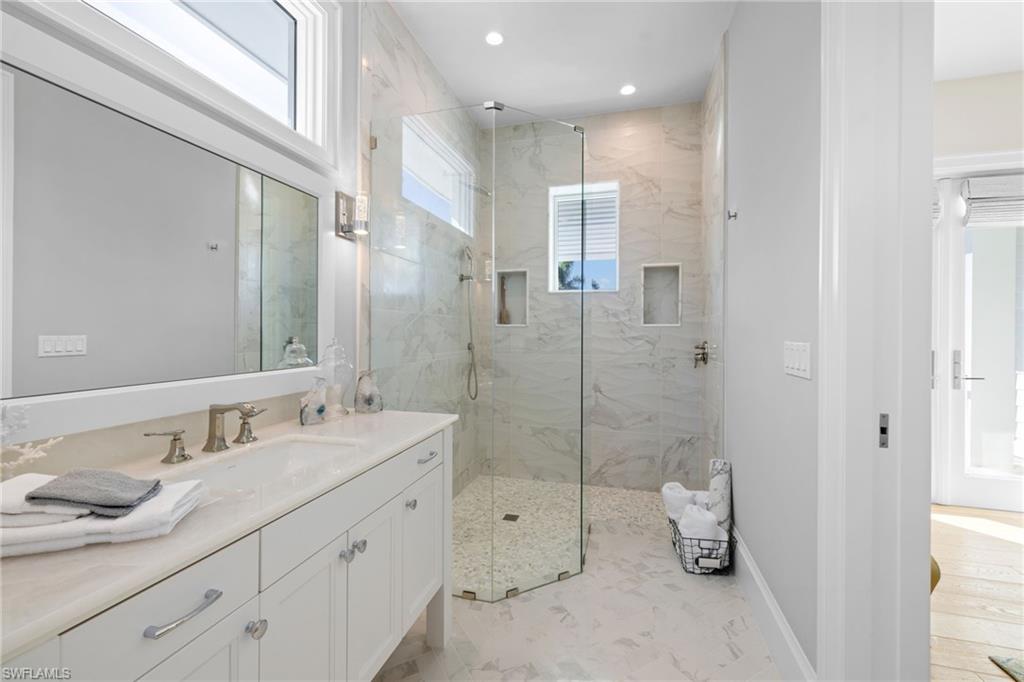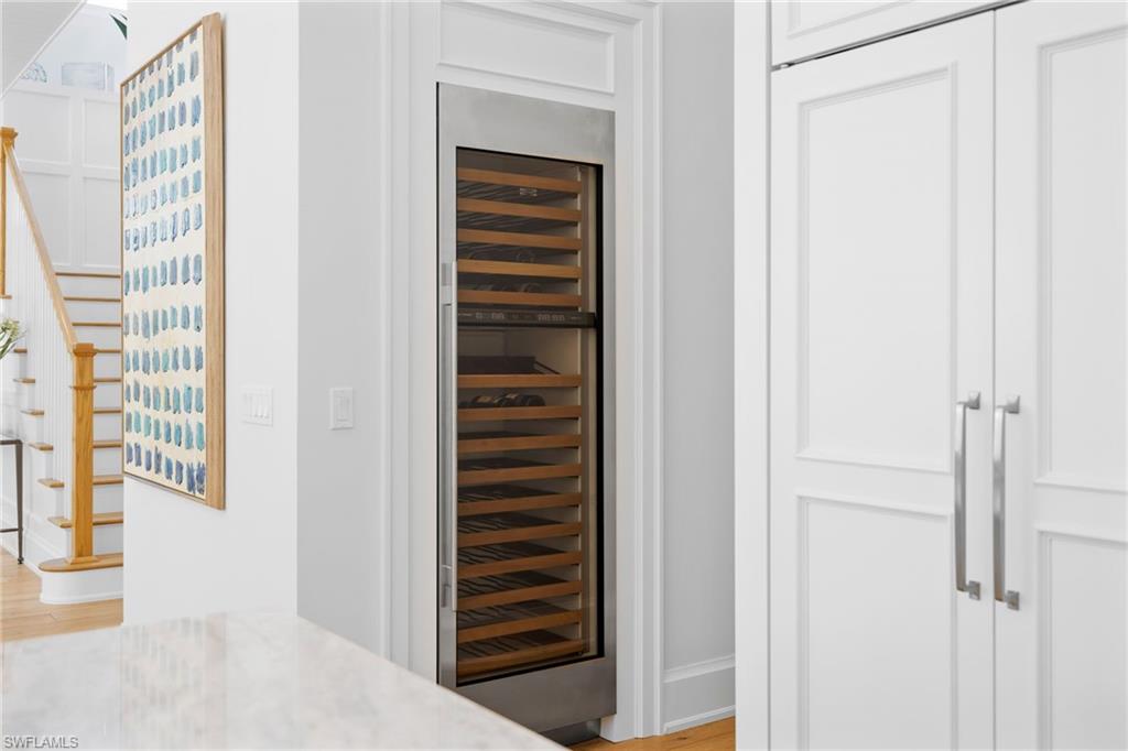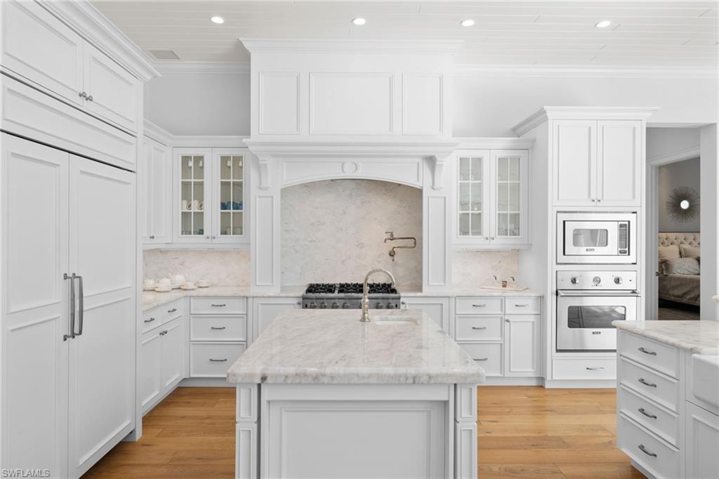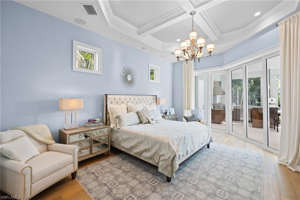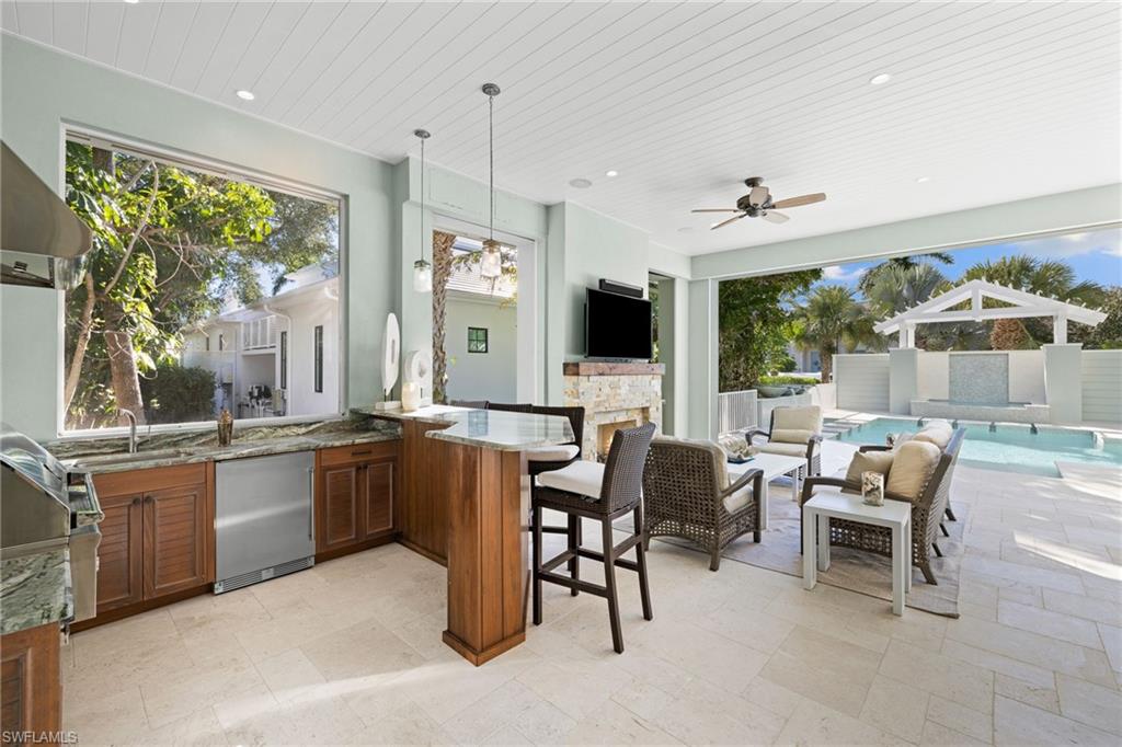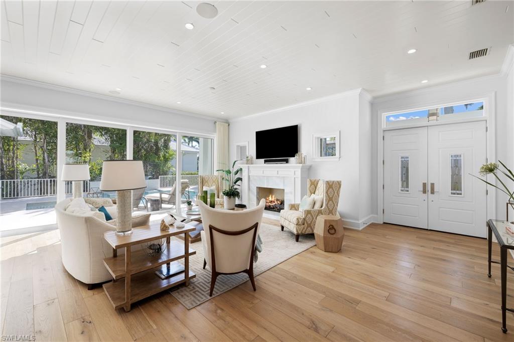 Experience the finest of Coastal Contemporary living in this exquisite residence, nestled on one of the most tranquil and sought-after streets in the Moorings. Impeccably designed, this like-new masterpiece exudes sophistication and elegance, having been meticulously maintained and rarely lived in, including Clive Daniel furniture. Every luxurious detail of this home has been thoughtfully designed. The bright and airy great room, complete with a fireplace and elegant smoked oak flooring, seamlessly connects to a spacious lanai that features a second fireplace, full bath, dining area, and outdoor kitchen with automated screens. Enjoy breathtaking sunsets from the sunny pool deck with Southwest exposure, a pergola-covered private spa, and soothing modern bowl fountains. The award-winning kitchen is a chef’s dream, boasting custom cabinetry, polished Quartzite counters, a Viking 6-burner gas range with a second wall oven, a Subzero paneled refrigerator, Bosch dishwasher, and a wine cooler. The primary suite, along with a den/study or potential 5th bedroom, is conveniently located on the ground floor, while the upper level features three spacious ensuite bedrooms and a cozy TV gathering area. The floor plan allows for installation of an elevator for added convenience. The optional Moorings membership private beach club is just minutes away, embodying the luxurious lifestyle that Naples has to offer.