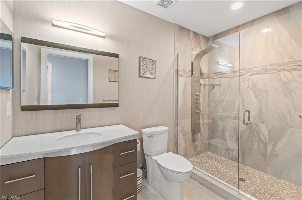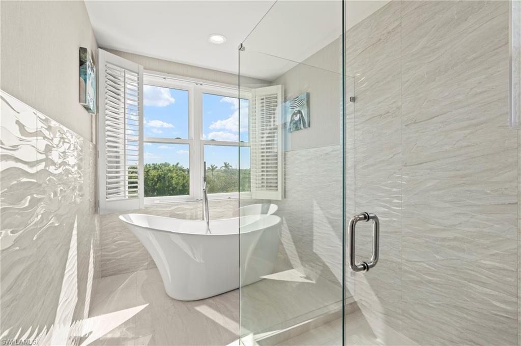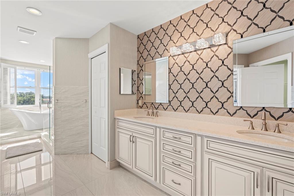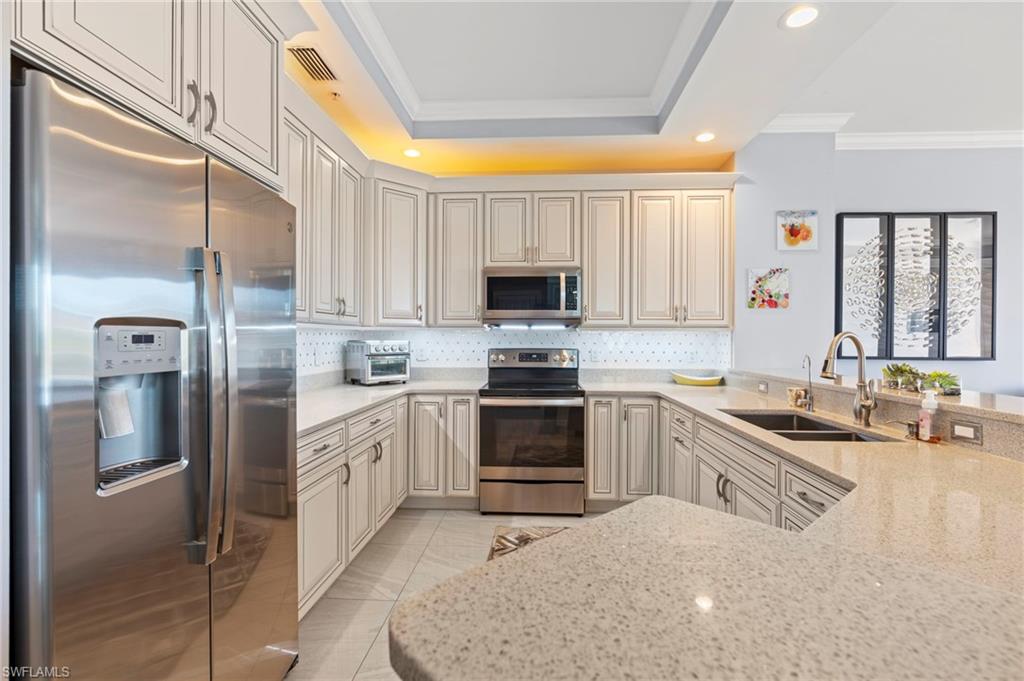 Experience luxury living in this elegant 3rd-floor end unit, that is PET FRIENDLY FOR DOGS UP TO 50LBS and conveniently accessible via elevator. Boasting 3 bedrooms, 3 baths, and a versatile great room perfect for a home office or formal dining, this spacious residence offers the ultimate in comfort and style. Enjoy the convenience of 2-car garage parking and a private storage unit. This home has been completely remodeled throughout, featuring high ceilings, sleek porcelain flooring, and timeless plantation shutters. The gourmet kitchen shines with stainless steel appliances, while crystal lighting and exquisite decor add a touch of sophistication. Impact windows throughout provide added security, and peace of mind. A full-size laundry room and a huge tiled lanai provide practicality and space for relaxation. Don’t miss this stunning retreat!