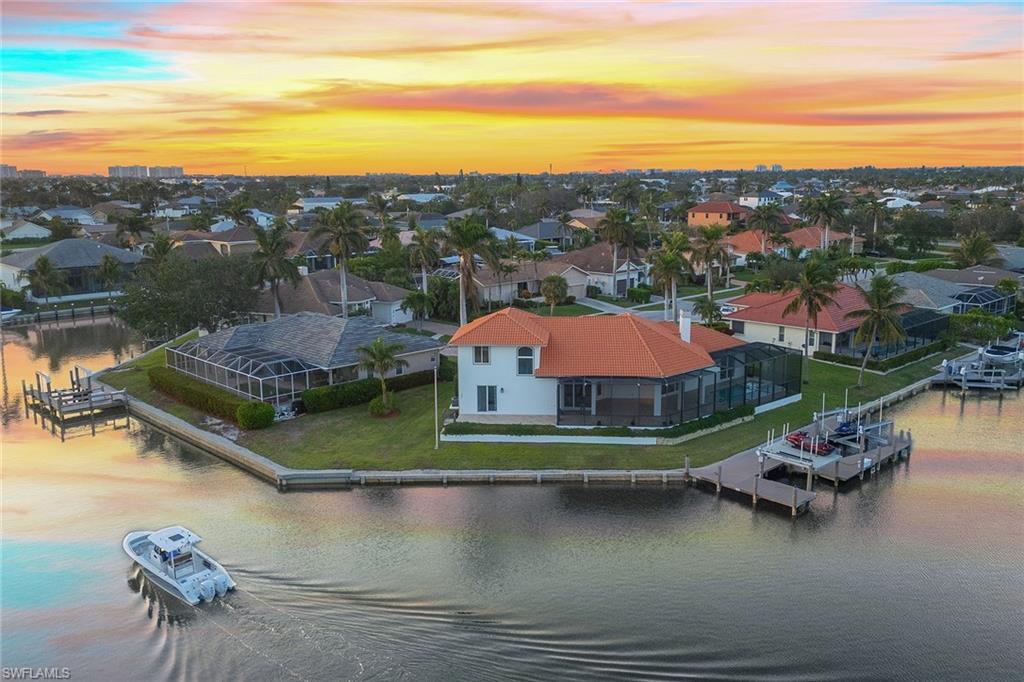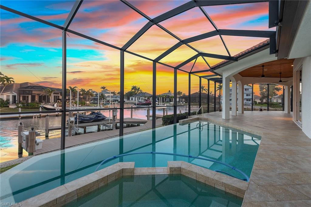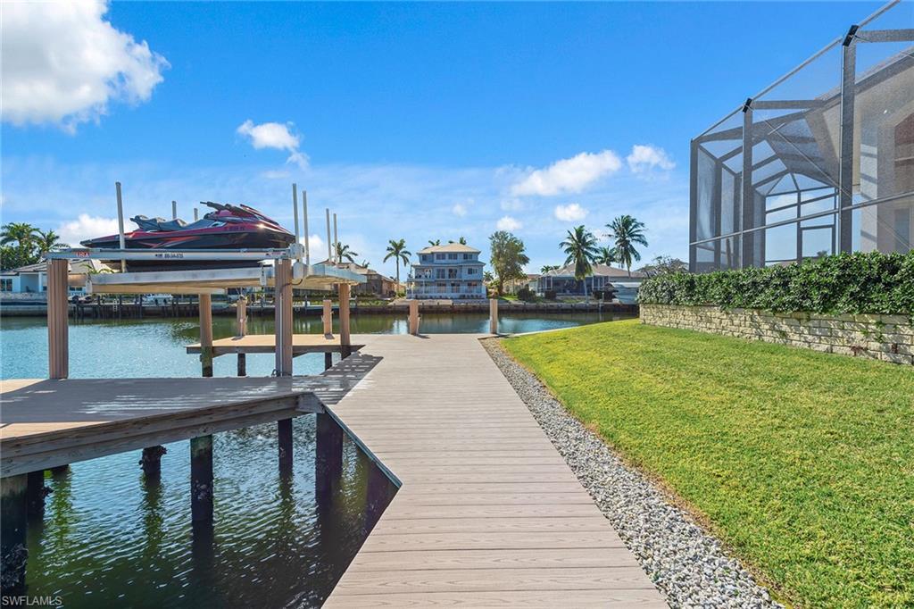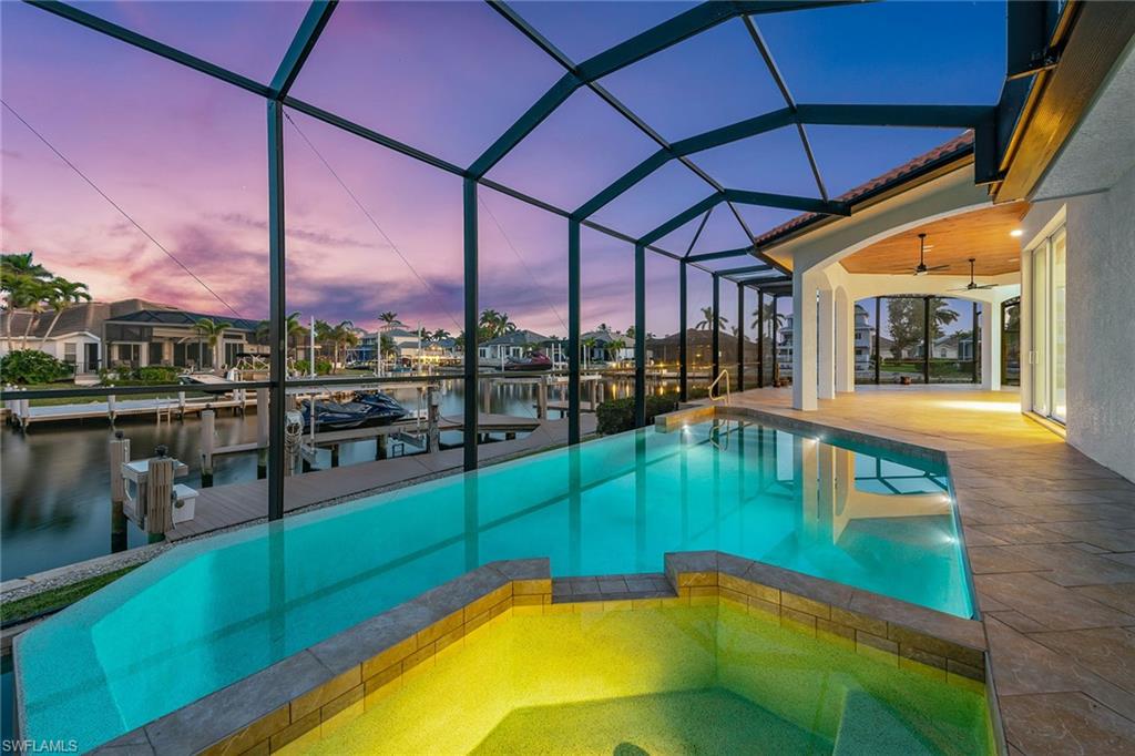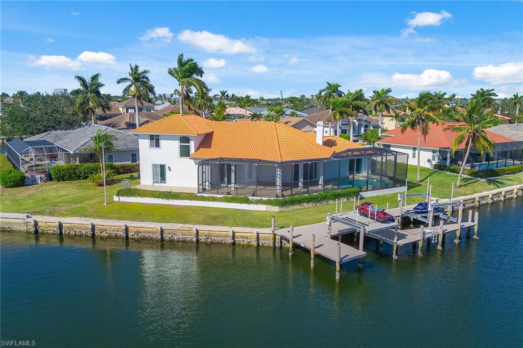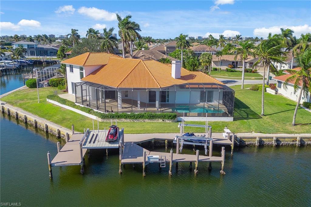 Beautiful southeastern tip-lot location with over 160 feet of indirect waterfront frontage with panoramic, converging waterway views. This 2014-built residence features over 3,100 square feet of open living space on two levels with four bedrooms plus a den, four full baths and two half baths with an additional workout/hobby room, great room with fireplace, impact glass throughout and more. Enjoy the hot Florida sun and salty air from your spacious screened-in lanai with a heated negative-edge pool/spa or the open patio overlooking your large dock with multiple lifts for your boat and wave runners. Recent updates: new refrigerator, hot water heater (2024), exterior/first-floor painting (2024), pool pump (2024), second-floor A/C (2021). This home is centrally located on the island and is within walking distance to the YMCA, schools, area parks and 2 miles to Residents' Beach.