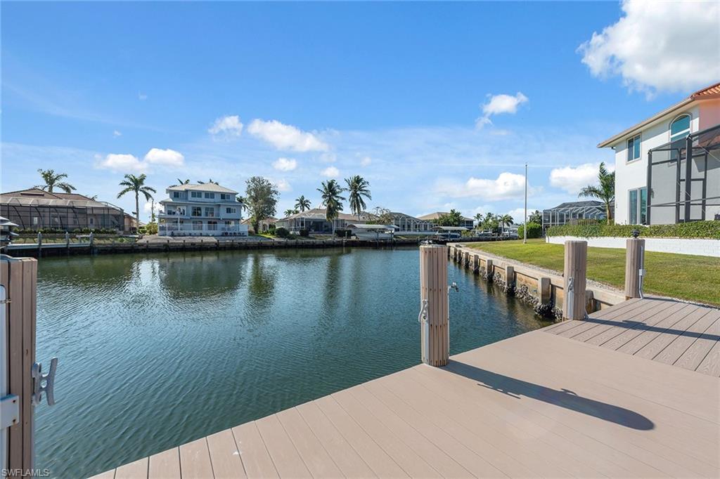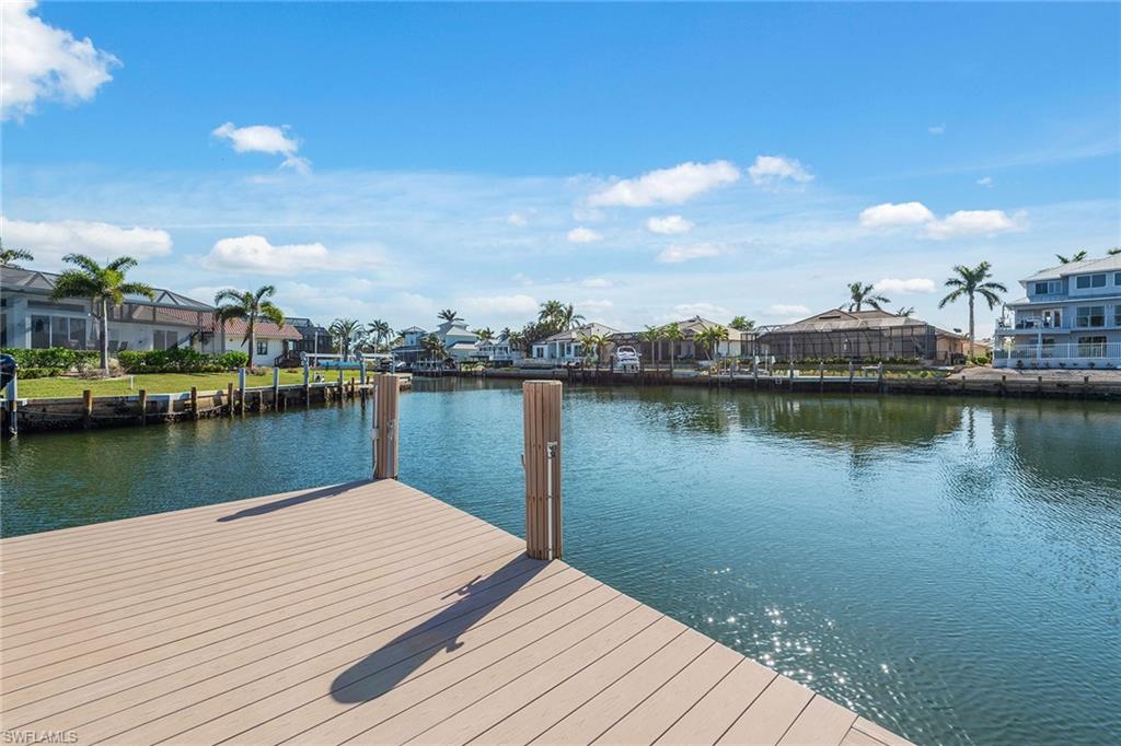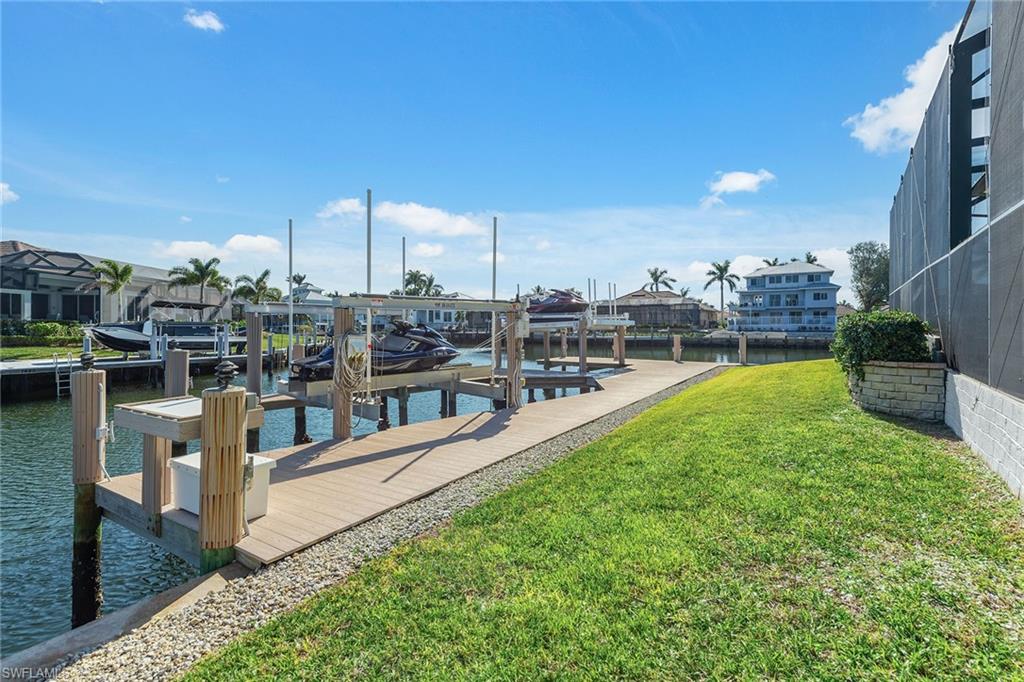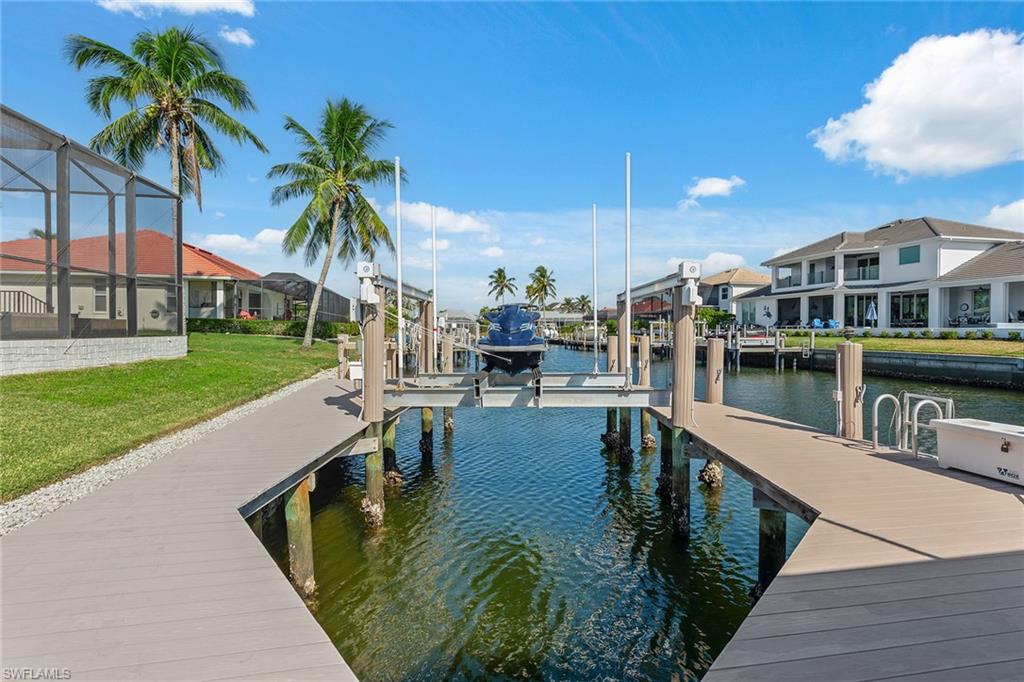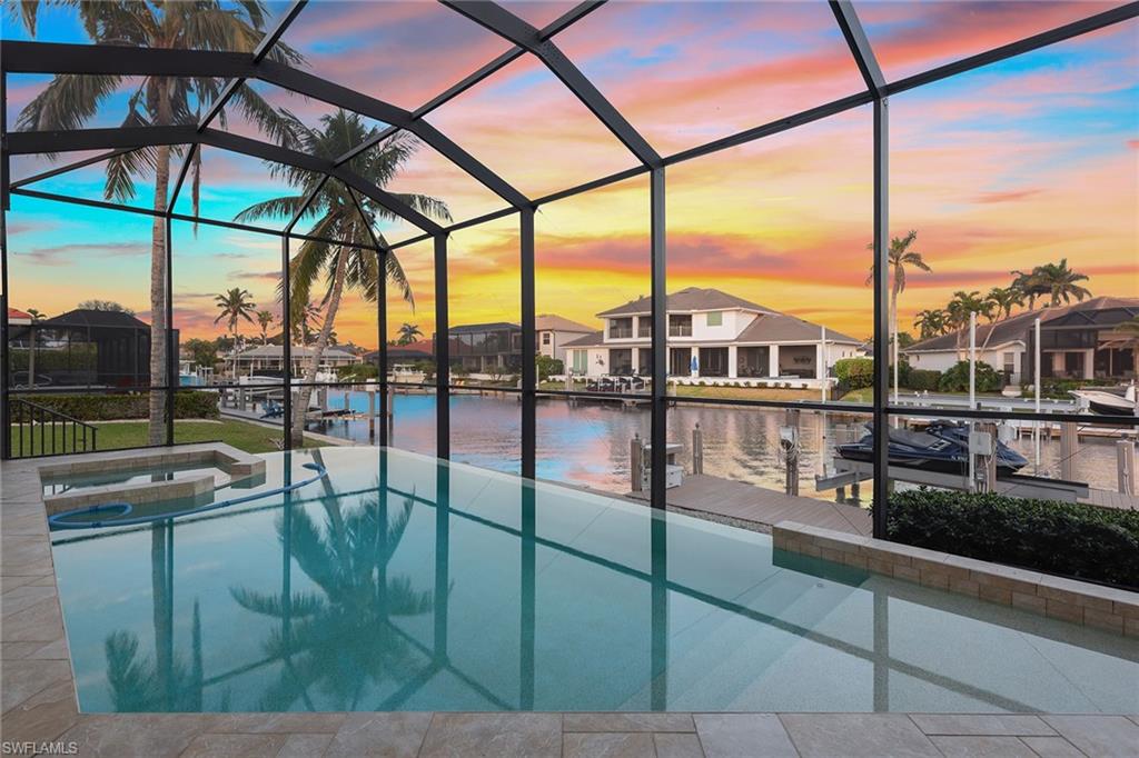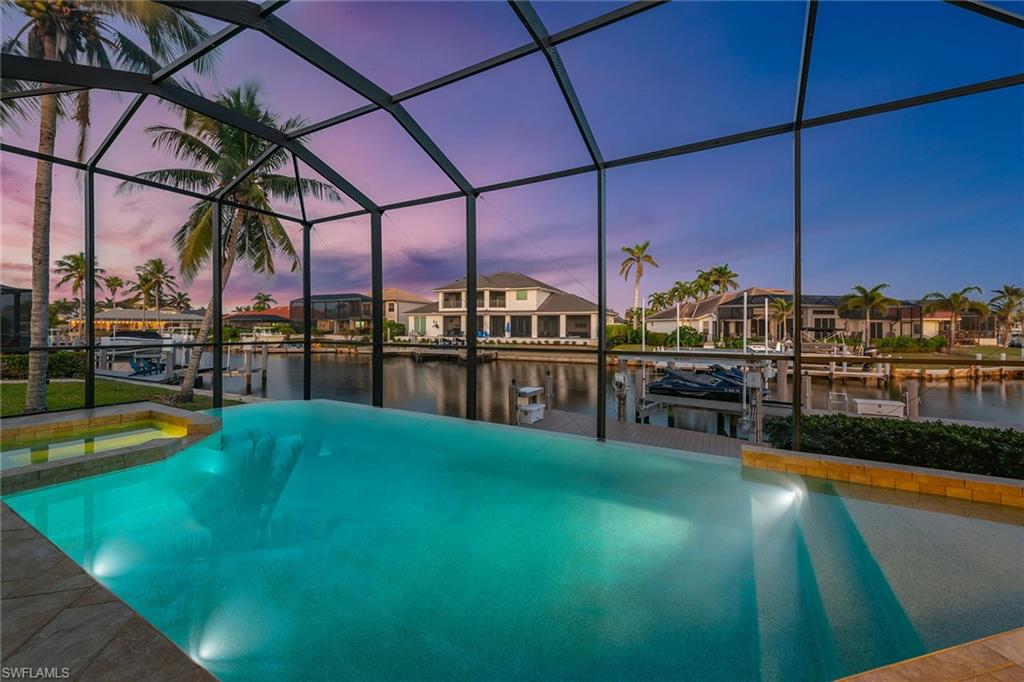 Beautiful southeastern tip-lot location with over 160 feet of indirect waterfront frontage with panoramic, converging waterway views. This 2014-built residence features over 3,100 square feet of open living space on two levels with four bedrooms plus a den, four full baths and two half baths with an additional workout/hobby room, great room with fireplace, impact glass throughout and more. Enjoy the hot Florida sun and salty air from your spacious screened-in lanai with a heated negative-edge pool/spa or the open patio overlooking your large dock with multiple lifts for your boat and wave runners. Recent updates: new refrigerator, hot water heater (2024), exterior/first-floor painting (2024), pool pump (2024), second-floor A/C (2021). This home is centrally located on the island and is within walking distance to the YMCA, schools, area parks and 2 miles to Residents' Beach.