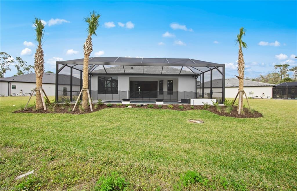 New construction home available now! This Layton 3-car garage, 3 bath+den, screened stunning custom pool and spa home is on one of, if not thee best lots in Terreno. This gem sits within a cul-de-sac and has south facing views of the golf course and lake. Must see in person! This home has been built with a ton of upgrades including: enlarged owner's shower with dual showerheads, separate entry to the screened in lanai from owner's suite, full laundry upgrade including cabinets/countertops with a utility sink, tray ceiling in the enclosed flex room, group 4 countertops, group 5 cabinets, stainless steel appliances including KA 48" built-in refrigerator, floor outlets, under cabinet lighting, pendant pre-wiring, epoxy flooring finish and stucco on walls in garage & more. Terreno by DiVosta is a gated community offering a resort lifestyle with open floor plans, gourmet kitchens, and large outdoor living spaces. For those looking for resort lifestyle communities with private amenities and modern houses, or luxury homes for sale in Naples, FL, Terreno should be your top choice. Neighborhood features include 15,000 sq. ft. grand clubhouse with large community room for events, catering kitchen, state-of-the-art fitness center, exercise studio, 8 pickleball courts, 2 tennis courts, dog park, playground, firepit lounge, dog park, resort style pool, lap lanes, heated spa, full-service restaurant bar & grill, food truck drive-up, 18-hole public golf-course with golf-cart path next door & more!