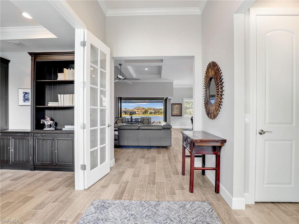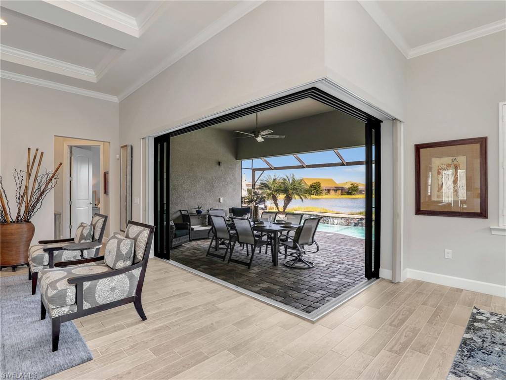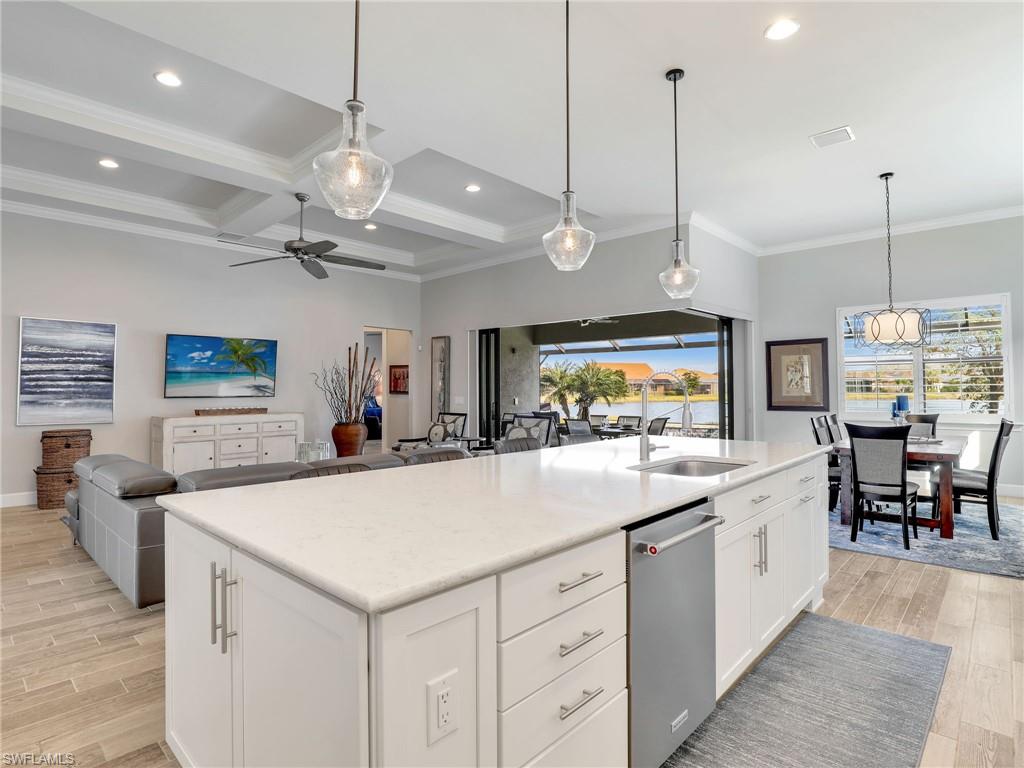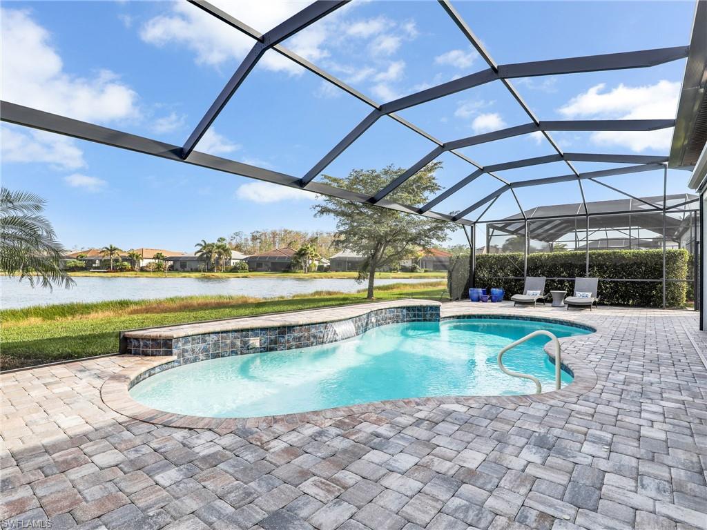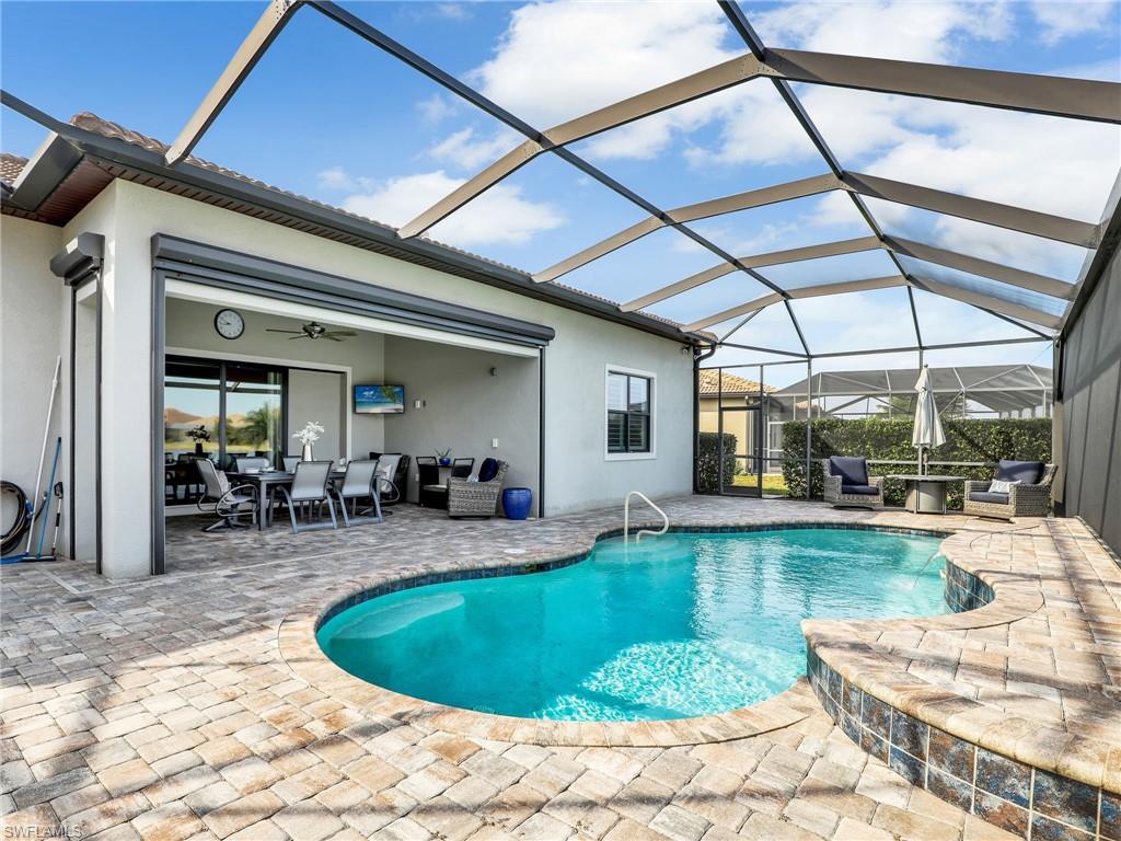 FULLY FURNISHED POOL HOME CAN BE YOUR WINTER RETREAT THIS WINTER SEASON! 3 FULL BEDROOMS + DEN (including one full ensuite), 3 FULL BATHS, 3-CAR EXTENDED GARAGE WITH AC, NEW AC SYSTEM, WHOLE HOUSE GENERAC GENERATOR so you never lose electricity, HURRICANE IMPACT WINDOWS & DOORS, EXTENDED LANAI WITH PICTURE VIEW SCREEN plus more notable upgrades such as patio roll down storm screen, crown molding, plantation shutters, zero corner slider w/privacy sheers and wood-look tile flooring throughout (no carpet). Enter through double entry glass doors into a well appointed neutral interior with an open living concept perfect for entertaining. Gourmet kitchen includes an oversized island, built-in KitchenAid appliances, quartz countertops, 42"wood cabinets with soft close, pullout shelving and finished pantry for organized storage. Enjoy true indoor/outdoor living with the zero corner slider right off the dining area perfect for easy entertaining, spacious primary bedroom. oversized walk-in closet with built-in shelving, dual sinks, quartz counters and extended walk-in shower with bench seating. Two additional guest bedrooms offering one as an ensuite for more guest privacy. Corkscrew Shores is a gated, resort-style lake front community with clubhouse, full-service restaurant & bar, pickleball, tennis, bocce, fishing pier, kayak/canoe launch, organized activities & events and a sparkling 240-acre lake at the heart of the community. Located close to Coconut Point Mall, Gulf Coast Town Center, Miromar Outlets, Hertz Arena, FGCU and SWFL airport for easy travel. Estero is the hottest growing area in SWFL, nestled between Naples and Fort Myers. NO CDD FEES, NO FLOOD ZONE AND NO MANDATORY CLUB FEES.