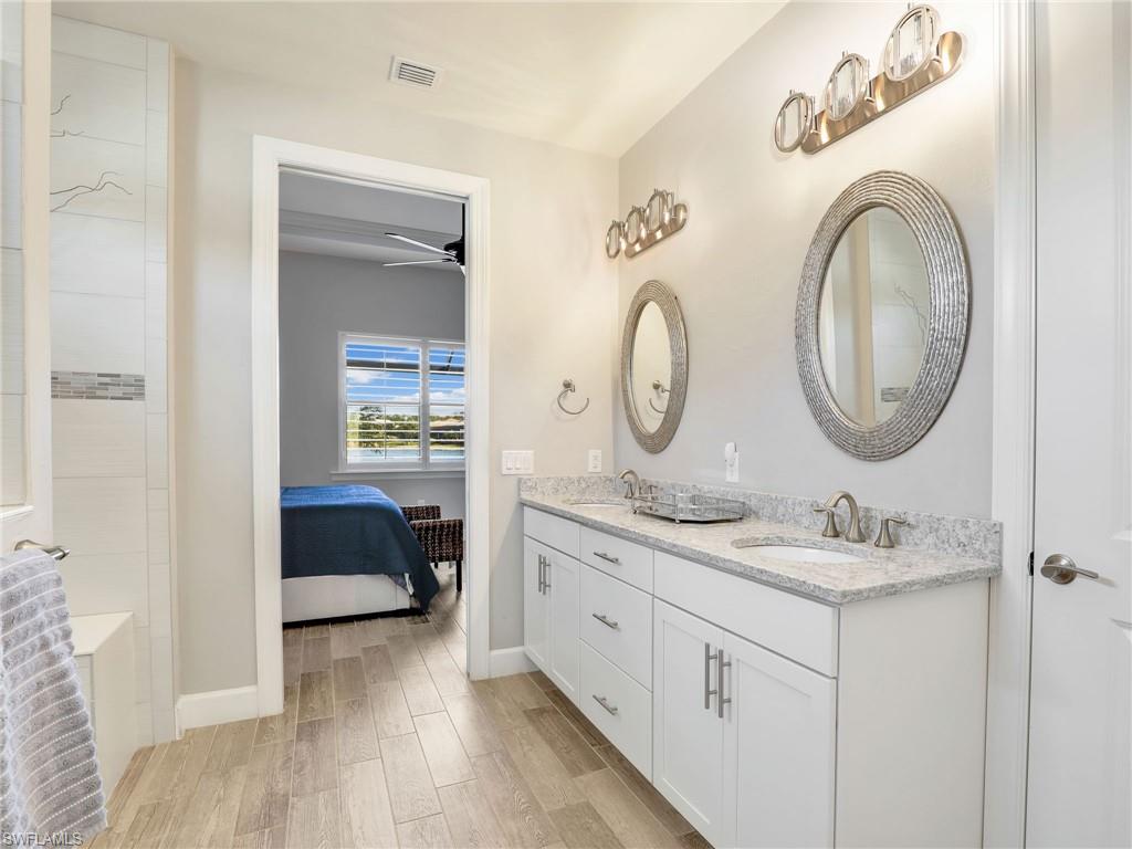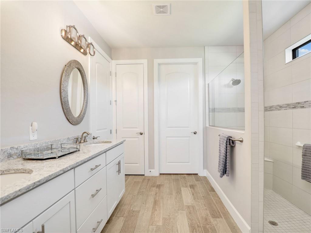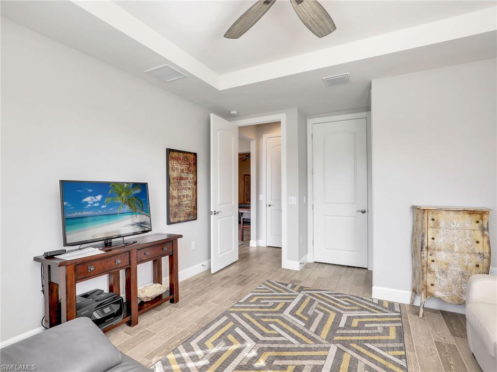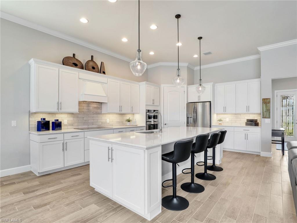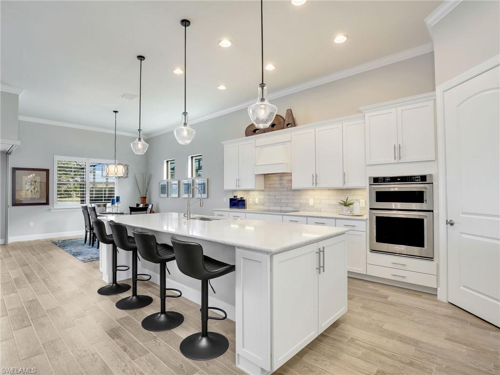 FULLY FURNISHED POOL HOME CAN BE YOUR WINTER RETREAT THIS WINTER SEASON! 3 FULL BEDROOMS + DEN (including one full ensuite), 3 FULL BATHS, 3-CAR EXTENDED GARAGE WITH AC, NEW AC SYSTEM, WHOLE HOUSE GENERAC GENERATOR so you never lose electricity, HURRICANE IMPACT WINDOWS & DOORS, EXTENDED LANAI WITH PICTURE VIEW SCREEN plus more notable upgrades such as patio roll down storm screen, crown molding, plantation shutters, zero corner slider w/privacy sheers and wood-look tile flooring throughout (no carpet). Enter through double entry glass doors into a well appointed neutral interior with an open living concept perfect for entertaining. Gourmet kitchen includes an oversized island, built-in KitchenAid appliances, quartz countertops, 42"wood cabinets with soft close, pullout shelving and finished pantry for organized storage. Enjoy true indoor/outdoor living with the zero corner slider right off the dining area perfect for easy entertaining, spacious primary bedroom. oversized walk-in closet with built-in shelving, dual sinks, quartz counters and extended walk-in shower with bench seating. Two additional guest bedrooms offering one as an ensuite for more guest privacy. Corkscrew Shores is a gated, resort-style lake front community with clubhouse, full-service restaurant & bar, pickleball, tennis, bocce, fishing pier, kayak/canoe launch, organized activities & events and a sparkling 240-acre lake at the heart of the community. Located close to Coconut Point Mall, Gulf Coast Town Center, Miromar Outlets, Hertz Arena, FGCU and SWFL airport for easy travel. Estero is the hottest growing area in SWFL, nestled between Naples and Fort Myers. NO CDD FEES, NO FLOOD ZONE AND NO MANDATORY CLUB FEES.