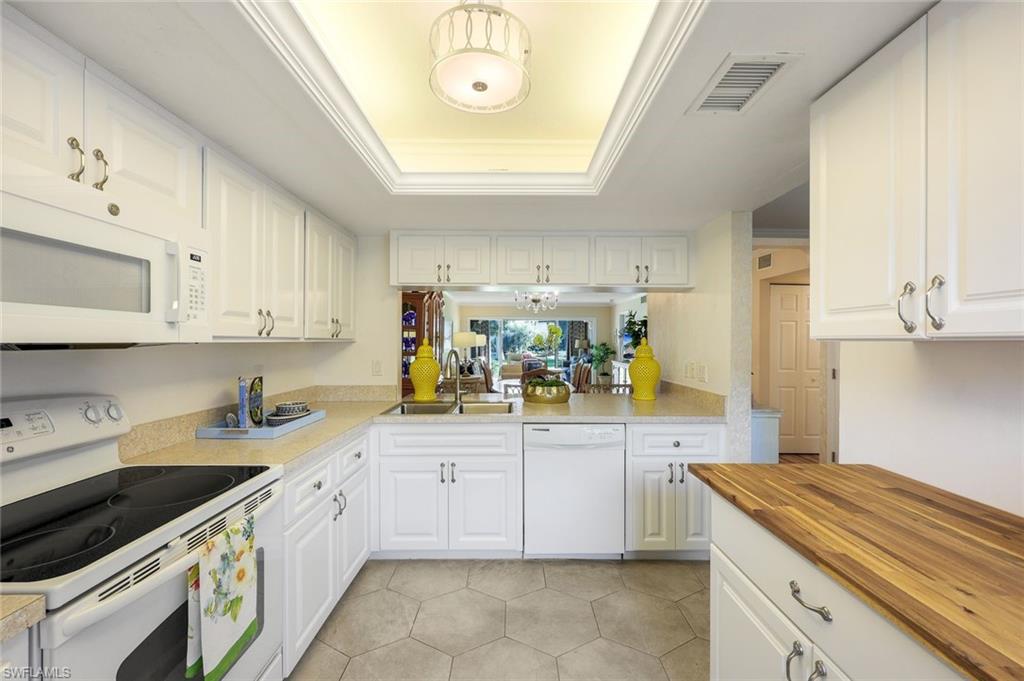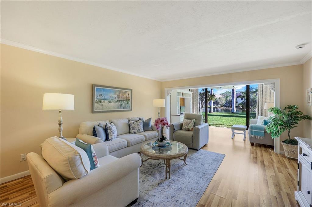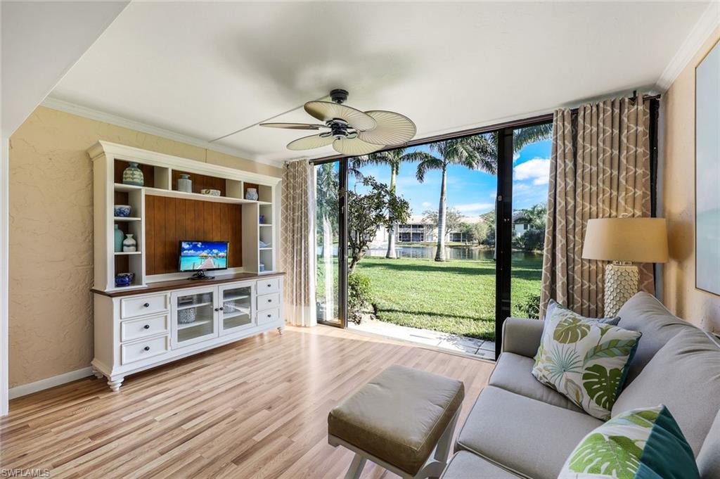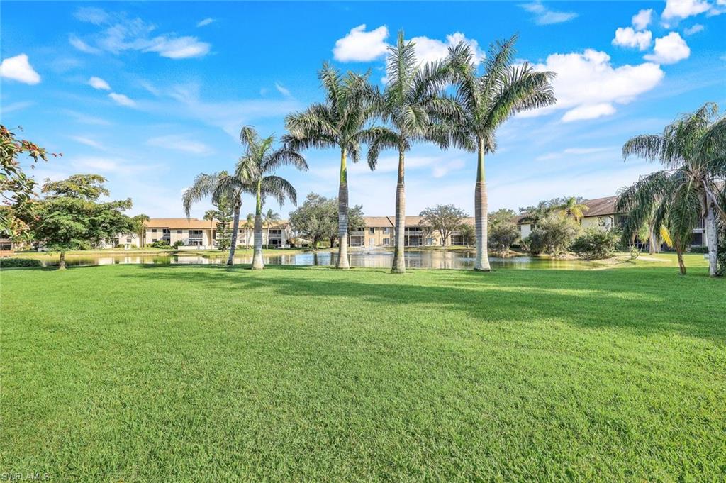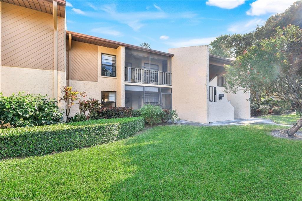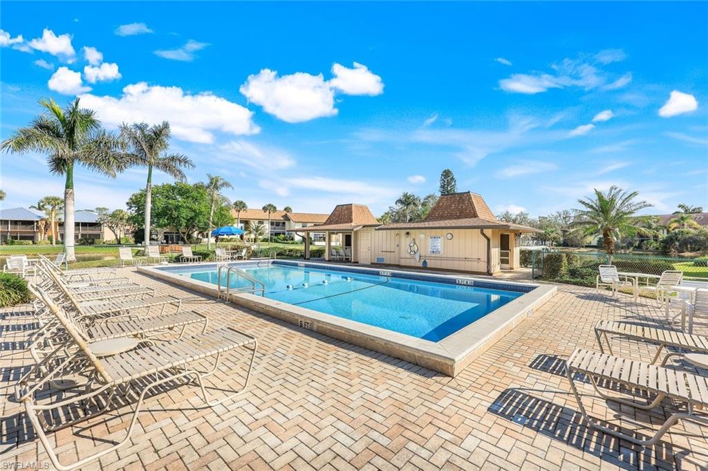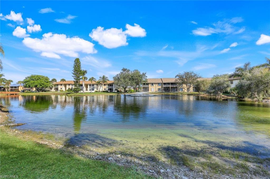 Bright and inviting condo in Palm River, a 55+ North Naples Community! Discover your perfect Florida lifestyle home in this sunny first-floor 2-bedroom + den, 2-bathroom condo that offers a welcoming and spacious layout and is beautifully updated to combine modern comfort with timeless style. Step inside to find luxury vinyl flooring, an expansive kitchen with newer appliances, abundant cabinetry, and a generously sized ensuite primary bedroom featuring a walk-in closet. This spacious condo is move-in ready and includes beautiful, newer designer furniture for a seamless transition into to your new lifestyle. Enjoy hosting or relaxing by the wet bar that extends your living space ending with a sliding glass wall that opens to breathtaking lake and fountain views. With generous indoor and outdoor storage, this home offers convenience at every turn. The active and friendly community is designed for a vibrant lifestyle. Residents enjoy a large community pool, bocce ball, shuffleboard courts, and an outdoor grilling area. New roof in 2024, adding to the value and appeal of this community. Ideally located, Courtwood provides easy access to I-75, Mercato for shopping and dining, Trader Joe’s, Whole Foods, top-rated local hospitals, and is less than 5 miles from the Gulf of Mexico’s beautiful beaches. This property also features a covered carport and is situated in a no-flood zone, ensuring peace of mind.
