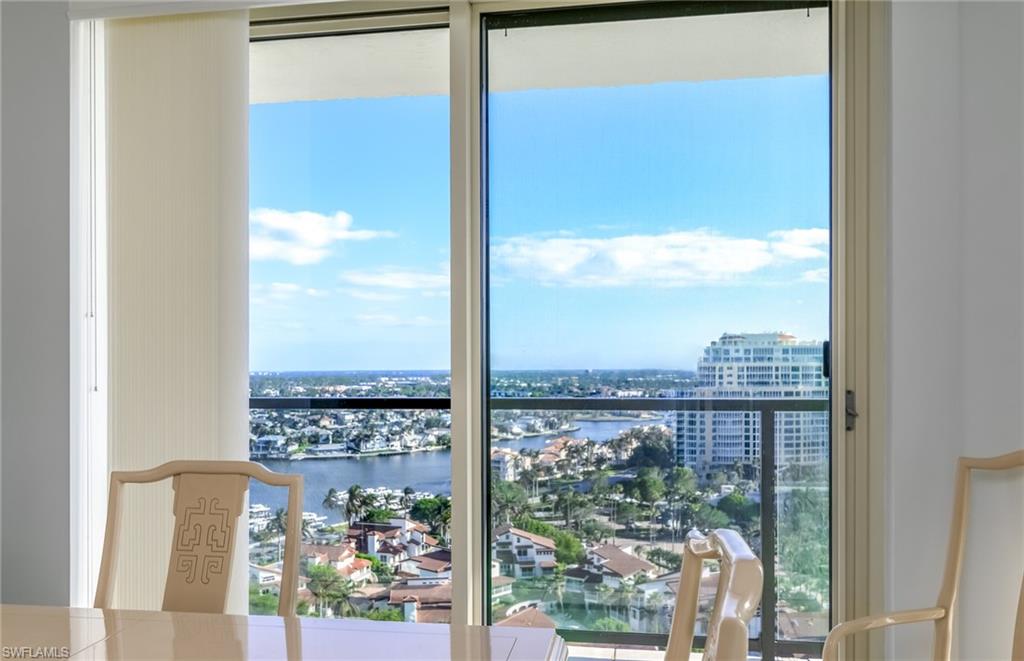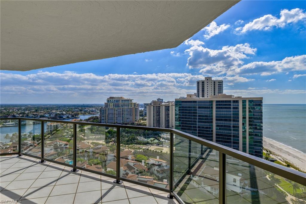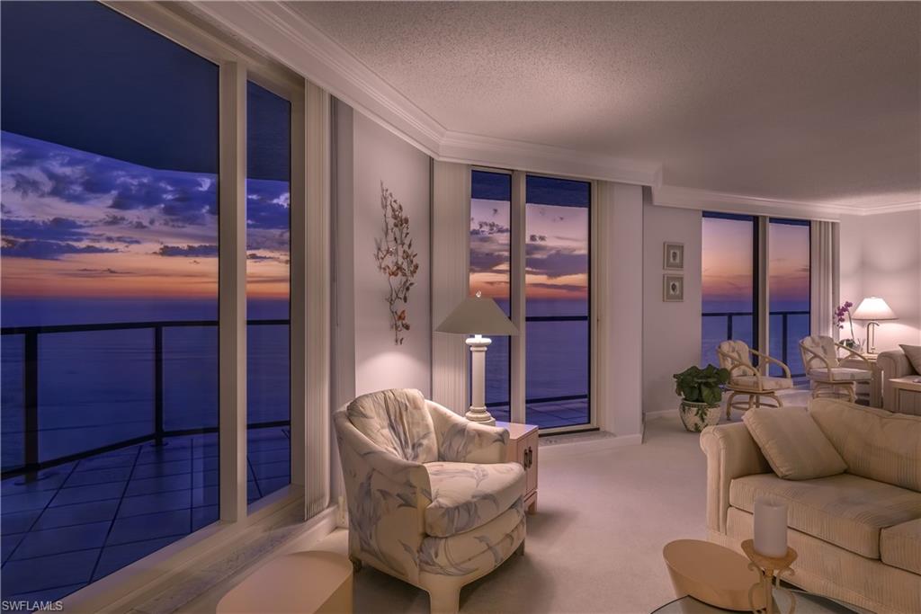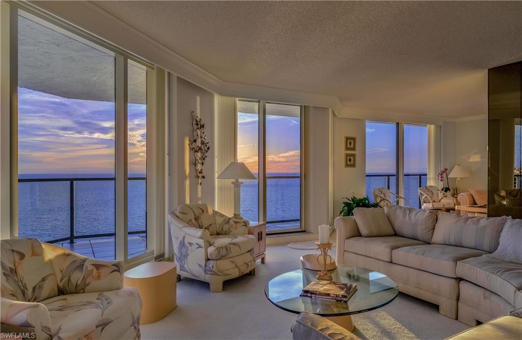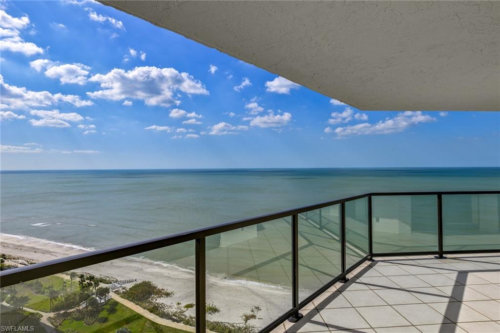 The 04 stack in Meridian Club offers one of the most breathtaking views of the Gulf of Mexico and Venetian Bay and is highly sought after and rarely available. With 80’ of continuous open-air balcony, the Southwest corner location offers sweeping Gulf views by day and twinkling city lights by night over Moorings Bay. This 2 bedroom + Den/3 bath residence features a wonderfully spacious circular floor plan and lanai access from every room. Floor-to-ceiling impact glass sliders and balcony glass railings give you unobstructed views of the sunrise and sunset all year. Situated in the beautiful garden environment of Park Shore, you have direct access to Naples' white sand beaches and the mile-long boardwalk, traversing the development's length. The Meridian Club is a non-atrium building with only four units per floor and is one of the most private boutique environments directly on the beach. Continued updates to the common areas, including the recent renovation of the elevator lobbies on each floor, have helped Meridian Club stay fresh and inviting! Amenities include an expansive pool deck w/hot tub, chickee bar, bathhouse & grills, tennis/pickleball courts, fitness center, social room, and library. The property is gated with a w/24/7 guard at the building entrance, has onsite management, and is pet-friendly. Minutes from Venetian Village, Waterside, & Downtown. Don't miss this opportunity to experience why Meridian Club is singularly unique!