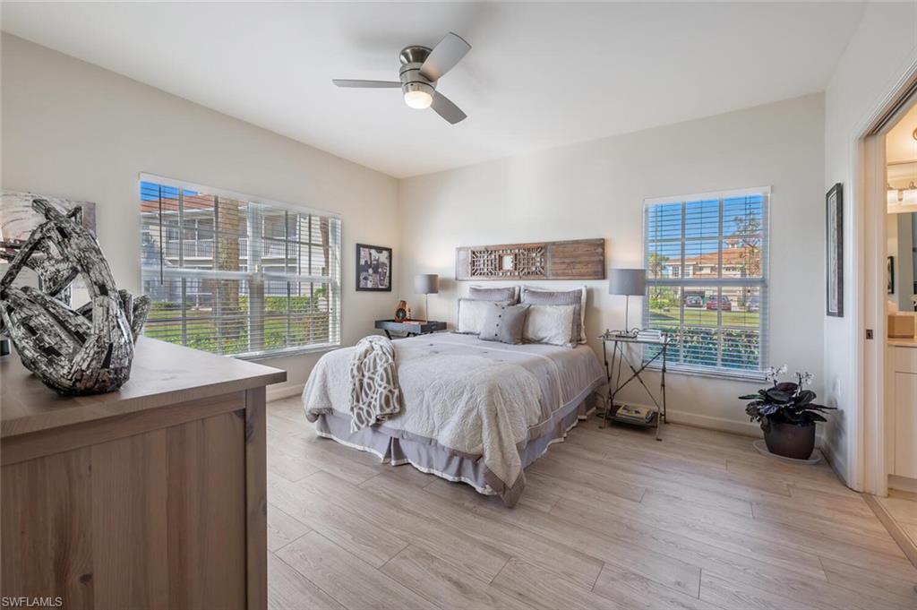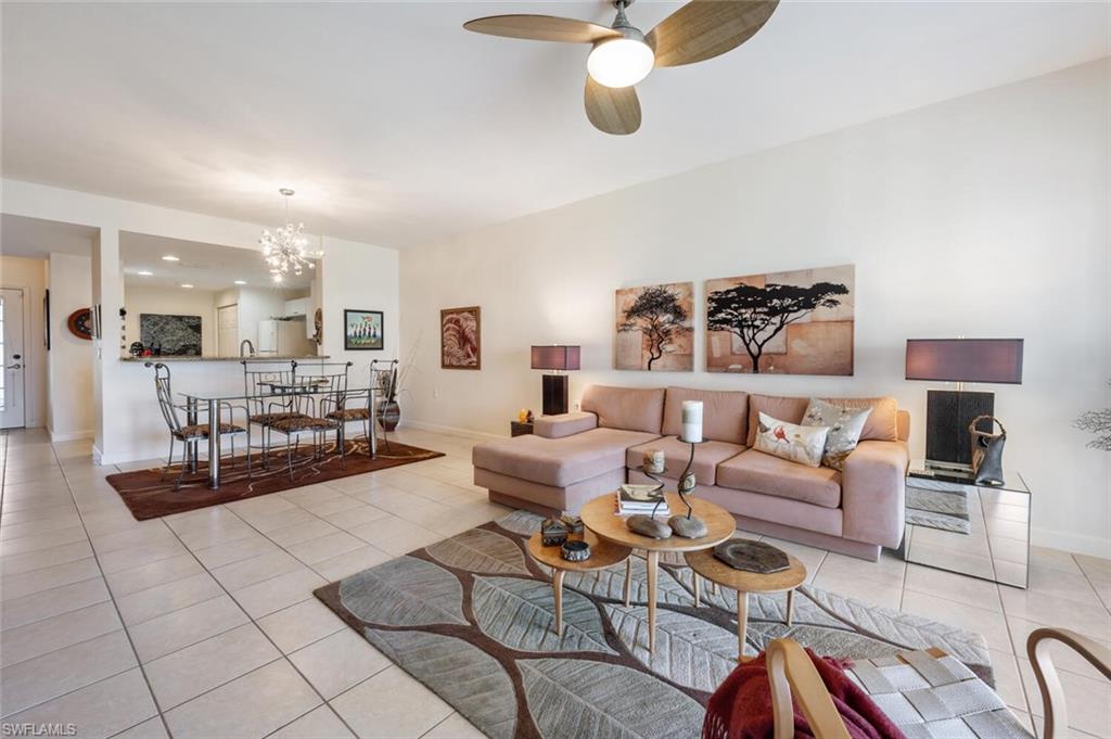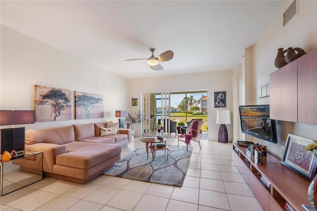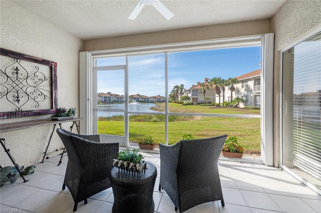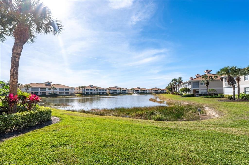 GLISTENING WATER VIEWS from this first floor lake front END residence! Light & bright turnkey furnished 3 bedroom, 2 bath garden condo featuring tile in all main areas, laminate "wood look" flooring in bedrooms, walk in shower in the master bath with separate dual vanities, accordian shutters on the lanai and entry, a detached garage and more! Green space next door and guest parking nearby which is a big plus! Amenities and social opportunities abound in Bridgewater Bay with a resort style pool and spa, screened lap pool, fitness center, pickleball courts, tennis courts, bocce courts, basketball court, billiards, card/reading room and more! The bonus is the availability of an extra large fenced lot for RVs, boats & trailers, etc. for a reasonable annual fee to Owners. Enjoy easy access to both Airport Pulling and Livingston Roads for quick trips to Waterside Shops and Mercato, elegant and casual restaurants, the beautiful beaches of Clam Pass, Vanderbilt Beach and Wiggins Pass State Recreational State Park and world class golf courses, all just minutes away. Come experience the Florida lifestyle!