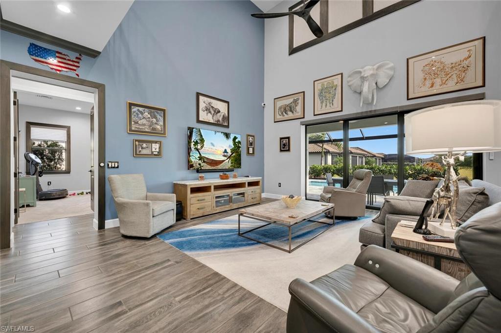 Motivated Seller!! Spectacular Custom Estate Home built in 2022 with over $500K Custom Luxury Upgrades makes this one of the most desirable homes in the award-wining community of The Place at Corkscrew. Step inside to luxury and live the ultimate Florida Lifestyle in this incredible Heatherton floor plan built by Pulte Homes featuring over 4,200 sq ft under air with additional oversized outdoor living space with panoramic screens enhancing the pristine sunset and lake views. No detail overlooked when appointing this beautiful home w/ custom upgrades including impact resistant windows/sliders, hurricane roll down shades at lanai, whole house water filter and softener, large front porch, 3 car garage extended garage w/ epoxy coated floor, Split System AC, 3 remote controlled hydraulic garage storage systems, and custom side load garage door openers for maximum clearance. The Designer Kitchen is ready to impress with an oversized island, designer lighting, Custom painted cabinetry w/ lots of drawers and storage including soft close doors/drawers, quartz countertops, designer tile backsplash, Kitchen Aid Stainless Appliance pkg, Beverage and Coffee Bar with sink, under counter beverage fridge, and a huge walk-in Pantry. The casual family room includes large sliding doors to the lanai, custom window trim, crown molding, accent wall, surround sound and designer flooring, expansive views of the outdoor living space including pool, spa and lake views. This home boasts 5 bedrooms, 4 bathrooms, a pool bath, customized home office, formal dining room, 3 car air-conditioned garage and golf cart storage area. The impressive Owner’s Suite includes french doors opening to a sitting room and leads to an expansive bedroom with large windows endless views of the lanai and lake. The Owner’s bathroom boasts two walk-in closets, a private water closet, separate sinks and vanities, and custom walk-in shower. California Closets in all Bedrooms, master bath, Office, Pantry, Laundry and Linen and custom floor to ceiling storage cabinets in the back hall from garage. Custom interior painting throughout, custom wood windowsills and window molding, crown molding and frameless glass shower doors in all bathrooms. Mechanical systems have been upgraded Post Builder Product to include Train 20 SER High Efficiency HVAC System, 100 Gallon Hot water Heater, Solar Roof Panels with Energy Savings of more than 80% of the energy use from builder product. The Home is equipped with a Smart Home Comfort and Security Panel, Utility Panel and (7) Security cameras inside and out. Designer lighting and custom Lutron switches throughout the home. Enjoy your OUTDOOR PARADISE where you will entertain friends and family or simply relax surrounded by nature! The expansive lanai includes a custom heated pool and spa with three water features and LED lighting, a custom-built outdoor kitchen, outdoor dining and living area with TV. It is time to LIVE EXTRAORDINARY!