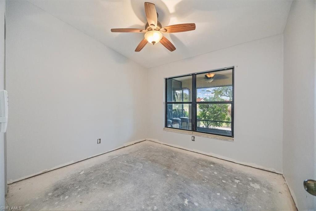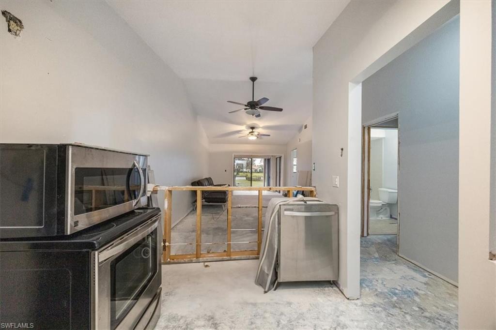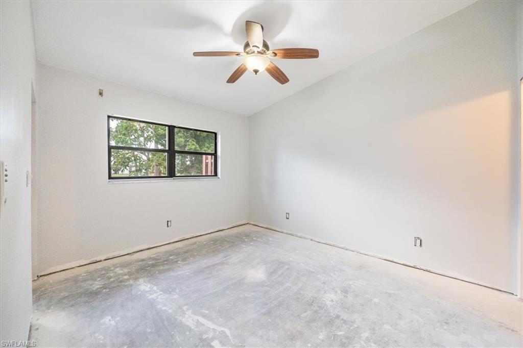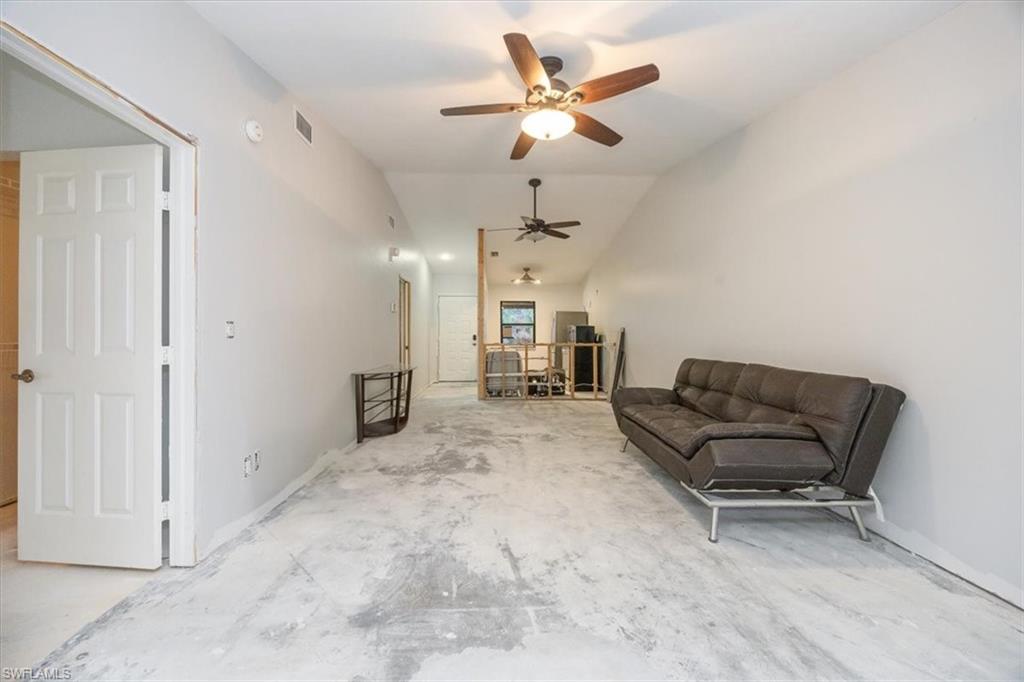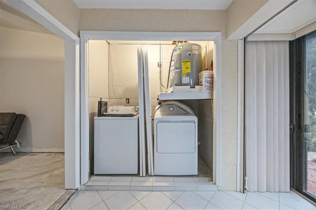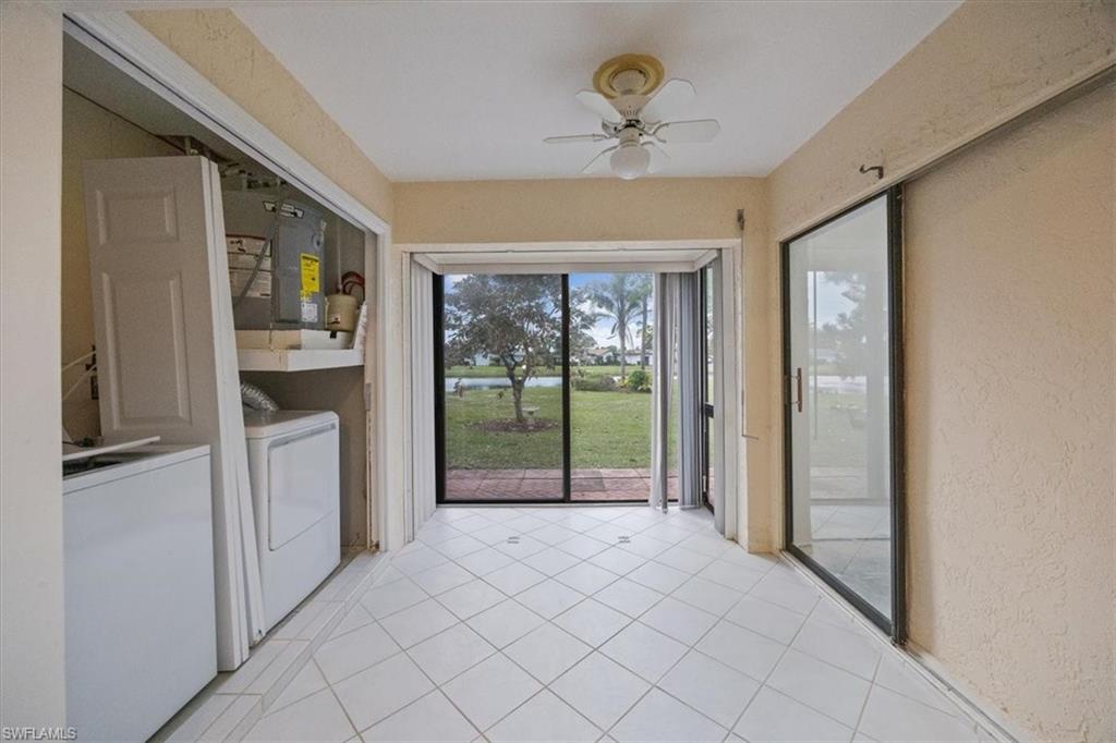 DESIGN YOUR DREAM HOME! This charming 2-bedroom, 2-bath, ground-floor condo presents a unique opportunity to create your ideal living space. Sold in decorator-ready condition, it’s a blank slate waiting for your personal vision! The unit comes with kitchen appliances and a washer and dryer for added convenience. This is an AS-IS sale - needs flooring, cabinetry, door casements, etc. Recent upgrades include new roofs installed in 2022, along with impact windows and roll-down shutters on the lanai for extra peace of mind. Relax on the screened front lanai or unwind on the back patio, which overlooks a serene lake and beautifully maintained grounds. Nestled in the peaceful Boca Ciega Manor community, this low-density neighborhood features tranquil lakes, lush tropical landscaping, and amenities like a community pool and spa. Seize this rare opportunity to customize your home in one of Naples’ most desirable locations!