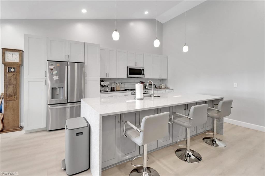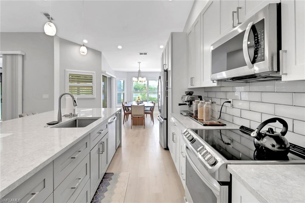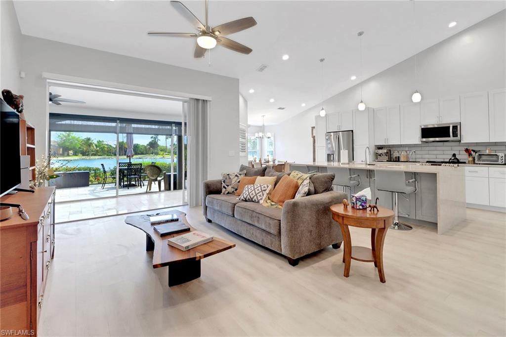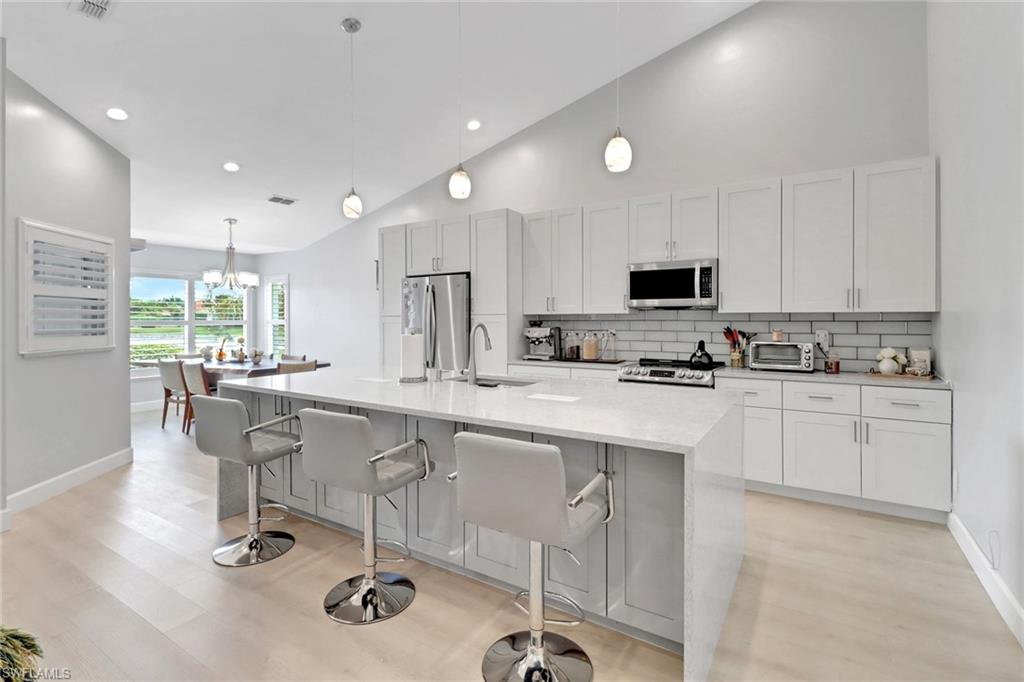 This coveted lakefront home has it all! 3 bedroom, 2.5 bath split floor plan, NEWLY RENOVATED & roof replaced in 2022. Bright with an open floor plan, this distinctive home is adorned with charming architectural detail and is flooded with natural light with rear southern exposure. This home boasts consistent flooring throughout, plantation shutters, custom closets and wall to wall sliders to enhance the lakefront view. The chef’s kitchen has ample storage. You’ll enjoy cooking on all new appliances and a beautiful waterfall quartz custom countertop on the large island. Offers an unobstructed view of the sparkling lake from the common areas and primary bedroom. Primary suite has a spacious a walk-in closet and the bathroom features a large soak in tub, separate shower and double sinks. There is plenty of room to add a pool in the large back yard. Located on a cul-de-sac in desirable Berkshire Lakes, low HOA fees, 15 minutes from downtown Naples and beaches and 5 minutes from the grocery store. A beautiful home for working, entertaining and living the Florida lifestyle! Drop a line in your backyard for catch & release fishing! Start every day feeling like you’re on vacation here!