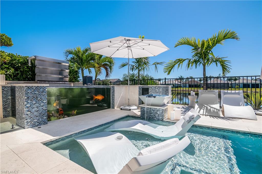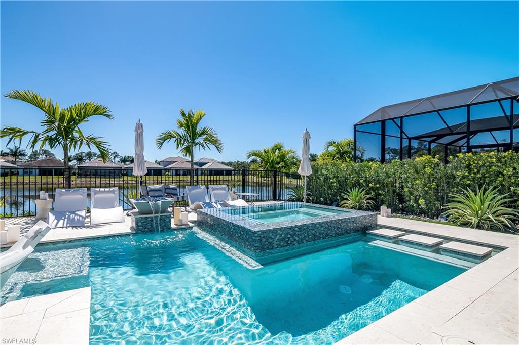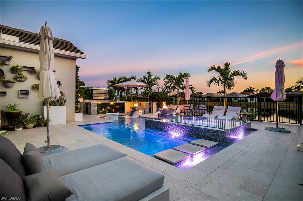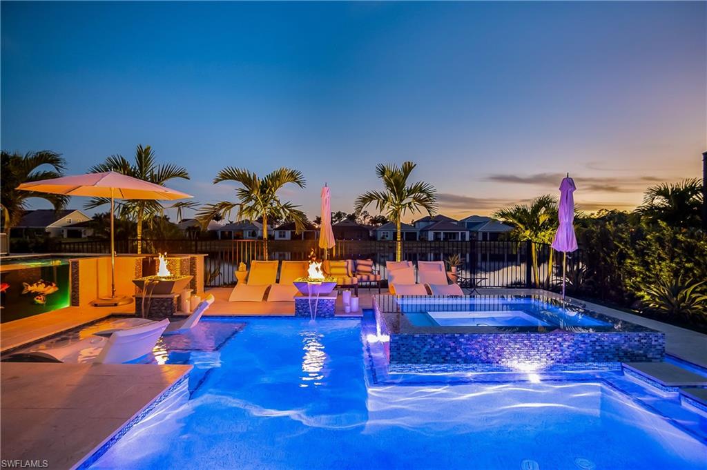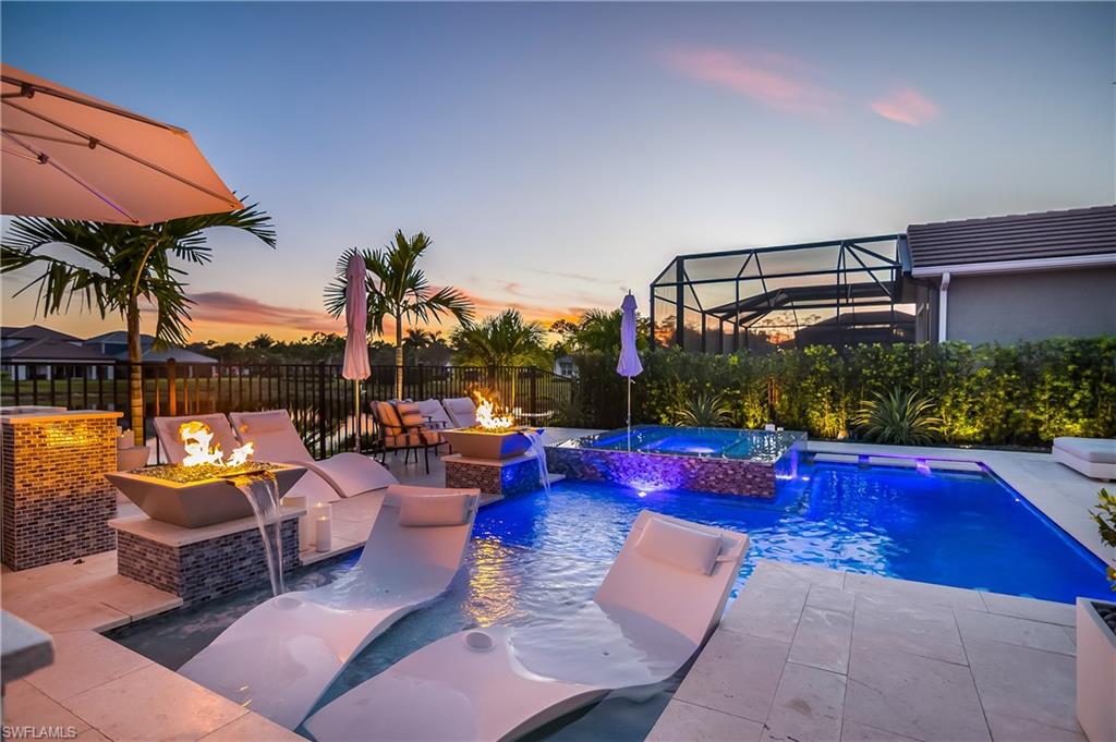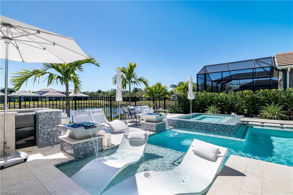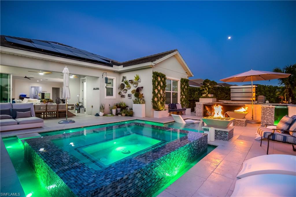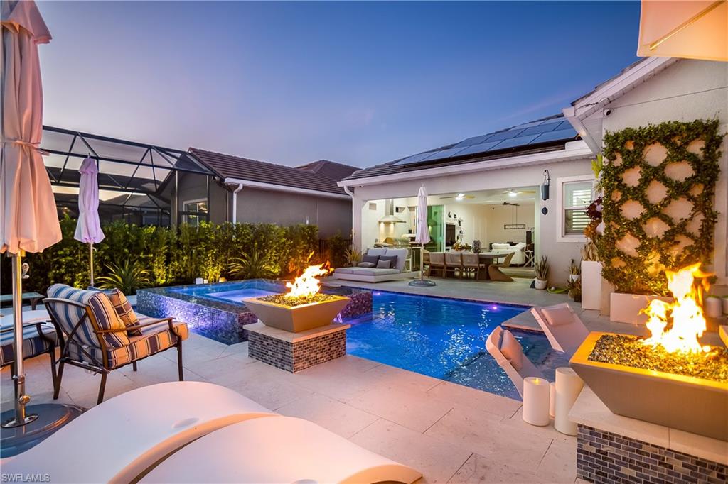 Modern single-story home which allows the ultimate SWFL lifestyle with your own private resort style saltwater heated pool, large custom 10-person spa, Elevated sunbathing deck, poolside full bar including liqueur on-tap, and full outdoor gourmet kitchen. Pool Heater 3x standard capacity for extra fast and extra hot at the touch of a button. Enjoy overlooking the community lake with fountain, as well as your 6000 Gallon Acrylic KOI Pond, makes your outdoor space even more of a tropical oasis. One of only a few homes in community on gas. 900 Gallon tank provides natural gas to both outdoor kitchen, outdoor fire-pits and indoor kitchen range. Home runs a usual FPL bill of $0 with a extra-large 56 panel solar system. Master suite includes oversized walk-in shower with Multiple shower heads and Dual Zone Hot water controls. Master suite also includes extra-large walk-in closet with built in closet organizers. Uplighting and enhanced ambiance lighting by pool and spa. All outdoor pool, spa, fire-pits, and lighting are automated thru remote control or mobile app. Home includes video security system. Come enjoy this beautiful paradise with KOI which attract positive forces and numerous beneficial outcomes. Attic has been set up for extra storage. Home equipped with Hepa air filtration system. Community is centrally located and part of a A+ School System. Close to shopping and beaches.