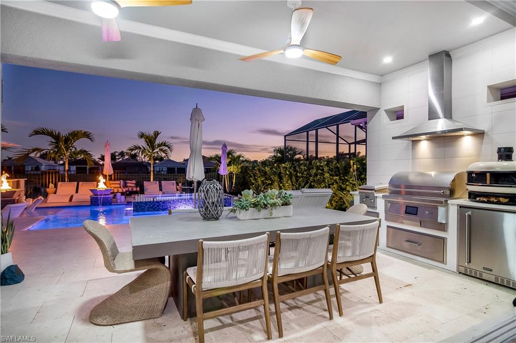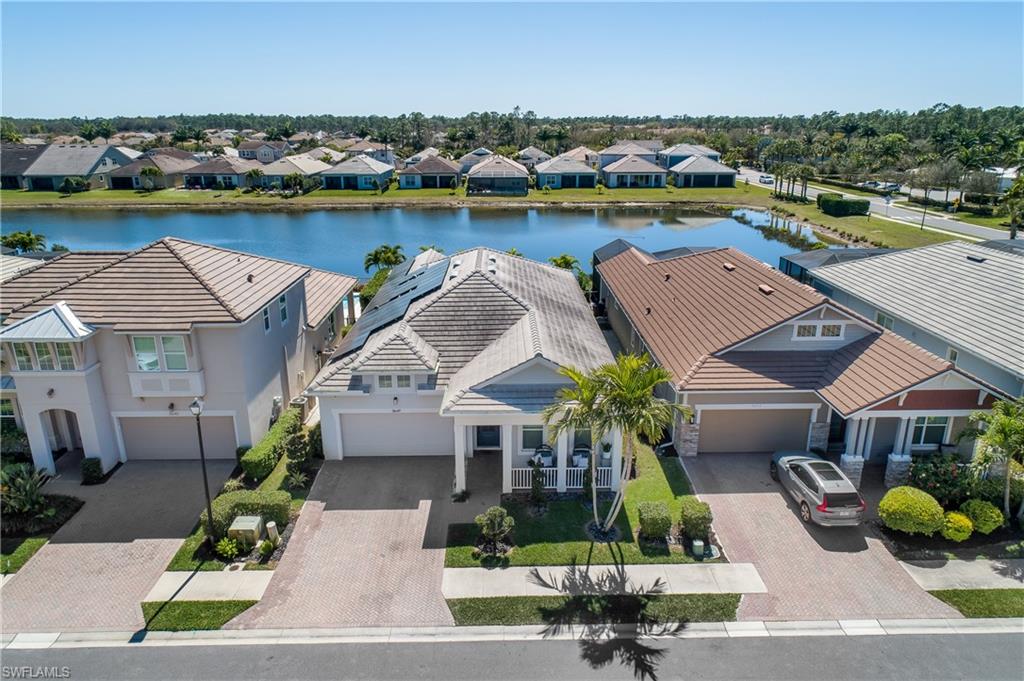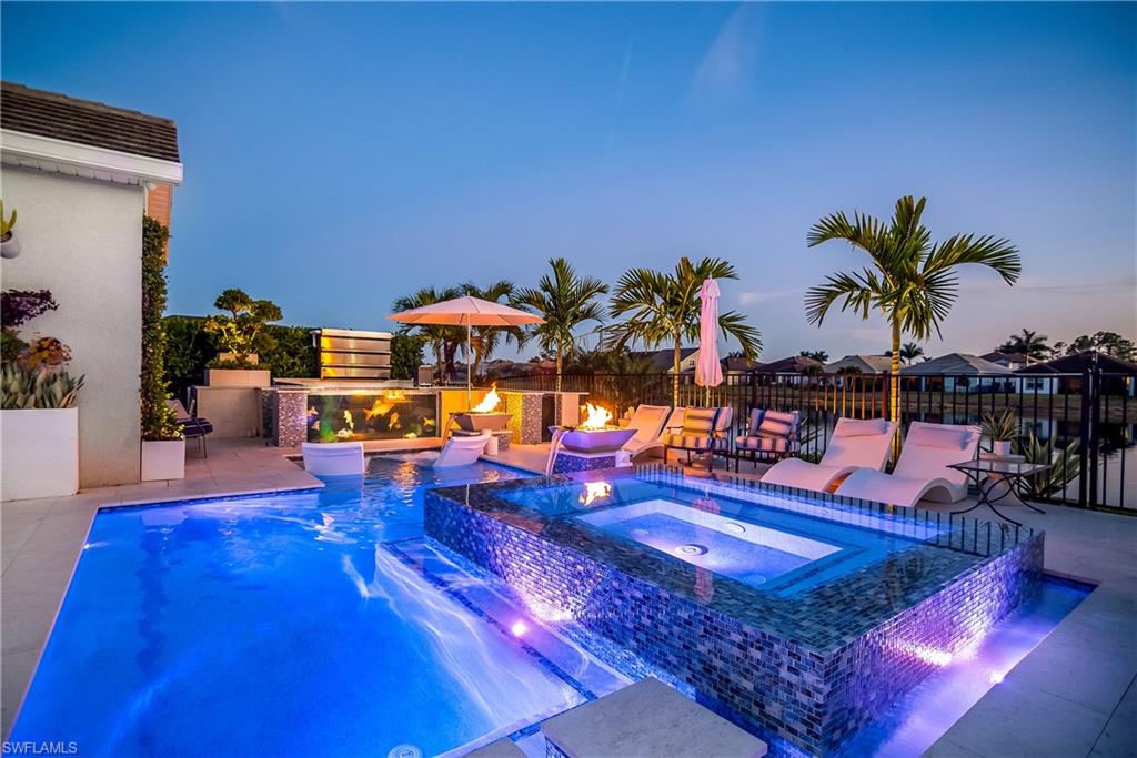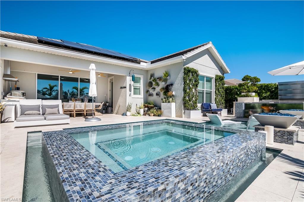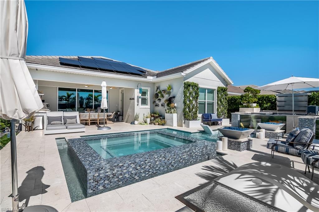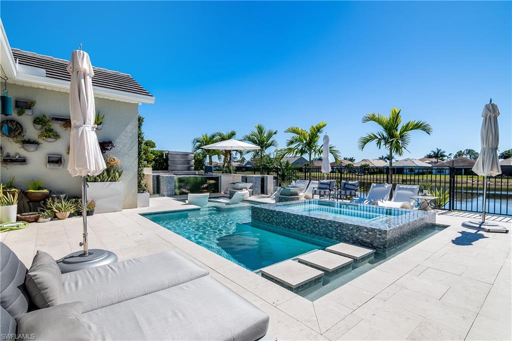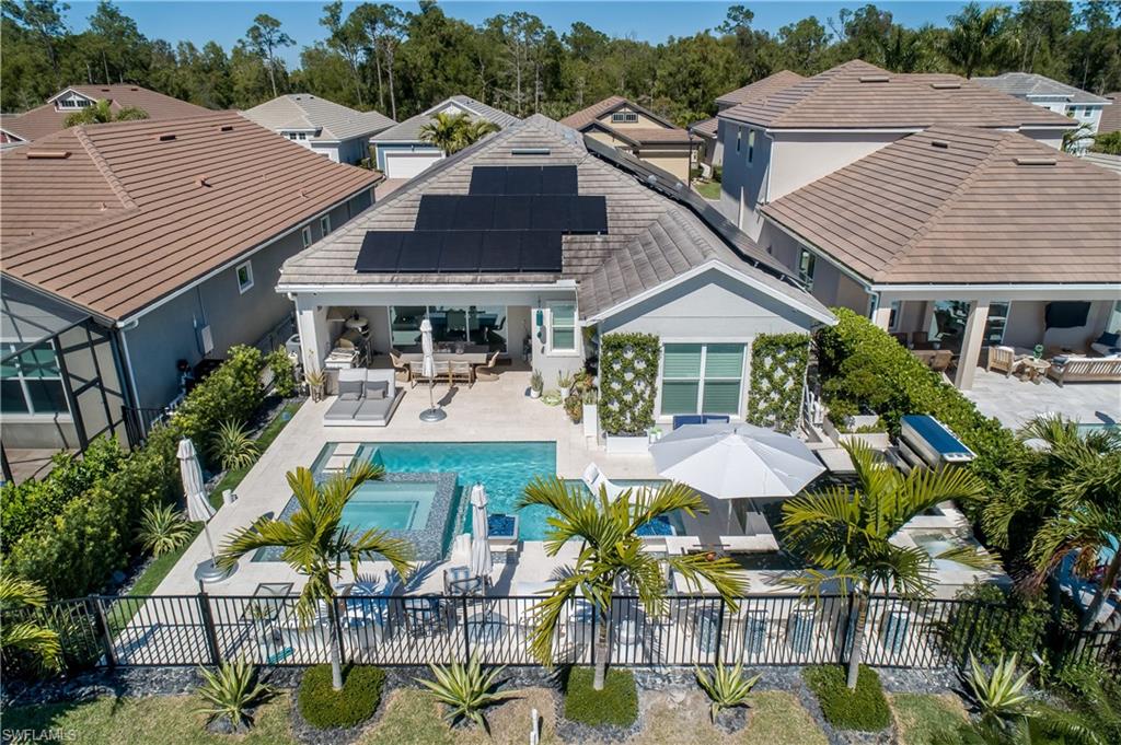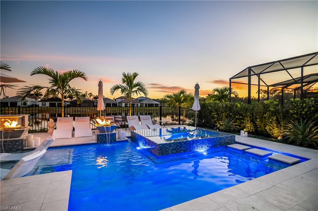 Modern single-story home which allows the ultimate SWFL lifestyle with your own private resort style saltwater heated pool, large custom 10-person spa, Elevated sunbathing deck, poolside full bar including liqueur on-tap, and full outdoor gourmet kitchen. Pool Heater 3x standard capacity for extra fast and extra hot at the touch of a button. Enjoy overlooking the community lake with fountain, as well as your 6000 Gallon Acrylic KOI Pond, makes your outdoor space even more of a tropical oasis. One of only a few homes in community on gas. 900 Gallon tank provides natural gas to both outdoor kitchen, outdoor fire-pits and indoor kitchen range. Home runs a usual FPL bill of $0 with a extra-large 56 panel solar system. Master suite includes oversized walk-in shower with Multiple shower heads and Dual Zone Hot water controls. Master suite also includes extra-large walk-in closet with built in closet organizers. Uplighting and enhanced ambiance lighting by pool and spa. All outdoor pool, spa, fire-pits, and lighting are automated thru remote control or mobile app. Home includes video security system. Come enjoy this beautiful paradise with KOI which attract positive forces and numerous beneficial outcomes. Attic has been set up for extra storage. Home equipped with Hepa air filtration system. Community is centrally located and part of a A+ School System. Close to shopping and beaches.