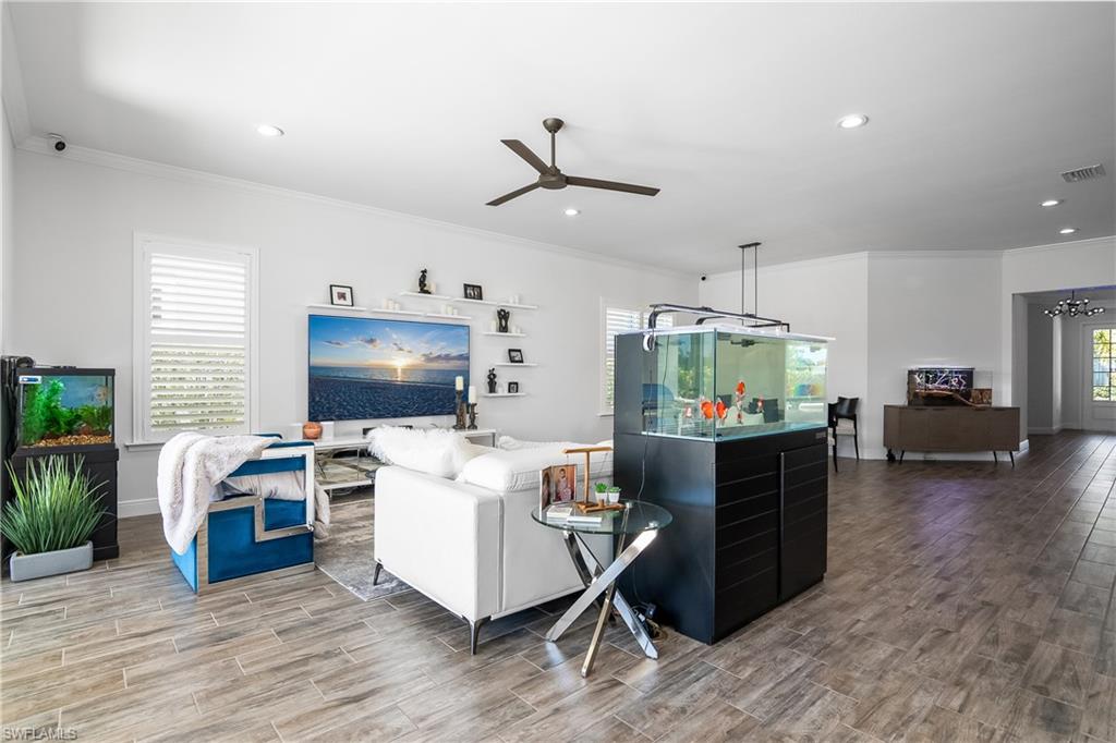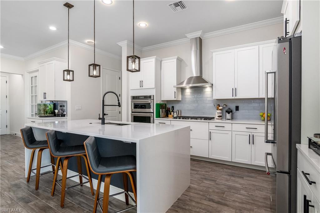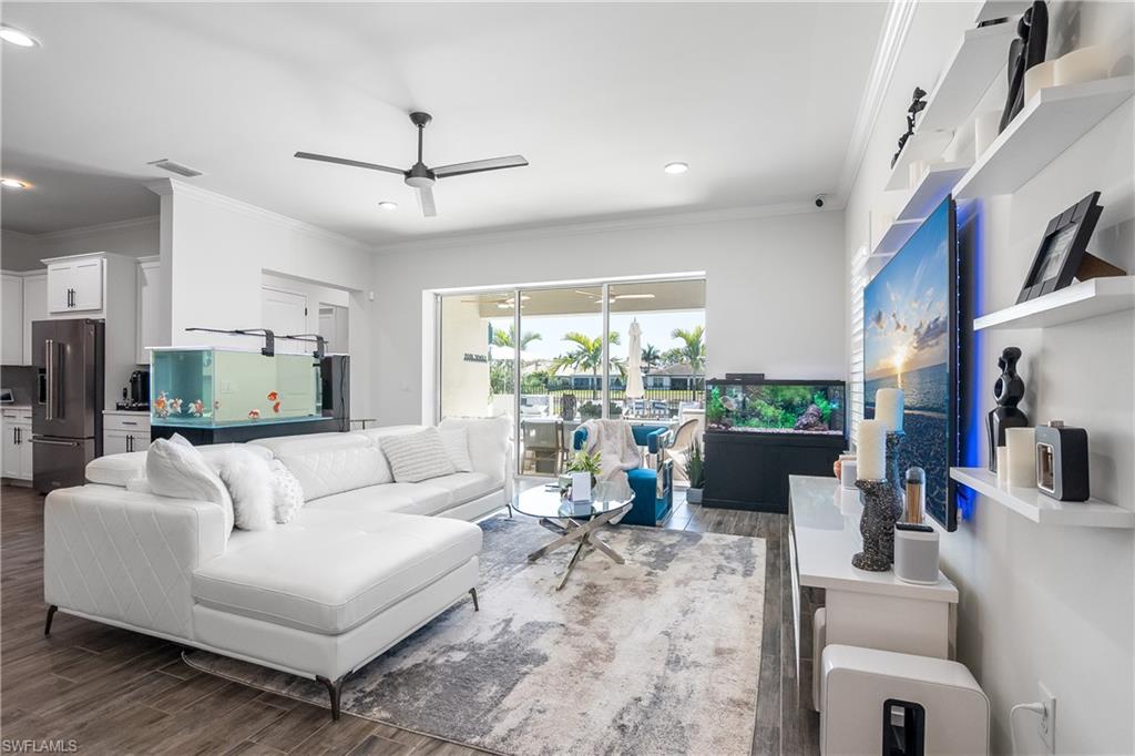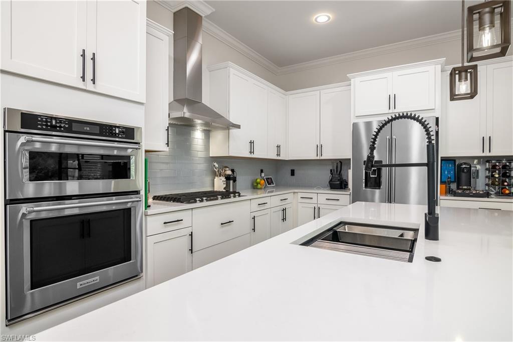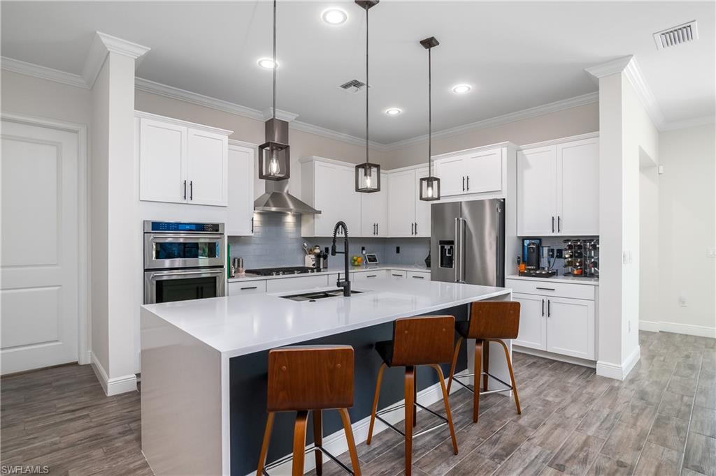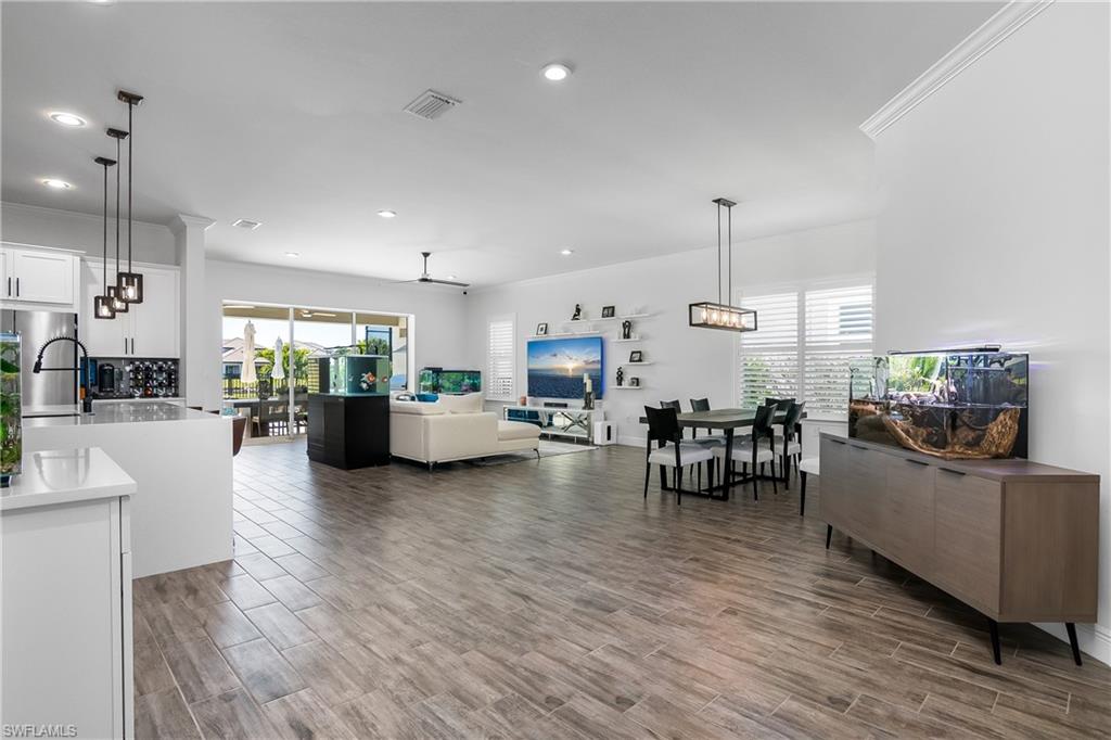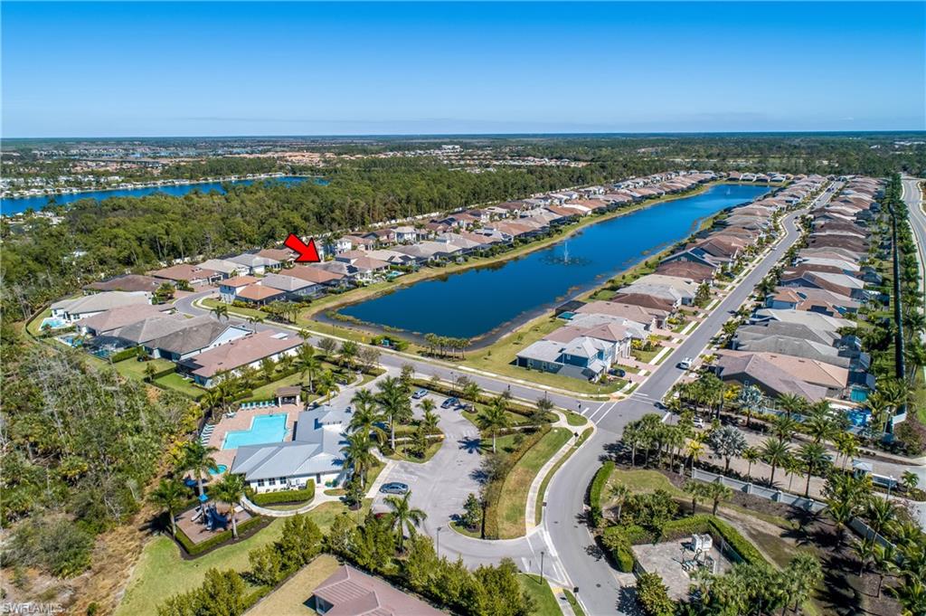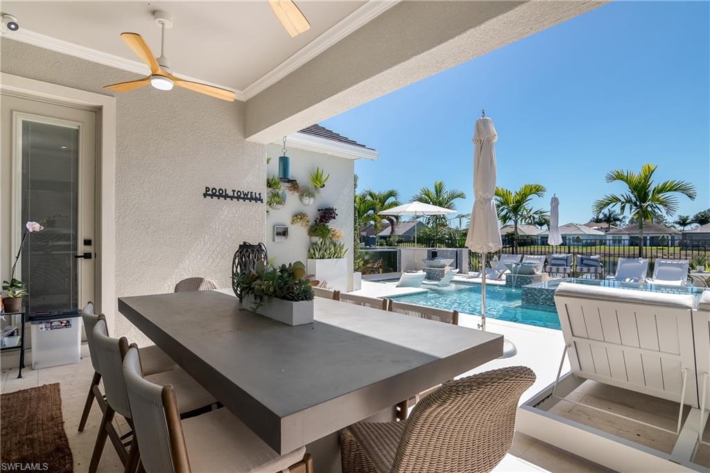 Modern single-story home which allows the ultimate SWFL lifestyle with your own private resort style saltwater heated pool, large custom 10-person spa, Elevated sunbathing deck, poolside full bar including liqueur on-tap, and full outdoor gourmet kitchen. Pool Heater 3x standard capacity for extra fast and extra hot at the touch of a button. Enjoy overlooking the community lake with fountain, as well as your 6000 Gallon Acrylic KOI Pond, makes your outdoor space even more of a tropical oasis. One of only a few homes in community on gas. 900 Gallon tank provides natural gas to both outdoor kitchen, outdoor fire-pits and indoor kitchen range. Home runs a usual FPL bill of $0 with a extra-large 56 panel solar system. Master suite includes oversized walk-in shower with Multiple shower heads and Dual Zone Hot water controls. Master suite also includes extra-large walk-in closet with built in closet organizers. Uplighting and enhanced ambiance lighting by pool and spa. All outdoor pool, spa, fire-pits, and lighting are automated thru remote control or mobile app. Home includes video security system. Come enjoy this beautiful paradise with KOI which attract positive forces and numerous beneficial outcomes. Attic has been set up for extra storage. Home equipped with Hepa air filtration system. Community is centrally located and part of a A+ School System. Close to shopping and beaches.