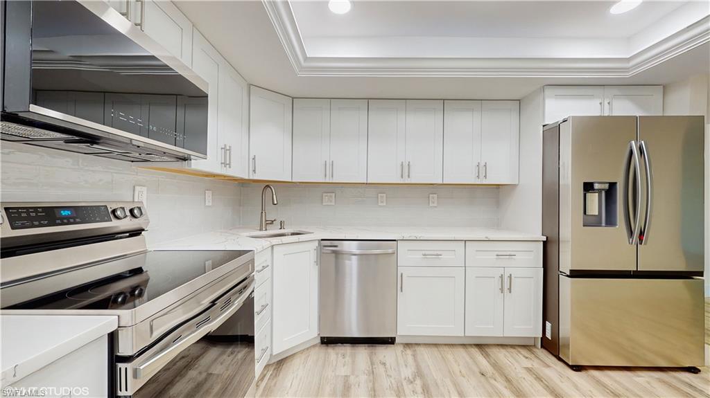 Welcome to the heart of Park Shore! This newly renovated 3-bedroom, 2-bathroom home offers a spacious great room floor plan, perfect for comfortable living and entertaining. The kitchen features elegant quartz countertops and sleek stainless steel appliances, catering to your culinary needs. New bathrooms, cabinetry shower surrounds, and quartz counters. Luxury vinyl throughout. New LED lighting installed in all rooms. Enjoy the luxury of being within walking distance to upscale shops, exquisite restaurants, and exclusive private beach access at Park Shore Beach Park. Relax by the common area pool, conveniently located right next to the unit. With a new AC unit installed in 2022, and impact proof windows this home is move-in ready and perfect for the upcoming season. Don't miss out on this incredible opportunity—schedule your showing today and embrace the Park Shore lifestyle!