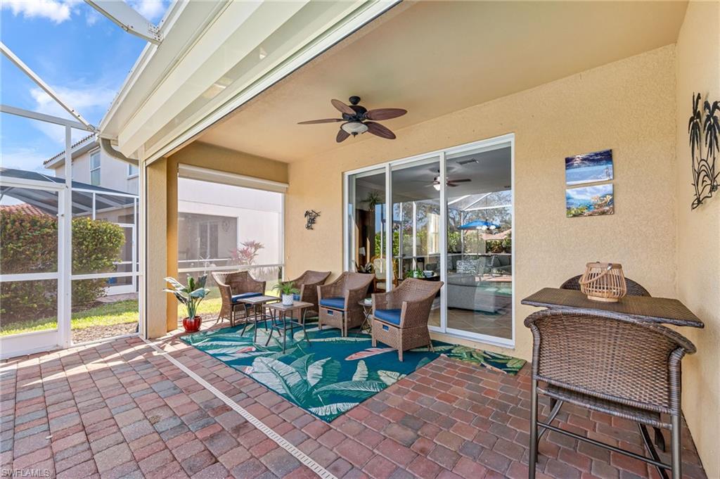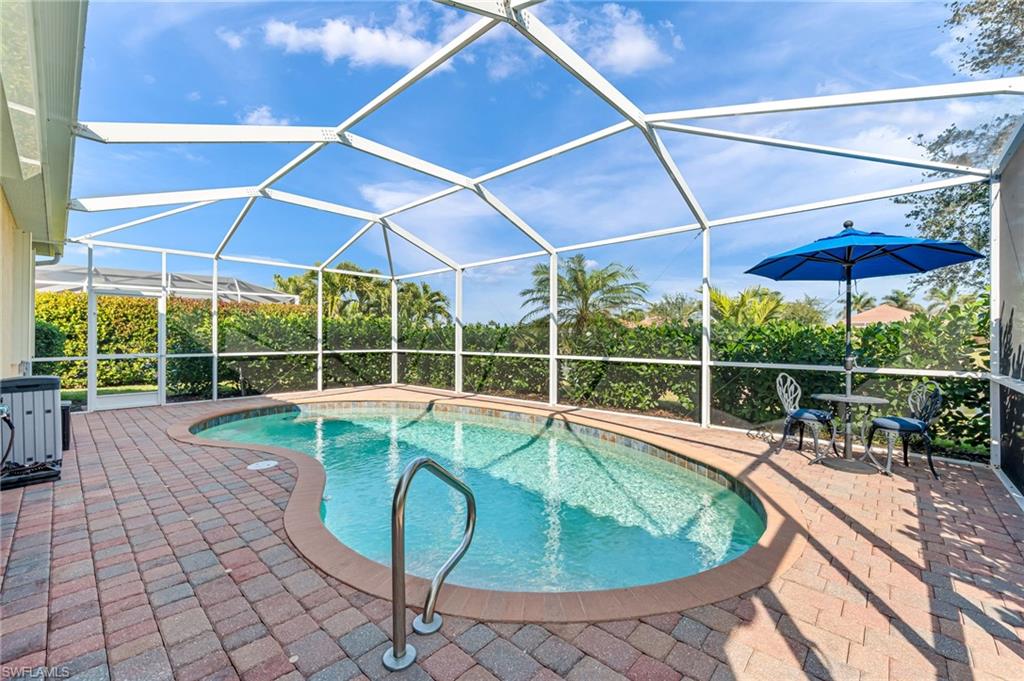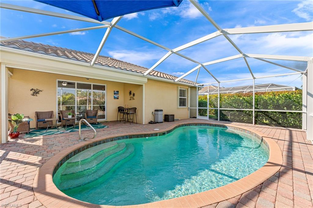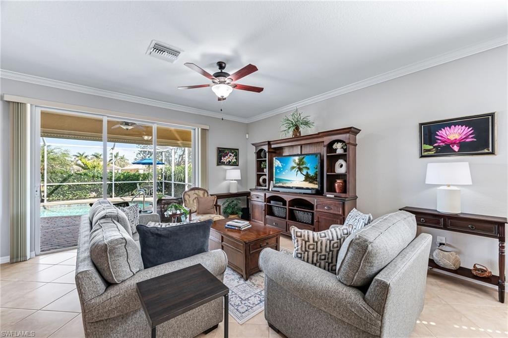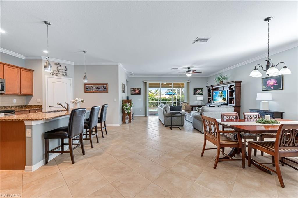 This beautifully maintained 4 Bed 3 Bath single story home with 2 car garage and pool with a water view is located in Reflection Lakes of Naples. LOW HOA FEES! Trevi floor plan with tile flooring through out and the spacious kitchen with GE appliances is open to both family and dining rooms, delivering the ideal layout for socializing and entertaining. Crown molding in the living and Primary Bed and Bath. Ceiling fans in all bedrooms and the family room. The extended lanai is perfect for enjoying the laid-back Florida lifestyle. Solar heated pool with solar pool cover included. Screened in front entry. Mounted accordion hurricane shutters on all windows and electric motorized shutters for the front and side of the lanai under-roof. Interlock kit in the electrical box with power inlet on lanai to allow access to included Duramax portable generator. Overhead storage with pull down ladder in the garage. Water Heater 2 yrs new! Remainder of Next Plumbing 10 yr Gold Protection Plan included - purchased in 2021. Google nest video doorbell security camera. Reflection Lakes of Naples offers a Clubhouse with Ball Room, Fitness Center, Card/Meeting Room, Library, Billiard Room, Resort Pool and Spa, Kid’s Splash Pool, Bocce Ball, and Pavilion.