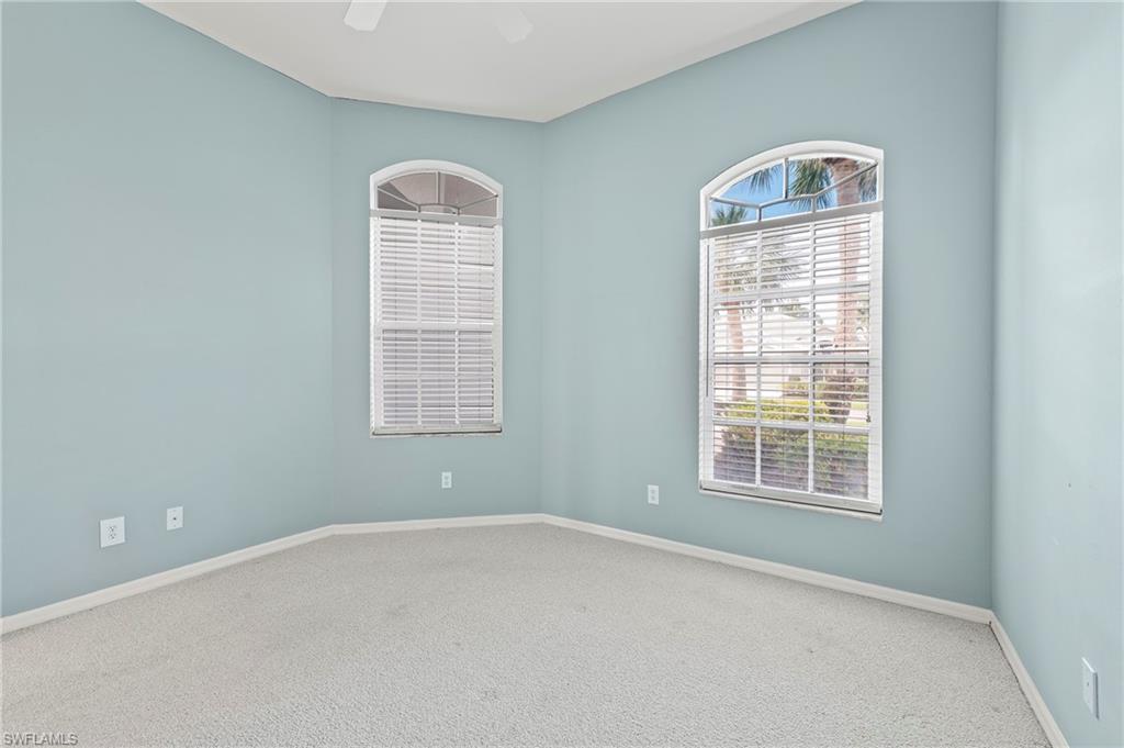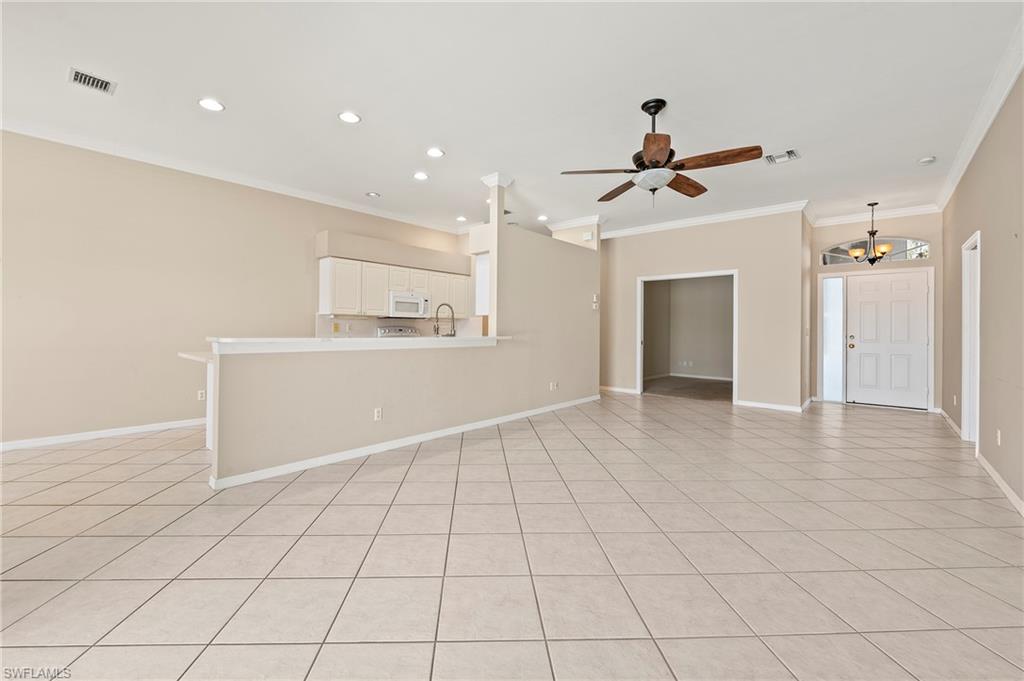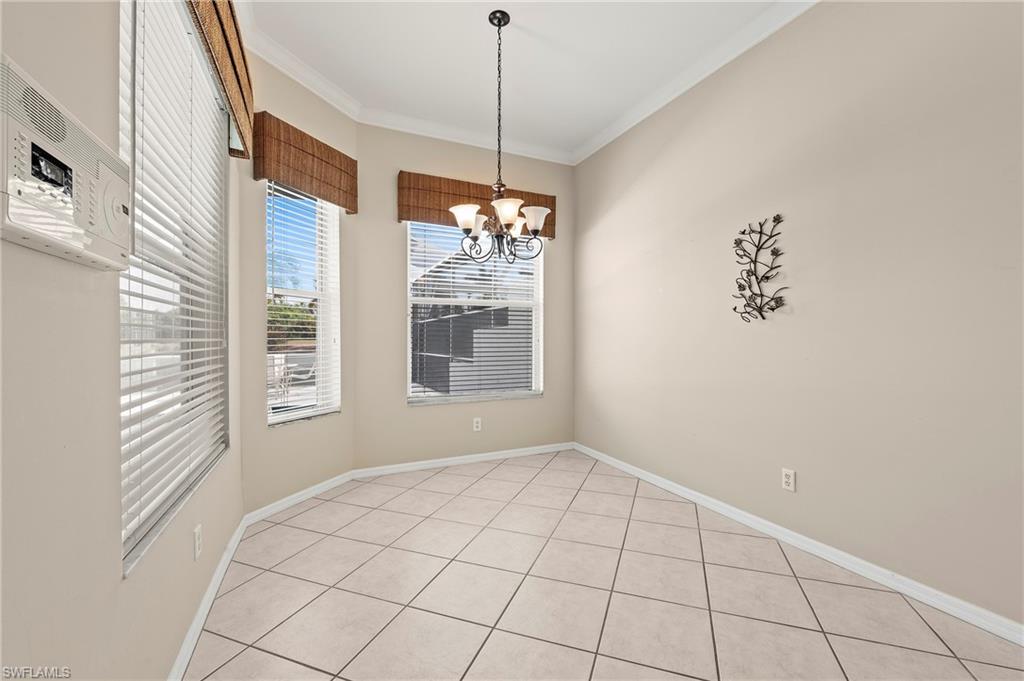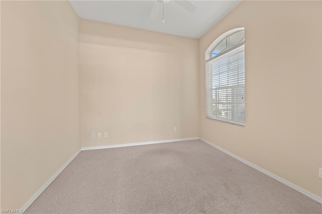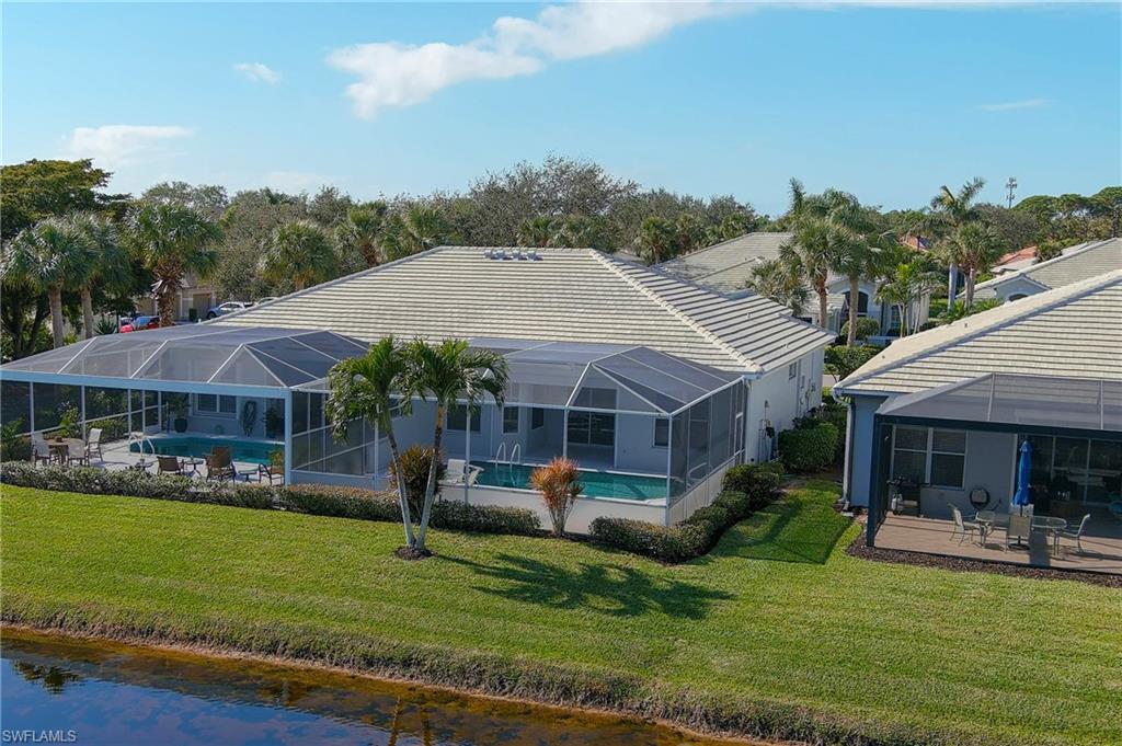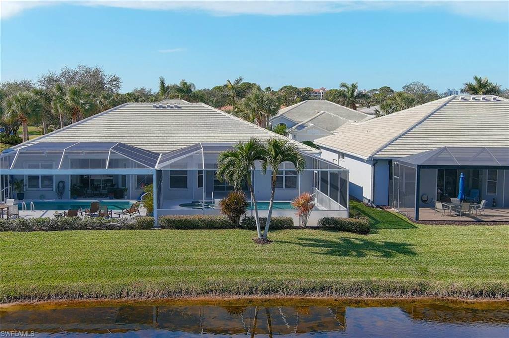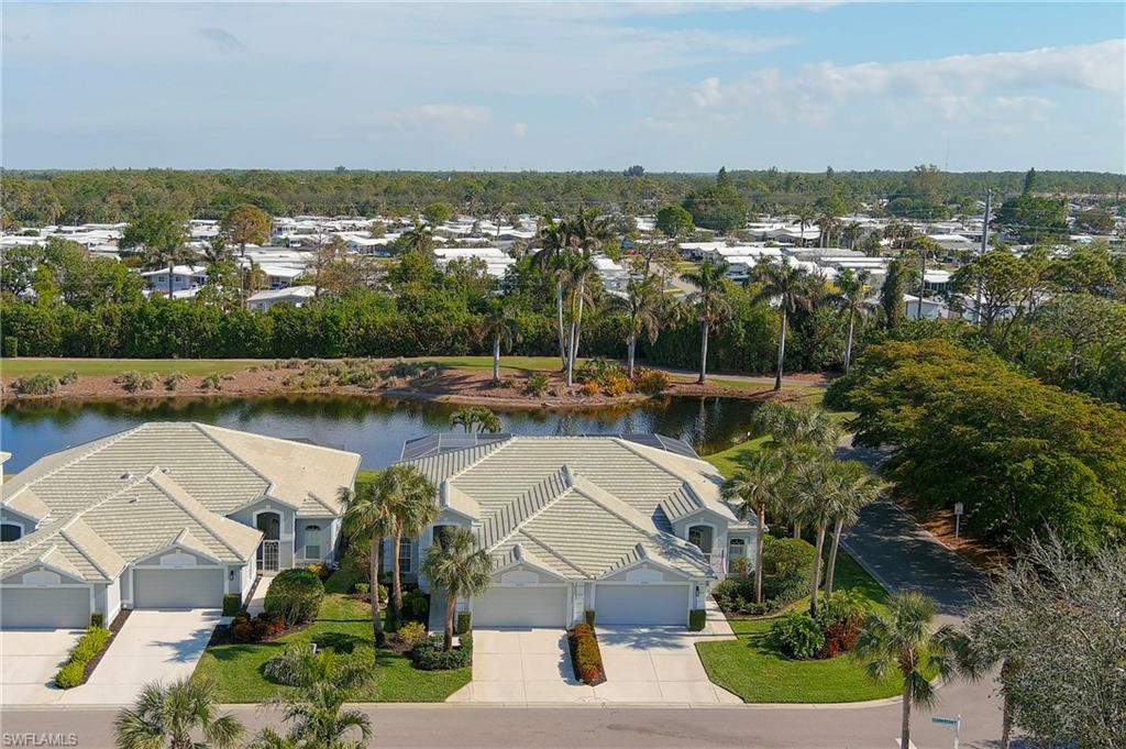 Discover this quaint Ashmoor Villa, nestled within the prestigious gated community of Highland Woods. This charming property features two bedrooms, two bathrooms, and a versatile den, making it ideal for entertaining. The villa boasts elegant quartz countertops, an electric storm shutter for added security, and crown molding throughout. Step outside to enjoy the expansive pool and hot tub, complete with an extended lanai that offers additional outdoor living space and a breathtaking lake view overlooking the 3rd hole. With its eastern exposure, you'll relish the stunning Florida sunrises each morning. Highland Woods is renowned for its exceptional amenities, including an 18-hole golf course, bocce and tennis courts, multiple community pools, and a state-of-the-art fitness facility. The newly completed resort-style pool and spa, along with a cabana bar, restaurant, and pickleball courts, further enhance the community's allure. Conveniently located, this villa is just moments from the Promenade of Bonita Springs, providing a variety of dining, shopping, and entertainment options. Plus, the pristine beaches of the Gulf of Mexico are only 4 miles away, offering the perfect blend of luxury, comfort, and prime location. Don't miss this incredible opportunity to own a piece of paradise!