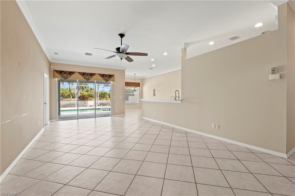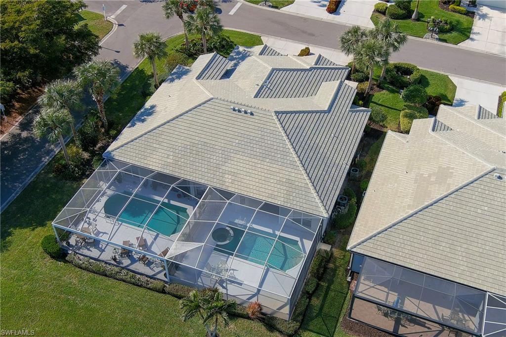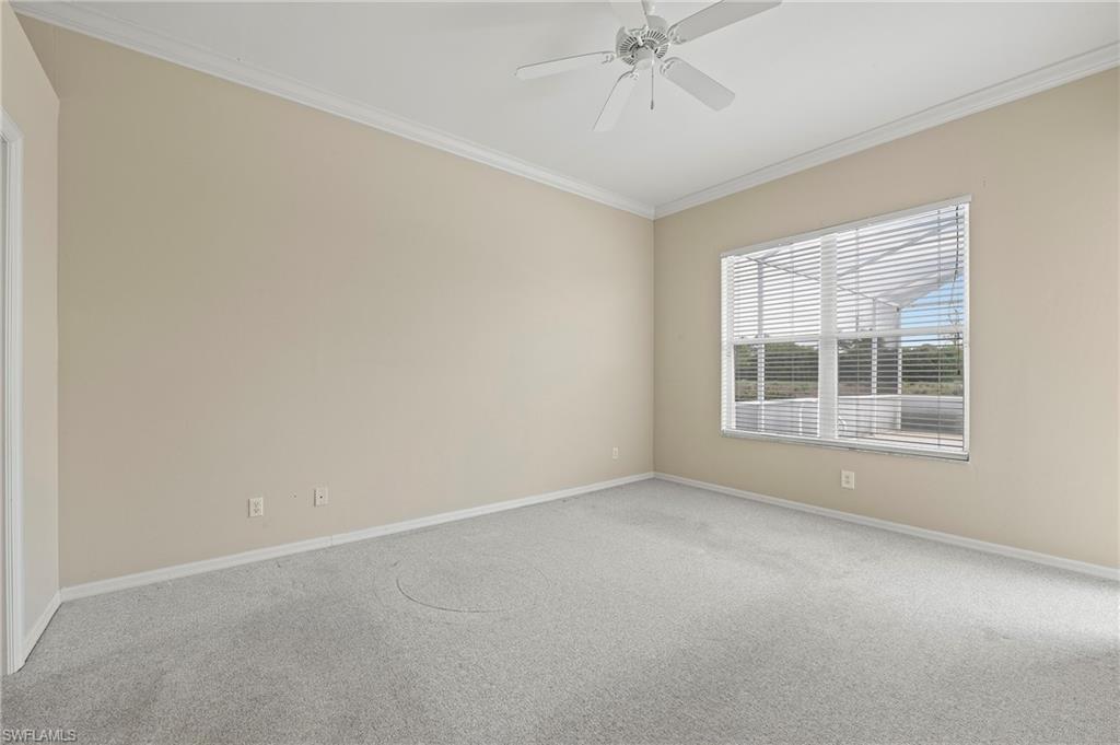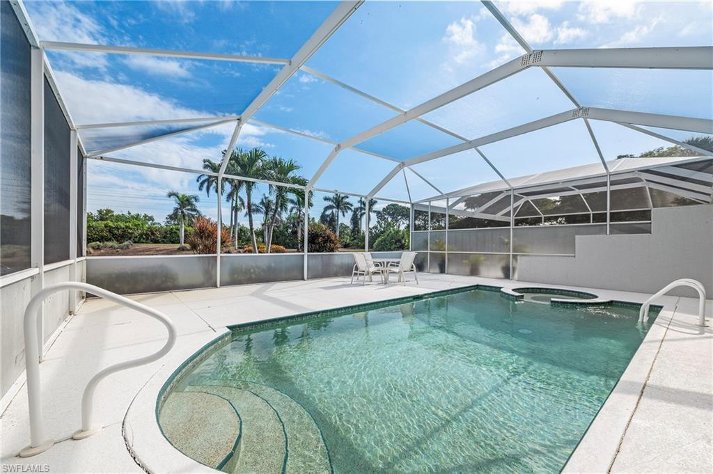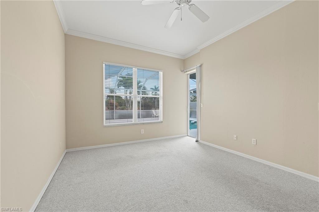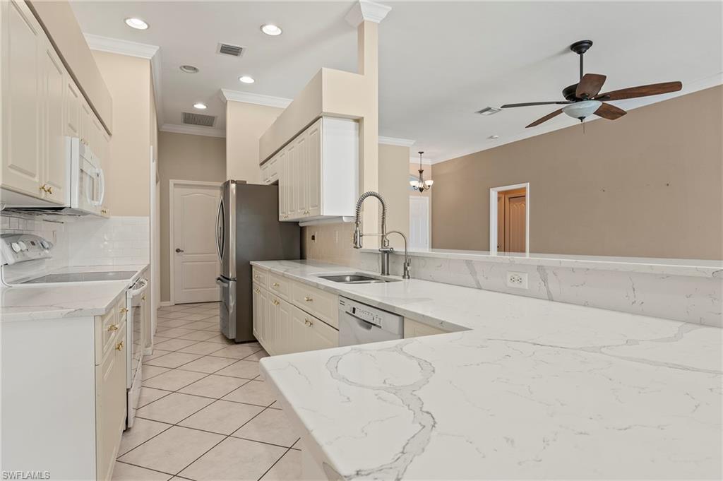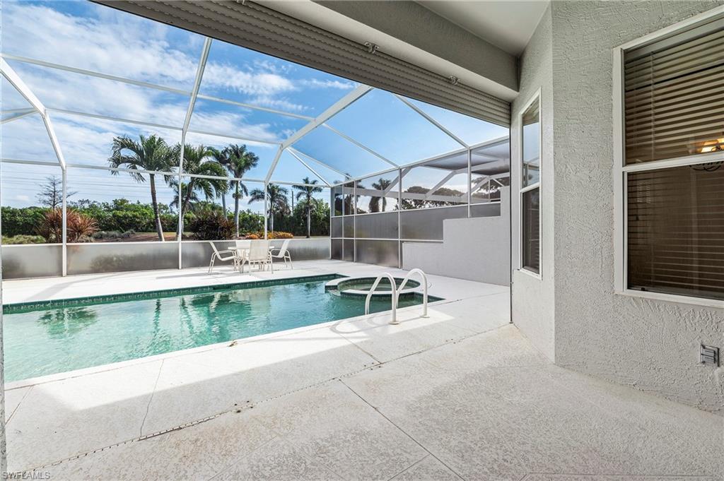 Discover this quaint Ashmoor Villa, nestled within the prestigious gated community of Highland Woods. This charming property features two bedrooms, two bathrooms, and a versatile den, making it ideal for entertaining. The villa boasts elegant quartz countertops, an electric storm shutter for added security, and crown molding throughout. Step outside to enjoy the expansive pool and hot tub, complete with an extended lanai that offers additional outdoor living space and a breathtaking lake view overlooking the 3rd hole. With its eastern exposure, you'll relish the stunning Florida sunrises each morning. Highland Woods is renowned for its exceptional amenities, including an 18-hole golf course, bocce and tennis courts, multiple community pools, and a state-of-the-art fitness facility. The newly completed resort-style pool and spa, along with a cabana bar, restaurant, and pickleball courts, further enhance the community's allure. Conveniently located, this villa is just moments from the Promenade of Bonita Springs, providing a variety of dining, shopping, and entertainment options. Plus, the pristine beaches of the Gulf of Mexico are only 4 miles away, offering the perfect blend of luxury, comfort, and prime location. Don't miss this incredible opportunity to own a piece of paradise!