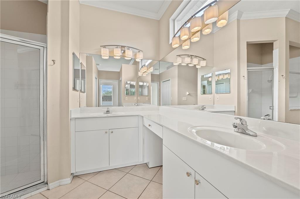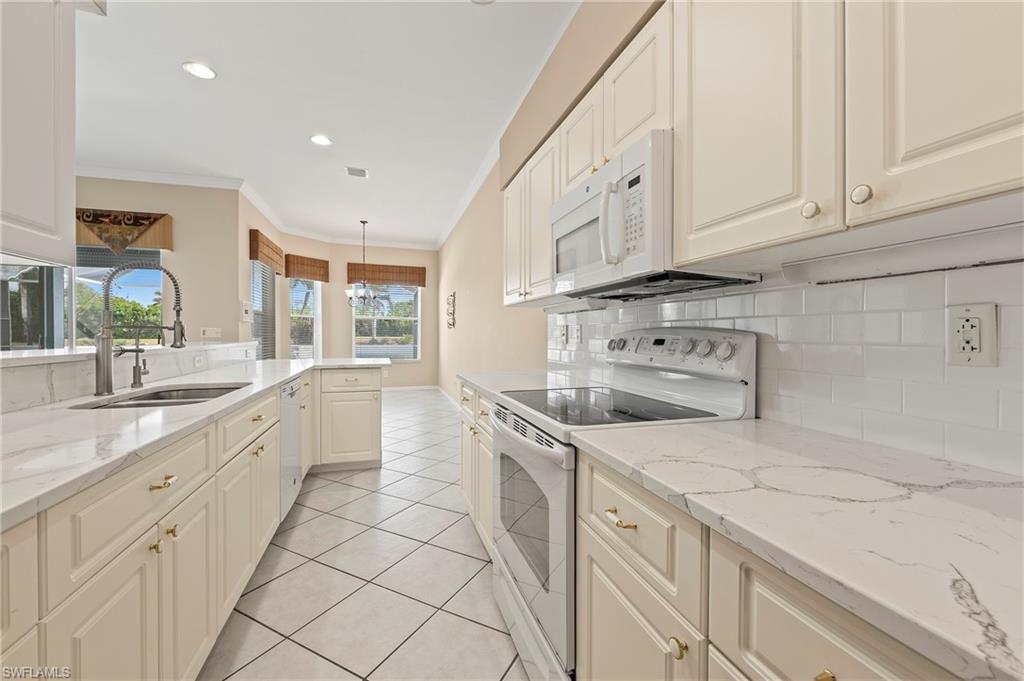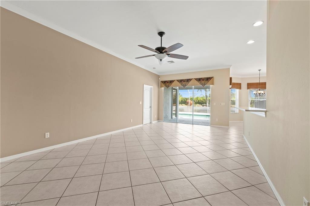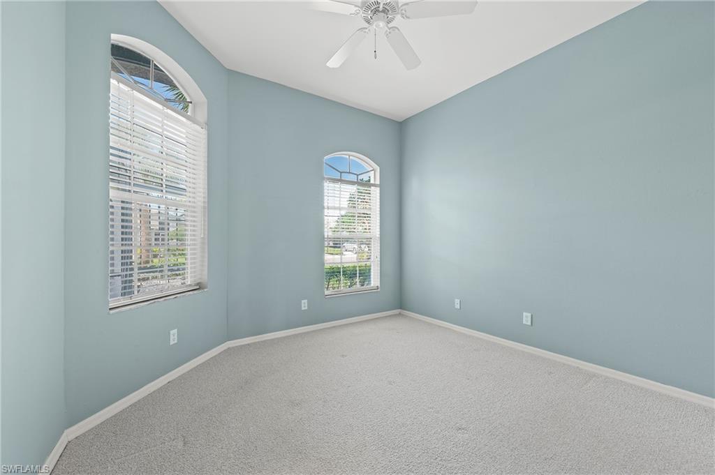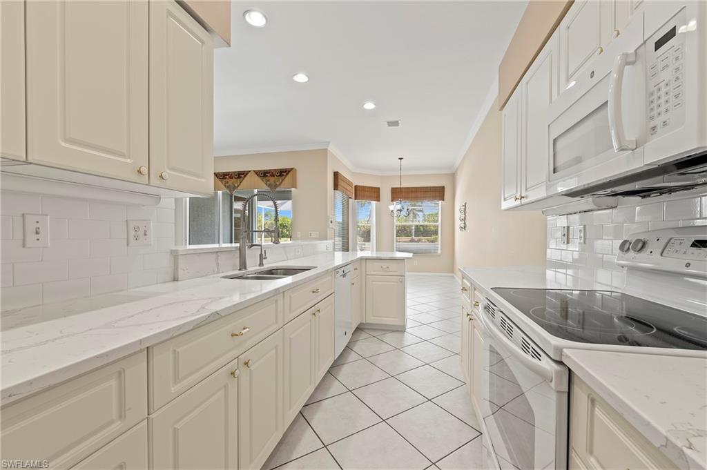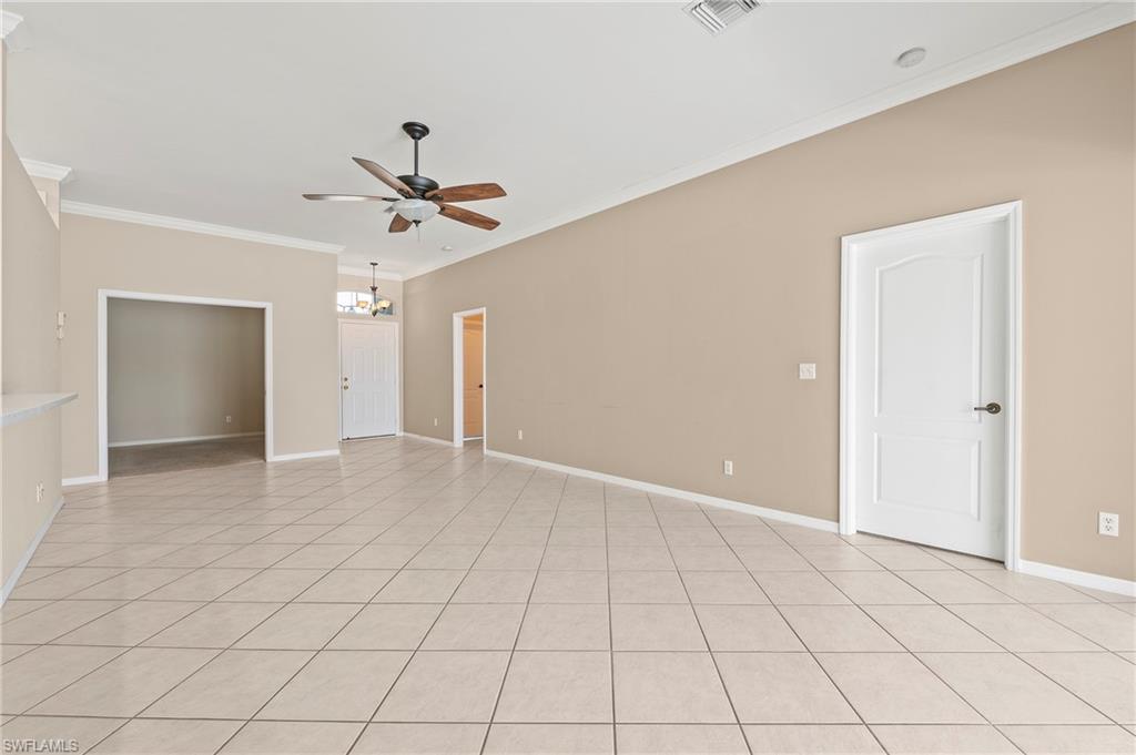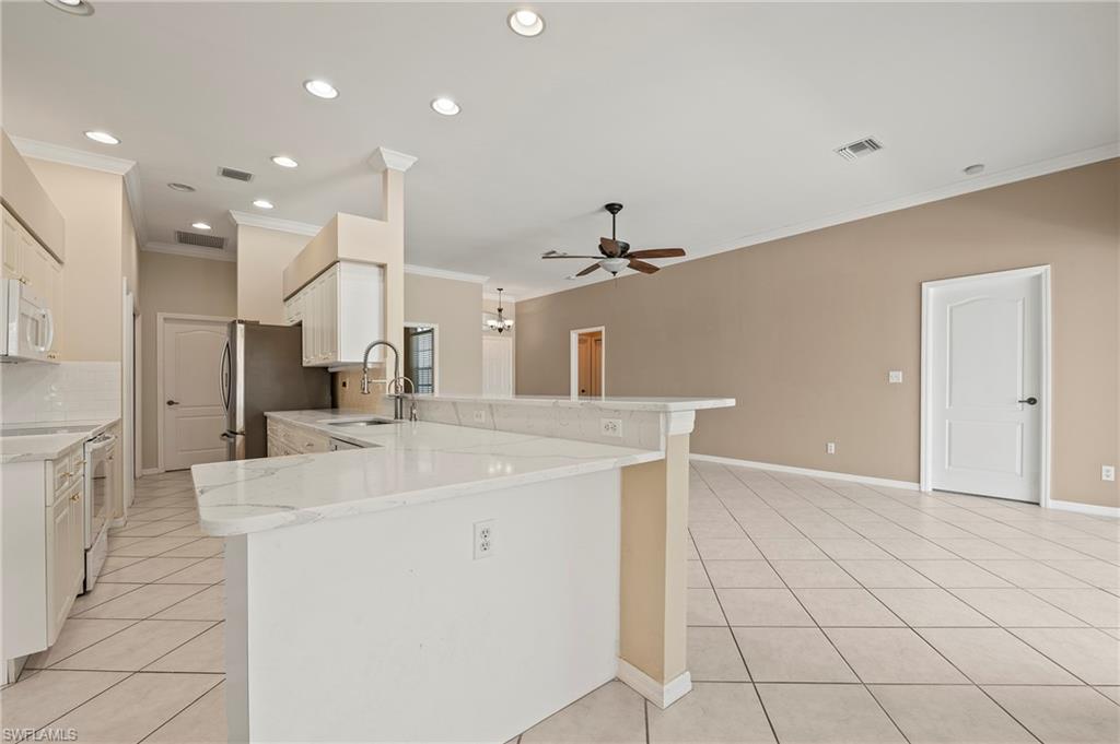 Discover this quaint Ashmoor Villa, nestled within the prestigious gated community of Highland Woods. This charming property features two bedrooms, two bathrooms, and a versatile den, making it ideal for entertaining. The villa boasts elegant quartz countertops, an electric storm shutter for added security, and crown molding throughout. Step outside to enjoy the expansive pool and hot tub, complete with an extended lanai that offers additional outdoor living space and a breathtaking lake view overlooking the 3rd hole. With its eastern exposure, you'll relish the stunning Florida sunrises each morning. Highland Woods is renowned for its exceptional amenities, including an 18-hole golf course, bocce and tennis courts, multiple community pools, and a state-of-the-art fitness facility. The newly completed resort-style pool and spa, along with a cabana bar, restaurant, and pickleball courts, further enhance the community's allure. Conveniently located, this villa is just moments from the Promenade of Bonita Springs, providing a variety of dining, shopping, and entertainment options. Plus, the pristine beaches of the Gulf of Mexico are only 4 miles away, offering the perfect blend of luxury, comfort, and prime location. Don't miss this incredible opportunity to own a piece of paradise!