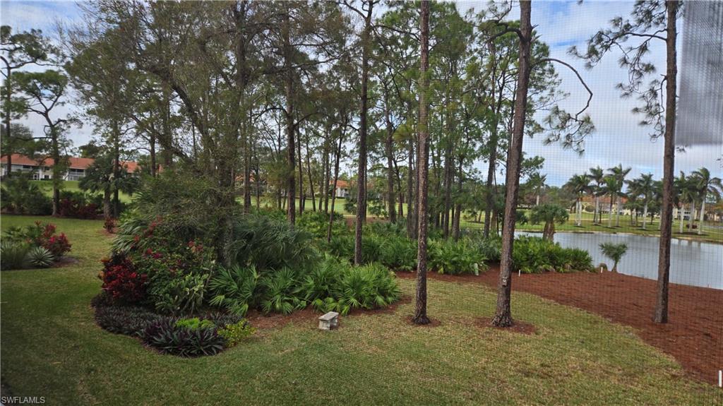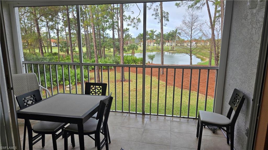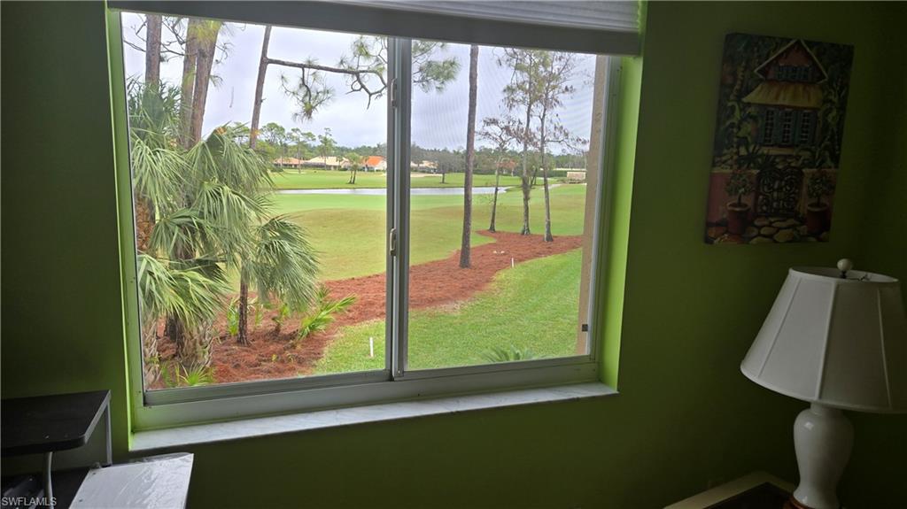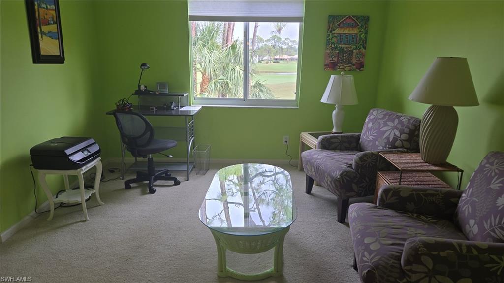 Royal Wood Golf Club-Bloomfield Ridge-The lake and golf course view from this second floor END condo with2BR/2BA/DEN with window will dazzle you. Den has pocket doors and window allowing it to be a private sleeping room for your guests. Lanai has electric huricane screen for storm protection.Refaced cabinets. Air conditioning new in 2024. Primay bedroom and guest bedroom have extra windows giving you lots of natural light. 1410 square ft. makes this unit one of the larger units. Large laundry room. Covered parking, space 50, right outside your door. One pet limit not to exceed 25 lbs. Steps to heated pool, bocce ball court, spa and tennis court with pickleball lines. Royal Wood offers immediate golf membership with purchase to begin enjoying this exciting bundled golf community with well maintained golf course offering challenging play for all levels of golf. Clubhouse features on site restaurant, large bar area, grill room overlooking the golf course. New pro shop and spacious fitness center with peloton bikes. Adjoining yoga room featuring yoga classes for all levels.Lots of activities to socialize and make new friends. Bingo, trivia, bridge, name that tune and more. Live entertainment on Fridays. Shopping, restaruants, Naples Zoo and the Botanical Garden are just a short drive. Close to the downtown and the beach.