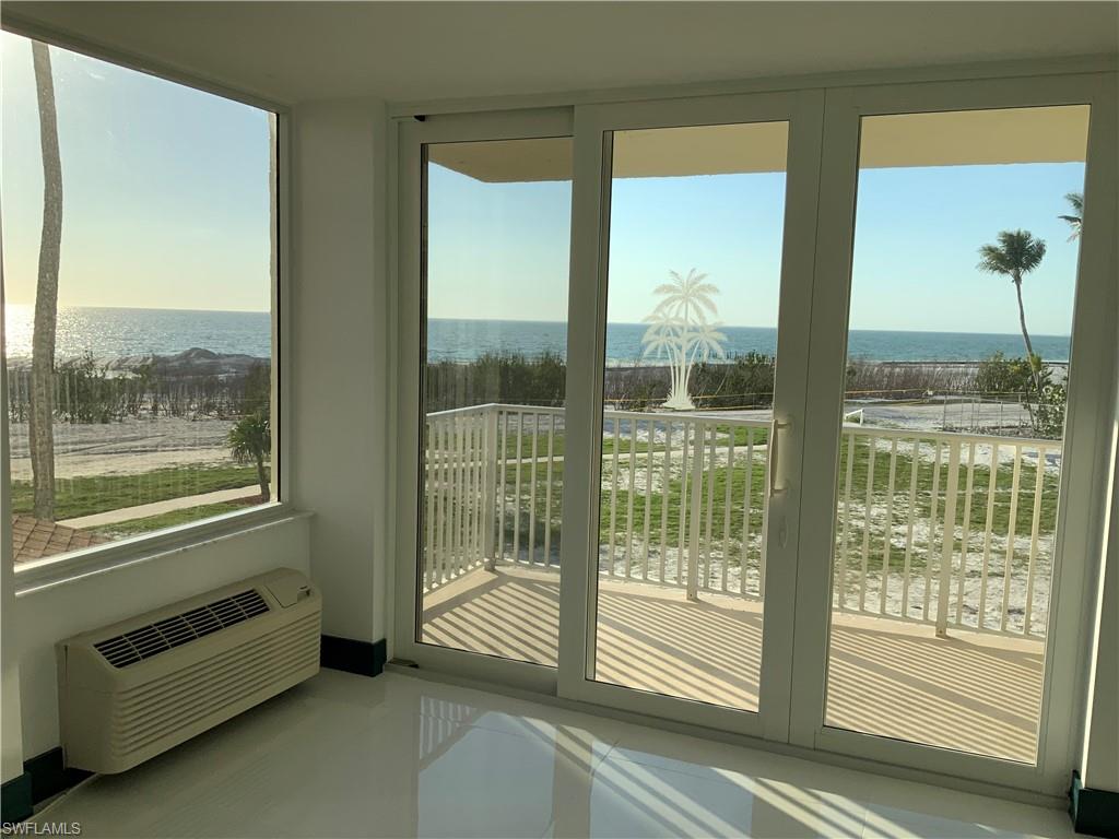 BEACH FRONT BEACH VIEWS OUT ALL WINDOWS This remodeled first floor above the ground level Condo , looks out to the Beach and Gulf of Mexico , with view up the north end of Island and Sanibel Island! Listen to waves while you sleep! New tile floors, NEW HURRICANE IMPACT GLASS THRU OUT , new A/C , new Hot water heater, New QUARTZ counters , new bath & shower !! Great WEEKLY rental Condo Bldg. Walk to beach steps out the door . Complex has it all , tennis , pickle ball , bocce ball, shuffle board , bike racks , community room , beach sun chairs and tables , pool has geo thermal heating , pond with fountain , all paver parking and roads. Large parking area across from a small mall has stores & shops ! Close to other shops , great walking paths in area ! Beach trolley runs past this complex for easy access to whole Island. Lover Key State park a bike ride away , famous kayaking and boating ! Paradise is at your fingertips! Ground level is community sitting , meeting areas and elevators , with pool and pool bathrooms , and many out door showers and foot washing !