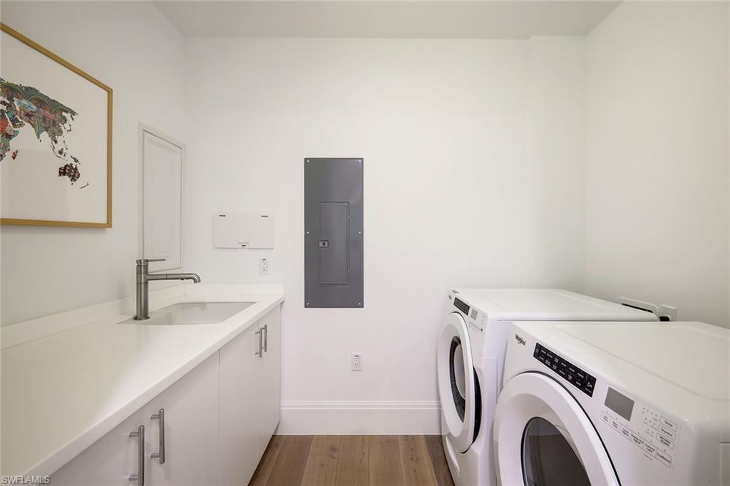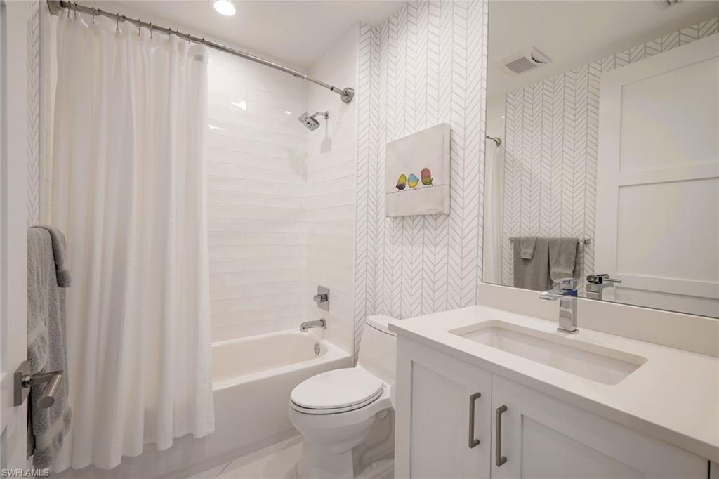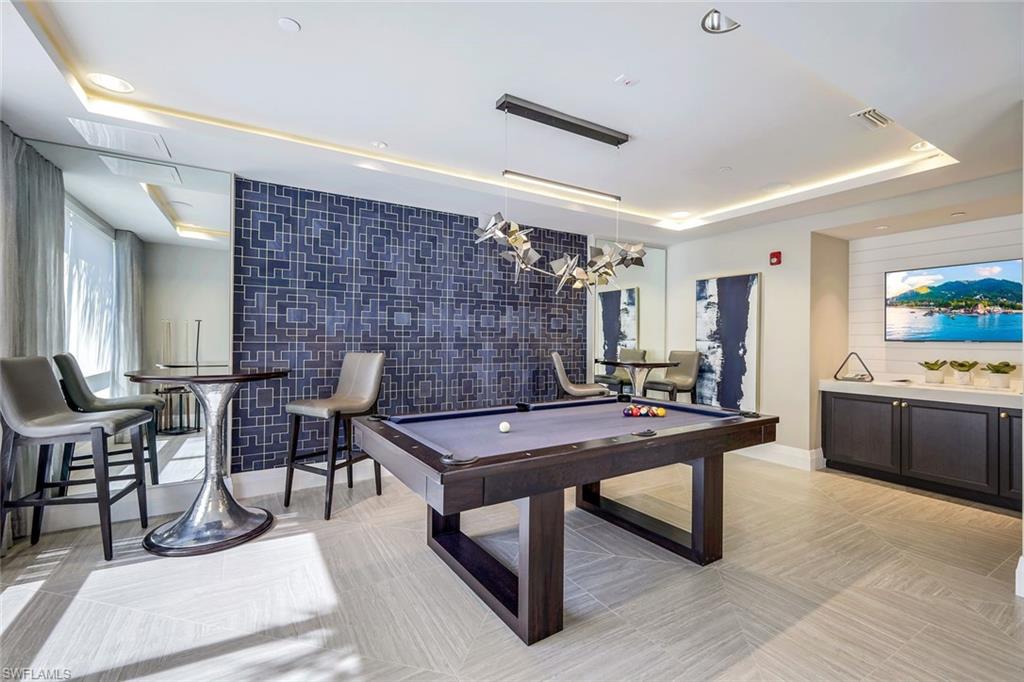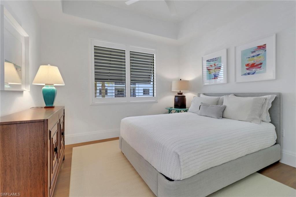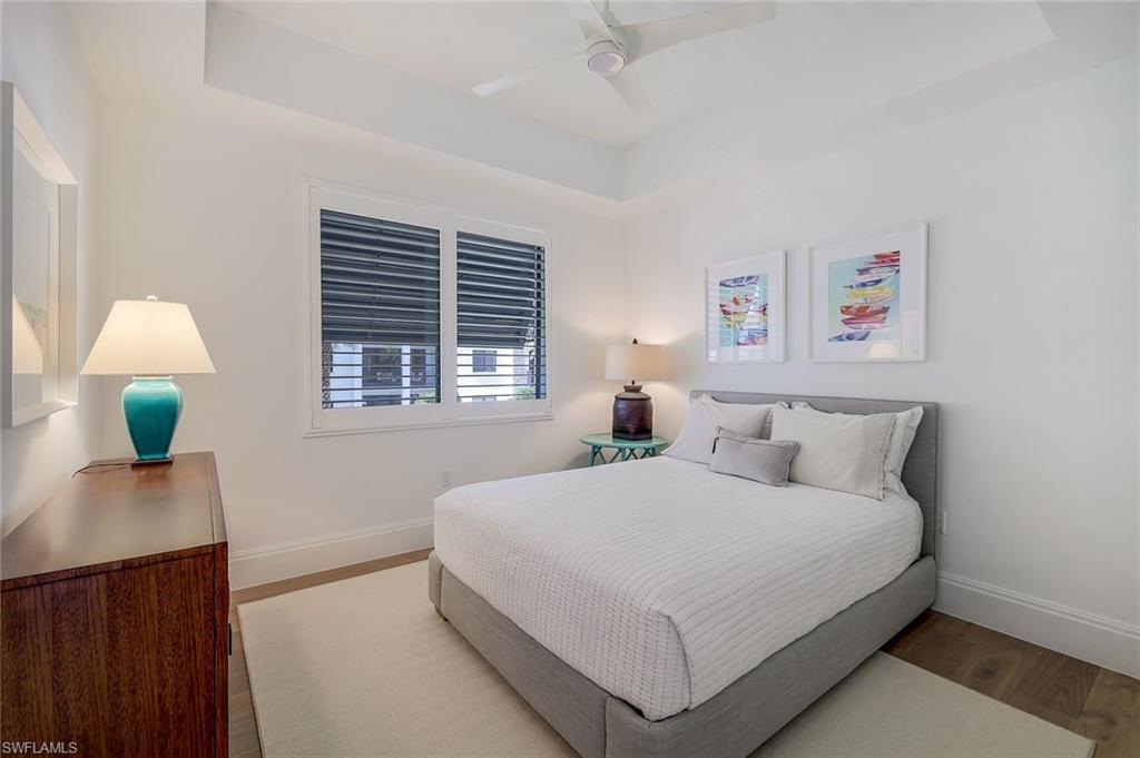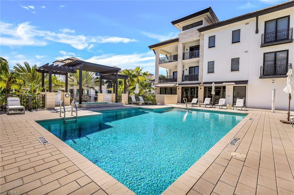 Fall in love with this spectacular property at Naples Square in the highly sought-after location of downtown Naples. Desirable western views over the lovely courtyard pool and gardens promise abundant light and sunsets. The spacious floor plan features numerous upgrades including Legno Bastone white oak wood floors throughout, upscale stylish lighting & wallpaper, quartz counters & Bosch appliances with gas cooking, tasteful neutral finishes... FLAWLESS!... If you can pull yourself away from this captivating home, a short stroll away from your doorstep brings you to Naples Beach, 5th Ave S, Baker Park, marinas, the vibrant Design District & the Gulfshore Playhouse... or revel in the resort amenities - serene gardens, heated pool & spa, pavilion bar with grills, fire pit, fitness center, and fully appointed Club Room. Naples Square is pet-friendly, allowing 2 pets without size restrictions!
