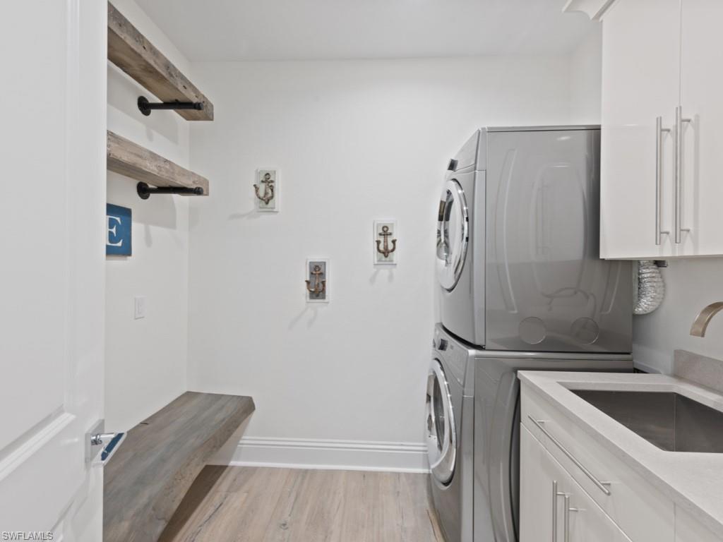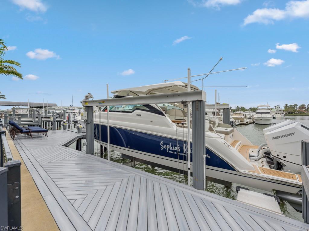 Luxuriate in a perfect piece of paradise! This spectacular coastal contemporary home offers waterfront life at its finest. Direct access, no bridges and less than 5 minutes to open water! Water views from every room! This magnificent 2 story freshly updated home offers WIDE water views, picturesque views of the Yacht Club and Marina, River and Jolley bridge, ideally situated at the beginning of Marco Island. This home boasts 4 bedrooms + Den and 4 bathrooms. The Primary bedroom is on the first floor and is steps to your spa and pool with expansive outdoor space and outdoor kitchen. Many upgrades include freshly painted inside and out, all new light fixtures, fenced in backyard, impact resistant doors and windows. Dramatic, open great room with gorgeous water views, perfect for entertaining, custom kitchen with quartz countertops, new Bosch dishwasher and Wolf stove. Completely New Dock adaptable to accommodate a 90 foot boat with 20,000 pound boat lift, up to 36 foot boat lift, double jet ski platform lift adjacent to pool deck. This home is sure to be a hit with boating enthusiasts. Oversized garage including large storage area for all your toys. 2nd floor features huge Bonus room as well as kitchenette and recreation room for TV enjoyment with 3 spacious bedrooms all having an en-suite bathroom. Come enjoy this waterfront home with its tranquil water views!