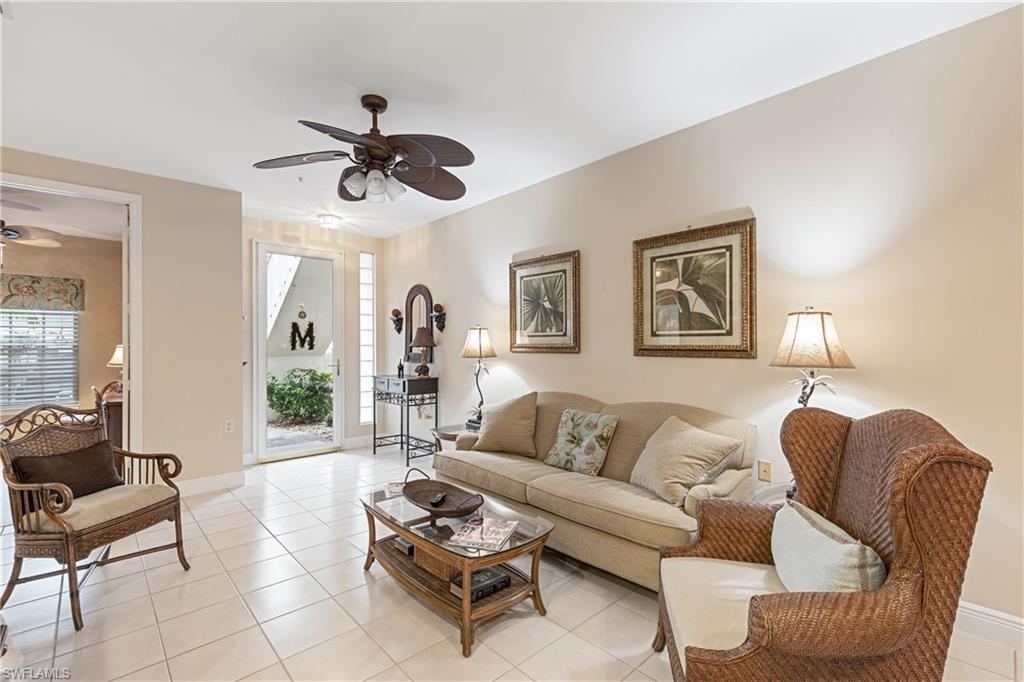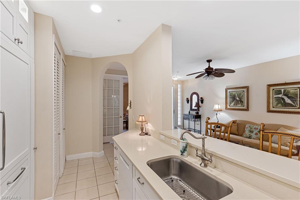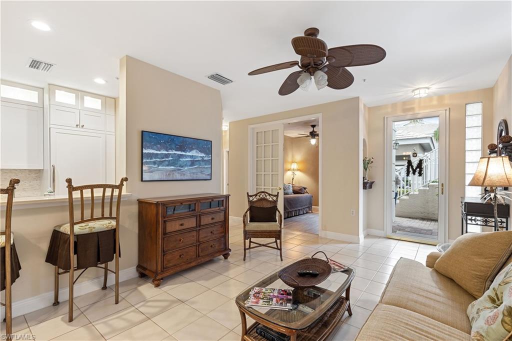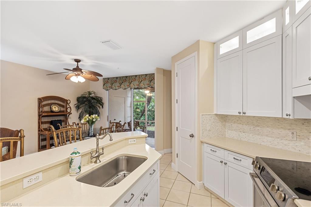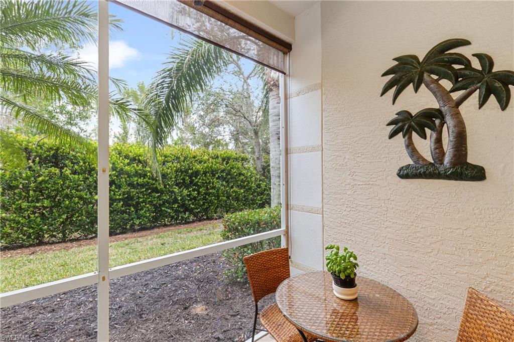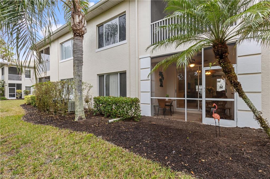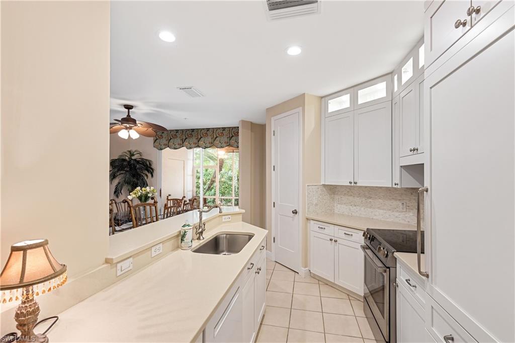 $68k remodeled first floor condo and a great price improvement! This two bedroom plus den first floor condo has a remodeled kitchen and baths with a comfortable sophisticated flair. The kitchen offers new shaker style cabinetry that flows all the way to the ceiling with lighted and windowed cabinet tops, counter tops are complimented with a lovely quartz. Appliances are upgraded and are stainless steel plus the refrigerator is encased in the cabinetry. The kitchen also offers a beautiful tiled backsplash. Gorgeous master and guest baths include updated showers and shaker style cabinetry with quartz counter tops. Main bedroom and den offer stylish plank wood flooring and 5 inch upgraded baseboards which flow throughout the home. Custom fans and lighting through out and new washer dryer combination. This lovely home is being sold mostly furnished and is a short walk to all the resort style amenities that are included with your purchase which include a Jr. Olympic pool, hot tub, a cabana bar by the pool where you can enjoy lunch and happy hours, a fitness facility with locker rooms and sauna, a Florida style clubhouse with restaurant, bar, tennis shop and administration offices. There is also bocci and pickle ball courts, a kids play area and plenty of sidewalks. If you are a tennis player there is an optional tennis membership that offers 12 beautifully kept Har Tru tennis courts that are lighted for night play plus we have an on site USTA teaching pro who offers private lessons and clinics. The tennis has many levels of play and offers team tennis as well. This gated resort style community is minutes drive away from fantastic shopping, beautiful beaches, theater, shops and the SW Florida International airport. Enjoy a beautiful and social resort community with a fantastic location.