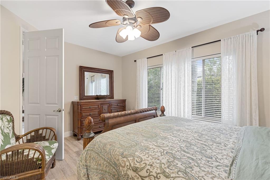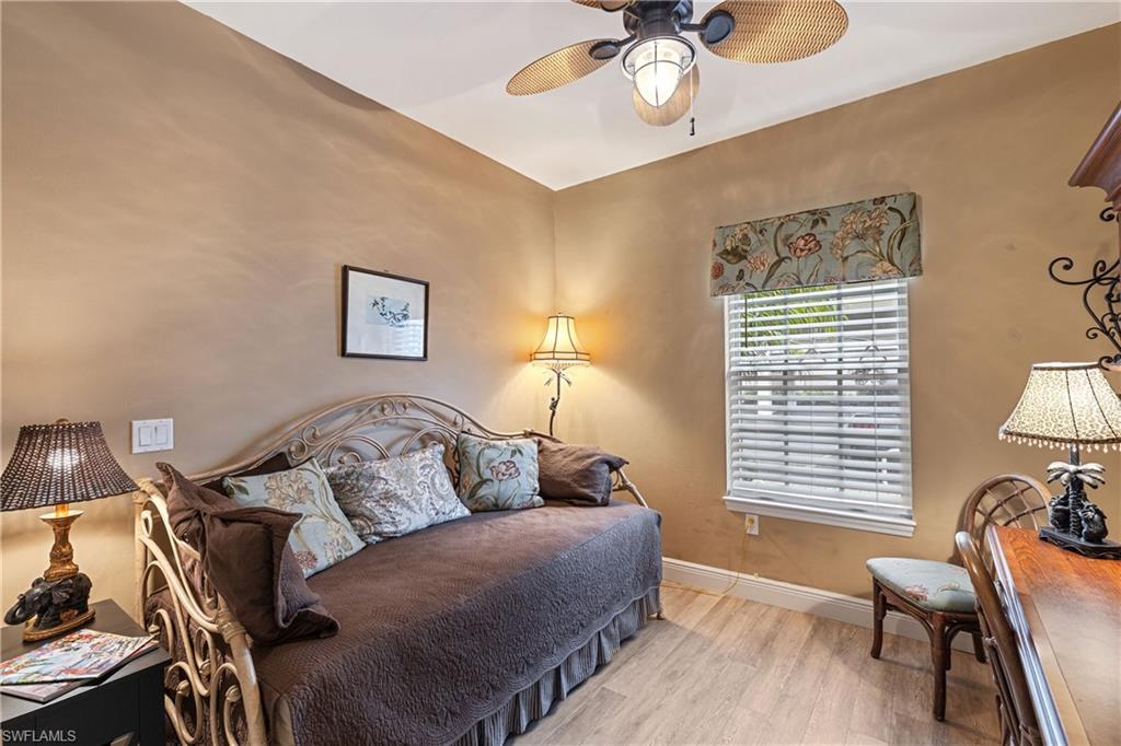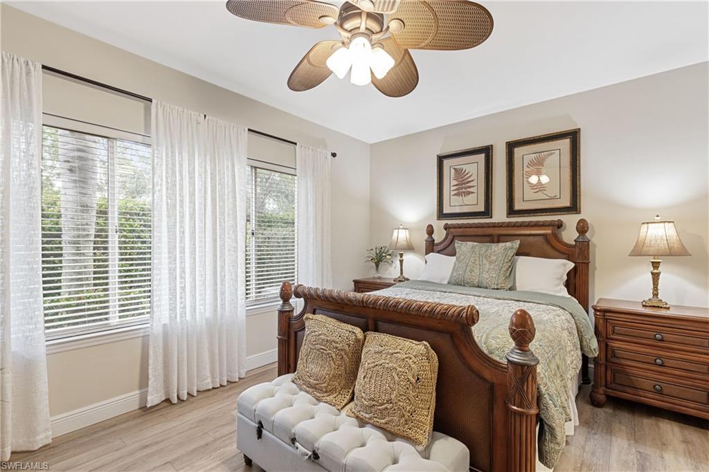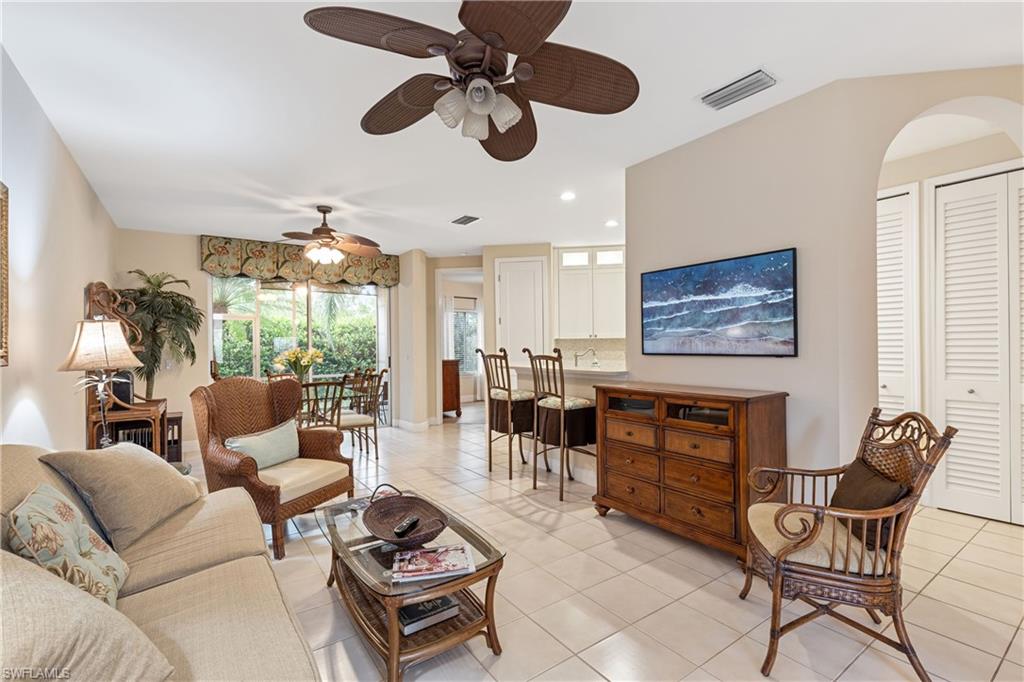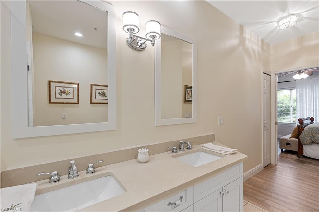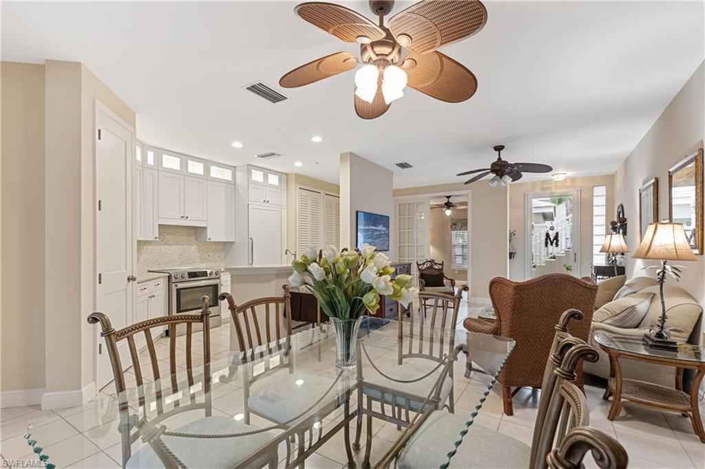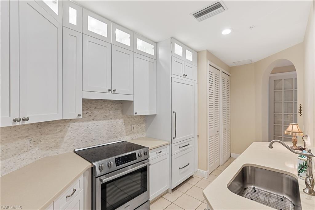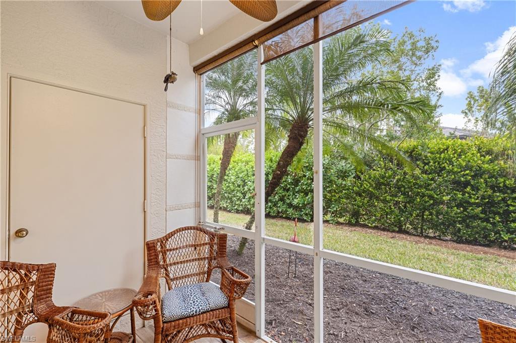 $68k remodeled first floor condo and a great price improvement! This two bedroom plus den first floor condo has a remodeled kitchen and baths with a comfortable sophisticated flair. The kitchen offers new shaker style cabinetry that flows all the way to the ceiling with lighted and windowed cabinet tops, counter tops are complimented with a lovely quartz. Appliances are upgraded and are stainless steel plus the refrigerator is encased in the cabinetry. The kitchen also offers a beautiful tiled backsplash. Gorgeous master and guest baths include updated showers and shaker style cabinetry with quartz counter tops. Main bedroom and den offer stylish plank wood flooring and 5 inch upgraded baseboards which flow throughout the home. Custom fans and lighting through out and new washer dryer combination. This lovely home is being sold mostly furnished and is a short walk to all the resort style amenities that are included with your purchase which include a Jr. Olympic pool, hot tub, a cabana bar by the pool where you can enjoy lunch and happy hours, a fitness facility with locker rooms and sauna, a Florida style clubhouse with restaurant, bar, tennis shop and administration offices. There is also bocci and pickle ball courts, a kids play area and plenty of sidewalks. If you are a tennis player there is an optional tennis membership that offers 12 beautifully kept Har Tru tennis courts that are lighted for night play plus we have an on site USTA teaching pro who offers private lessons and clinics. The tennis has many levels of play and offers team tennis as well. This gated resort style community is minutes drive away from fantastic shopping, beautiful beaches, theater, shops and the SW Florida International airport. Enjoy a beautiful and social resort community with a fantastic location.