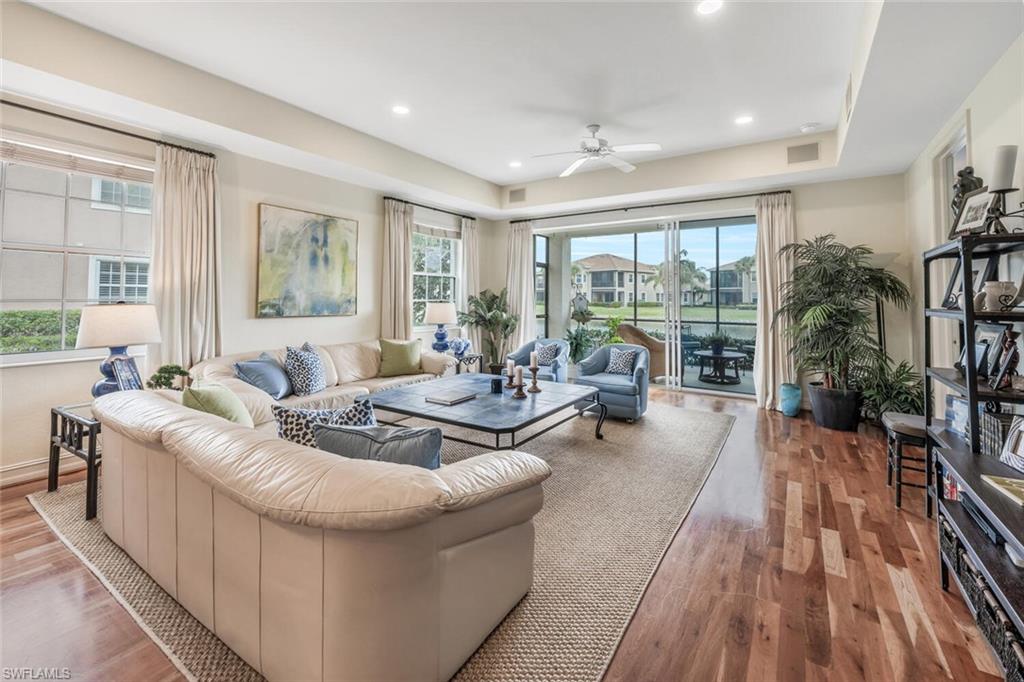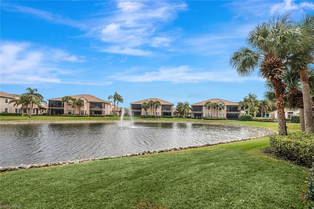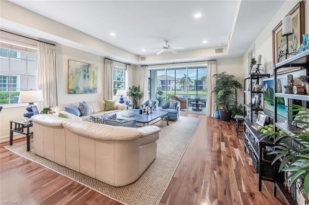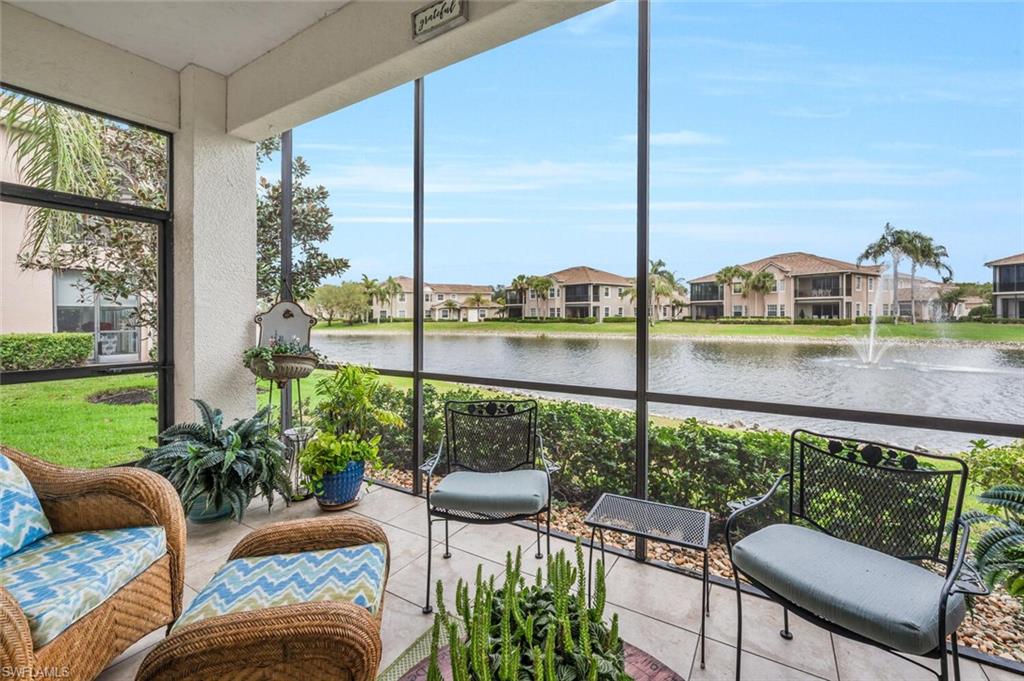 Welcome to this beautifully updated first-floor coach home in sought-after Wellington Place II in the Kensington Community. A rare opportunity to own two incredible units. With the second-floor unit directly above also available for purchase, this unique arrangement provides the perfect opportunity for multi-generational living or rental investment. This spacious residence features a 2-car garage , A multi purpose bonus room, an expansive open-concept design, offering two generously sized bedrooms, a den, a family room, and a separate living room, ensuring ample space for both relaxation and gatherings. The updated, chic kitchen is a standout, complete with an island, breakfast bar, oversized pantry, and a cozy dining nook. The screened lanai offers a peaceful retreat, with sweeping views of a tranquil lake and serene water features, creating the perfect backdrop for relaxation. With its eastern exposure, the lanai is perfectly positioned for picturesque sunrises for those earlier risers! Throughout the living areas, primary bedroom, and den, you'll find stunning American cherry hardwood flooring, adding warmth to the home's design. Resort-style amenities enhance the living experience, including a community pool, spa, exercise room, and clubhouse. The Kensington community is centrally located, offering easy access to all the conveniences you need. The vibrant Mercato is minutes away, with its upscale shopping, dining, and entertainment options. The location also places you close to the stunning Gulf beaches, allowing you to enjoy the best of coastal living.