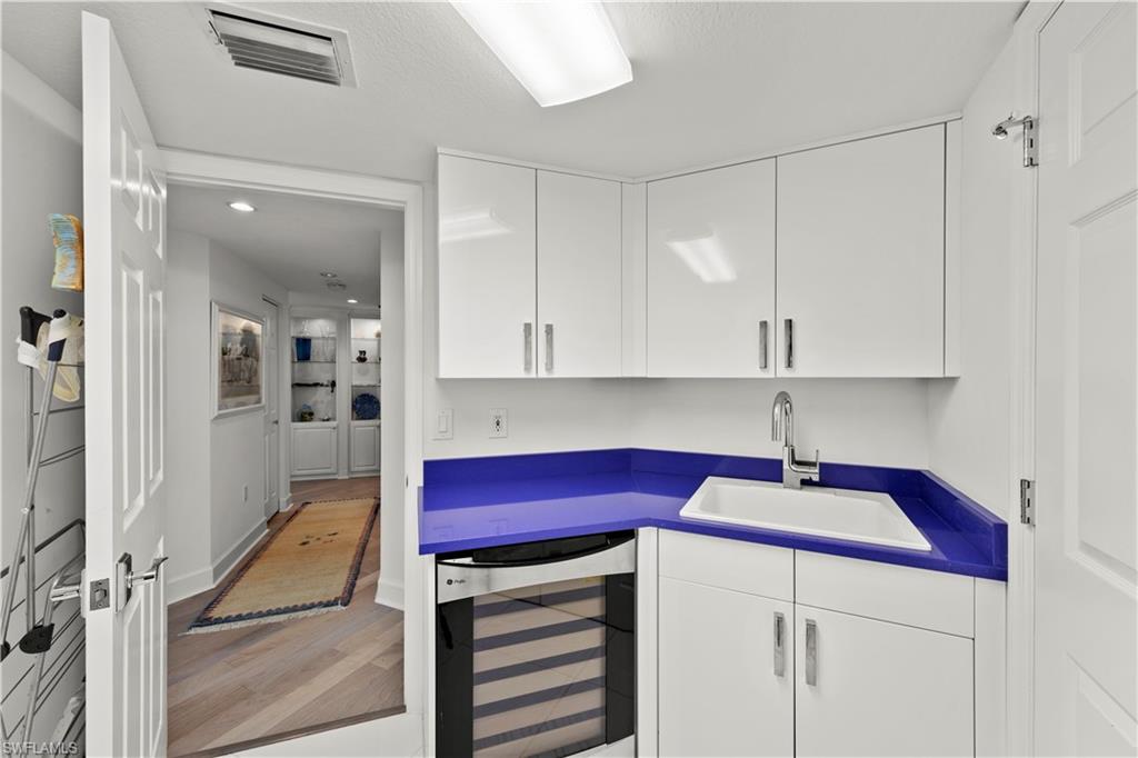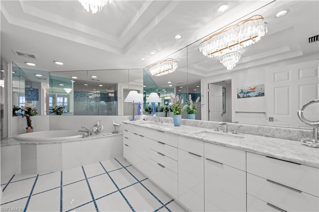 Sanctuary top-floor Golf Village condo, unlike any other! This completely remodeled 2 Bd + Den, 2.5 Bth, 2,800+ sqft residence offers panoramic lake, mangrove, and golf course views that are truly breathtaking. The traditional 2 Bd layout has been transformed by removing the kitchen-living room wall, creating an open, inviting space perfect for entertaining. The kitchen boasts a commercial-grade fridge, induction cooktop, and fridge/freezer/wine chiller drawer. Wood plank tile flows throughout, adding a warm, island-inspired vibe. The primary retreat features large windows with endless views, flooding the space with natural light, and a spa-like bath for ultimate luxury. The guest room includes an ensuite bath and private balcony, ideal for visitors. An enclosed den with curved windows serves as a perfect office or extra sleeping area. The expansive great room opens to a wraparound glass-enclosed lanai, showcasing the Sanctuary’s stunning beauty. Under-building parking and storage add convenience to this exceptional offering.