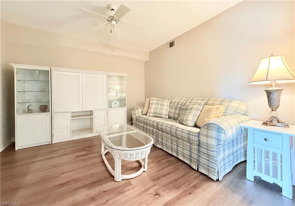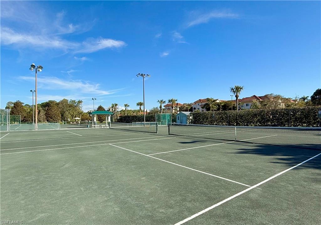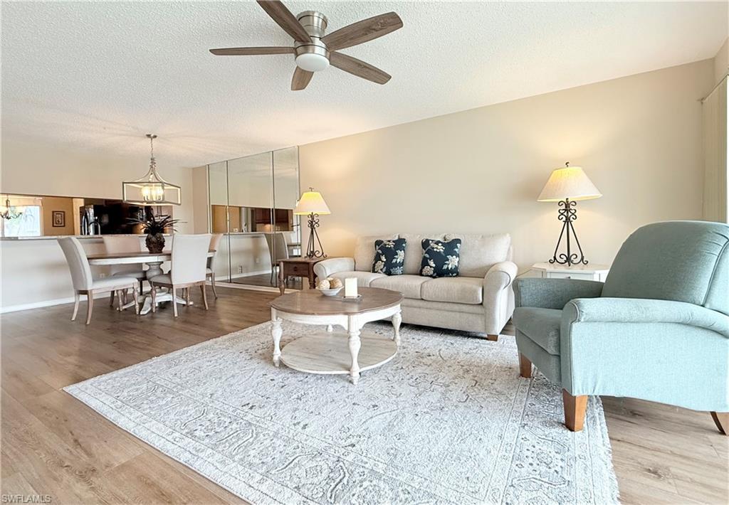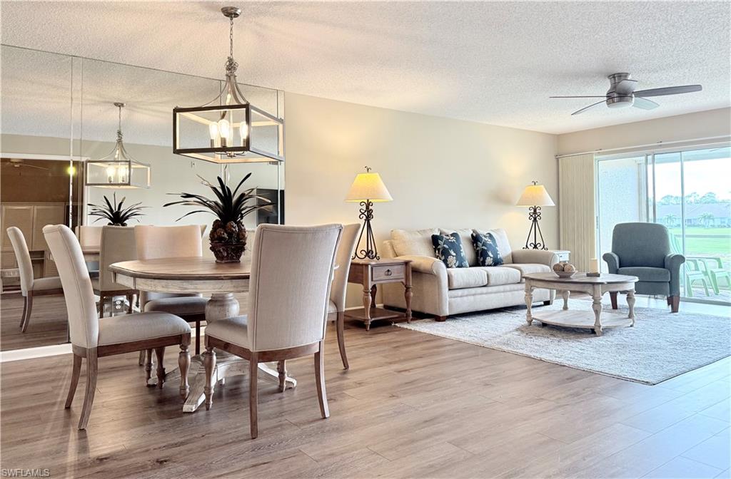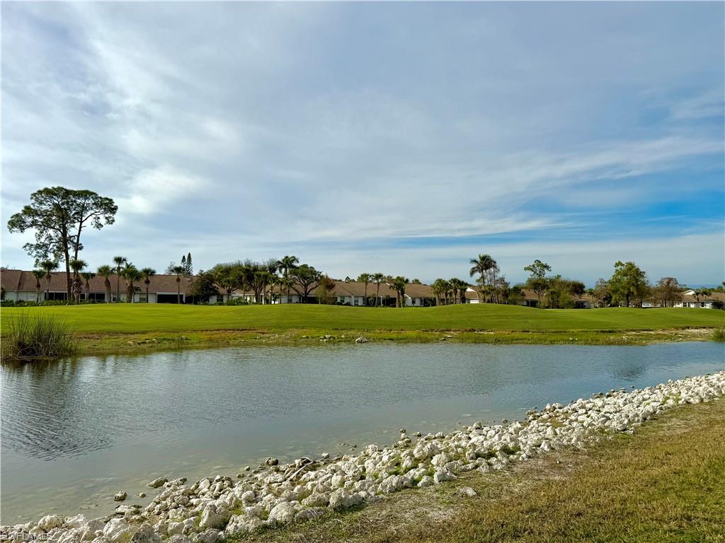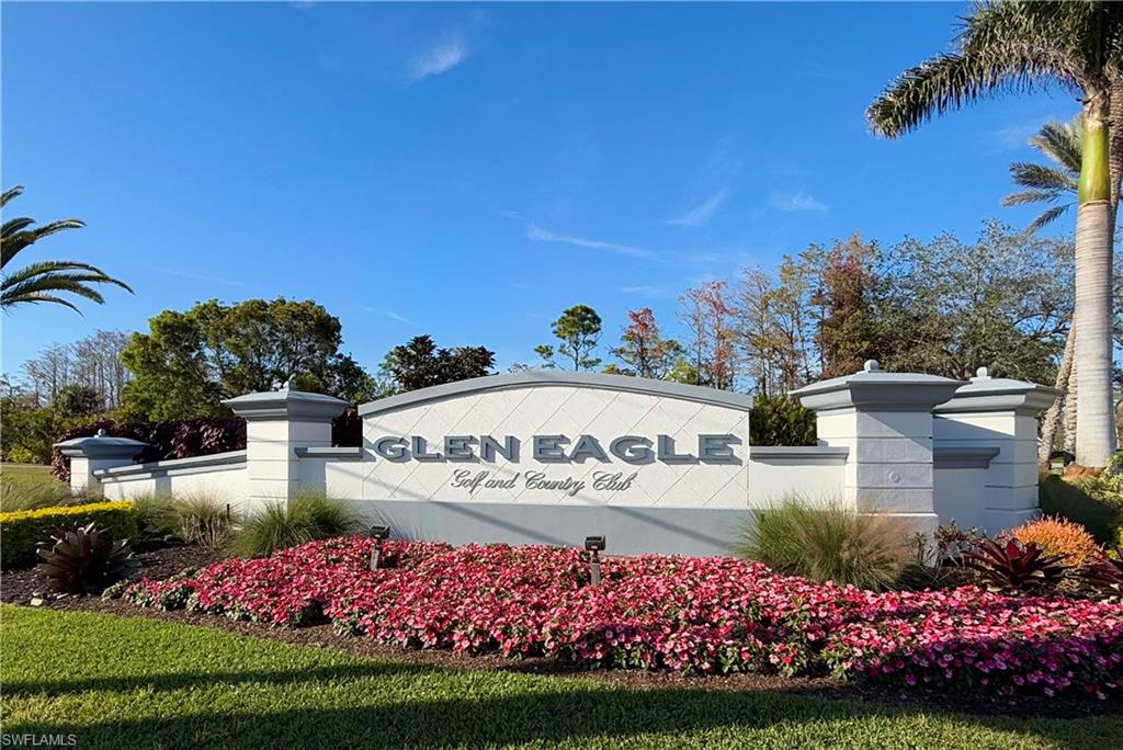 NOW AVAILABLE ... GROUND FLOOR 2BR + Den w/ Garage Condo at Glen Eagle Golf and Country Club. Full golf membership is deeded with property!! Located within walking distance to the clubhouse. Back lanai has highly desired western exposure with view of water and golf. HVAC replaced in 2021. HWH replaced in 2022. Beautiful condo has many updates. Exceptionally cared for by current owner this home is move in ready. Large neutral tiles cover floors in entry, kitchen, hallway and baths. Dining room, den, living room and bedrooms have luxury vinyl plank flooring. Spacious kitchen has updates to include re-faced cabinets, under cabinet lighting and matching appliances. Lighting fixtures and ceilings fans updated in kitchen, dining, living room, primary bedroom, primary bath and guest bath. Dining and living room are open concept with double pocket doors into den. Den is multi purpose room that can be used as 3rd bedroom when needed (has pull out sofa) and/or home office (has built in desk area). Living room opens to back lanai where you'll enjoy relaxing with view of water, golf and sunsets. Primary bedroom is spit from guest bedroom for added privacy. Primary bath is updated and has a large walk in closet. Guest bath has updated vanity and fixtures. Large walk in laundry room offer a large amount of storage space. Current owner hopes new owner will love as much as she did. Its more than a home, it's a lifestyle. Glen Eagle offers its residents an 18 hole golf course, clubhouse with indoor and outdoor dining options, fitness center, tennis courts, pickleball courts, indoor golf simulator, community pool and bocce ball. With a very active social calendar you will always have activities to enjoy with current friends while meeting new friends. Glen Eagle is located just minutes for downtown Naples and beaches.
