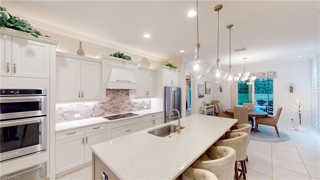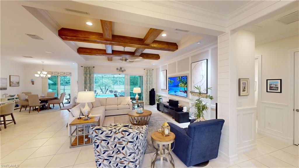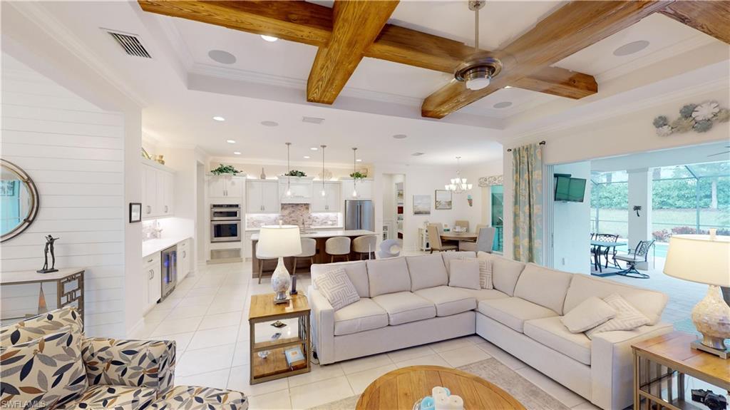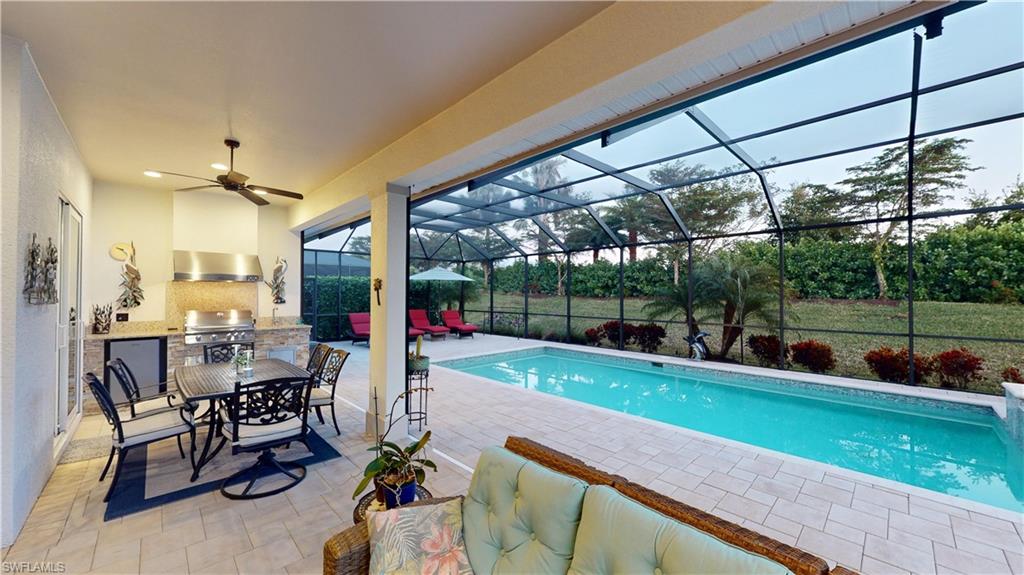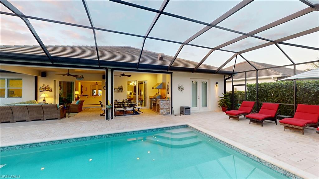 This stunning 2020 Stock Construction (Siesta III Floorplan) home is bursting with luxurious upgrades. The centerpiece of the backyard is a magnificent custom heated salt-water pool, perfect for year-round enjoyment. Inside, the kitchen dazzles with elegant under & above cabinet lighting and beautiful glass tile backsplash that complements the gleaming quartz countertops. The master suite is a true retreat, featuring a generous walk-in closet, a beautifully designed bathroom with double sinks, a relaxing separate tub, and a lavish walk-in tile frameless shower enclosure that adds a spa-like elegance. You'll find high-impact-resistant windows throughout the home, providing safety and energy efficiency, along with a Reme Halo UV light integrated into the A/C system for improved air quality. Attention to detail is evident with custom handmade wainscoting and exquisite crown molding accentuating the living spaces. Additionally, plantation shutters adorn the windows, adding a classic touch, while modern conveniences such as an alarm system, and in-ceiling surround sound in the great room enhance your lifestyle. The garage is a functional and comfortable space featuring a wall-mounted ductless air conditioner, insulated garage door, insulated ceiling, and well-organized wall cabinets. The exterior is beautifully landscaped with screening shrubs and trees that provide privacy. You'll also appreciate the peace of mind offered by the 24 kW whole-house Generac generator, connected to a sizable 500-gallon propane tank. The outdoor kitchen, crafted by SWFL Kitchens, is perfect for entertaining guests, while Storm Smart hurricane shutters protect your home. Custom-designed cypress ceiling beams in the great room lend a warm, rustic charm, and ceiling fans and crown moldings can be found throughout the home. Don't forget the convenience of a 48-bottle under-cabinet wine refrigerator to keep your favorite drinks perfectly chilled. Living in Naples Reserve means immersing yourself in natural beauty, exploring (22) lakes, and enjoying miles of scenic bike and walking trails alongside a picturesque 1-mile rowing lane. The community provides security with a manned guard gate. It offers fantastic amenities, including The Island Club, The Outrigger for hosting events, a fully equipped fitness center, and a resort-style pool with lap lanes. Enjoy refreshments at the cafe or tiki bar, relax on the beach with volleyball, and enjoy the pickleball courts, tennis courts, and bocce ball area. Furthermore, there are two dog parks and a dedicated playground.